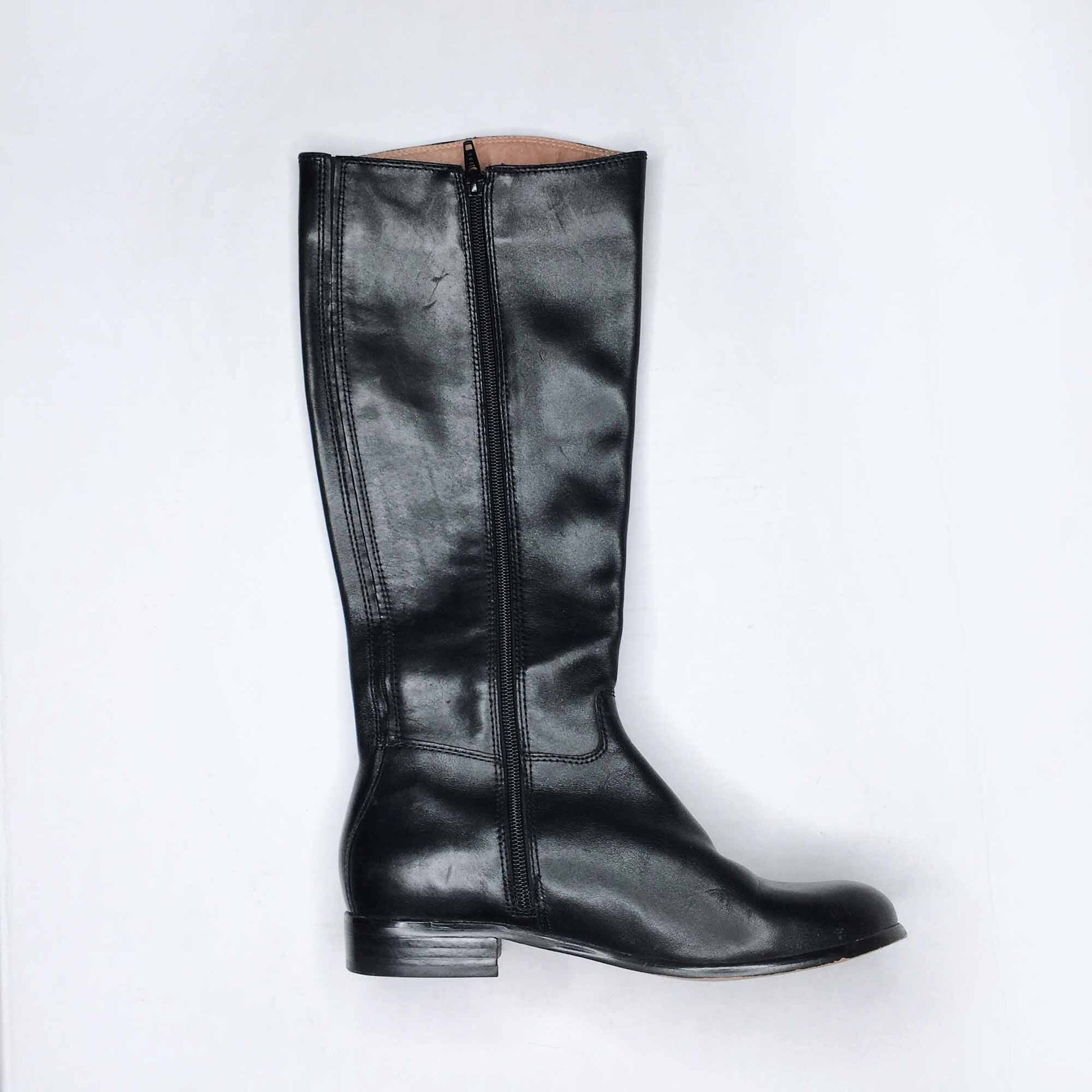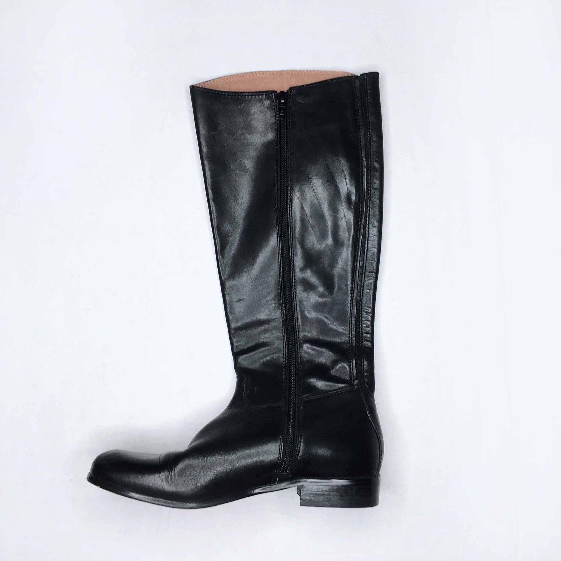 Item Description: These classic tall black leather riding boots from Corso Como feature a stacked heel and full side zip closure. 100% leather upper and sole
