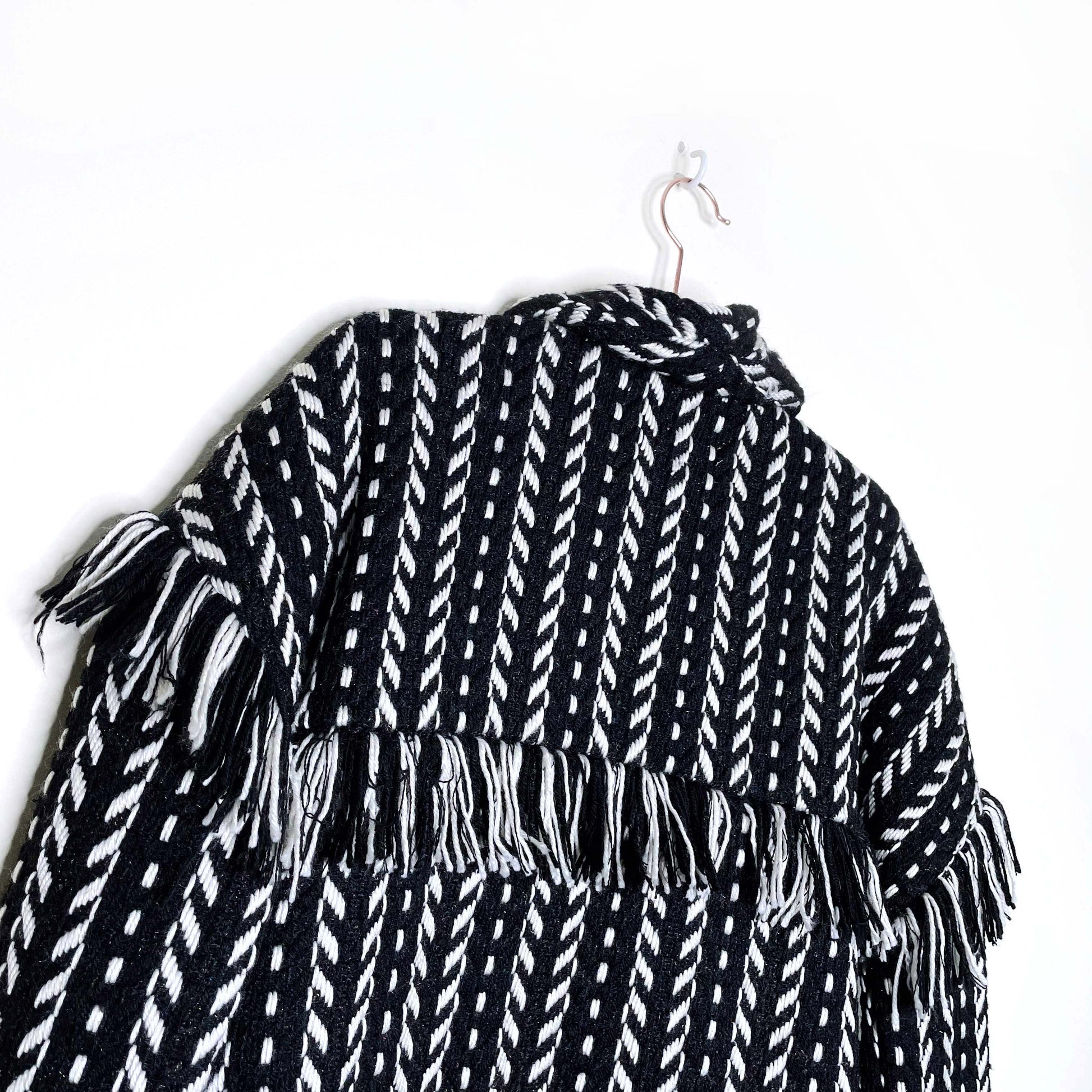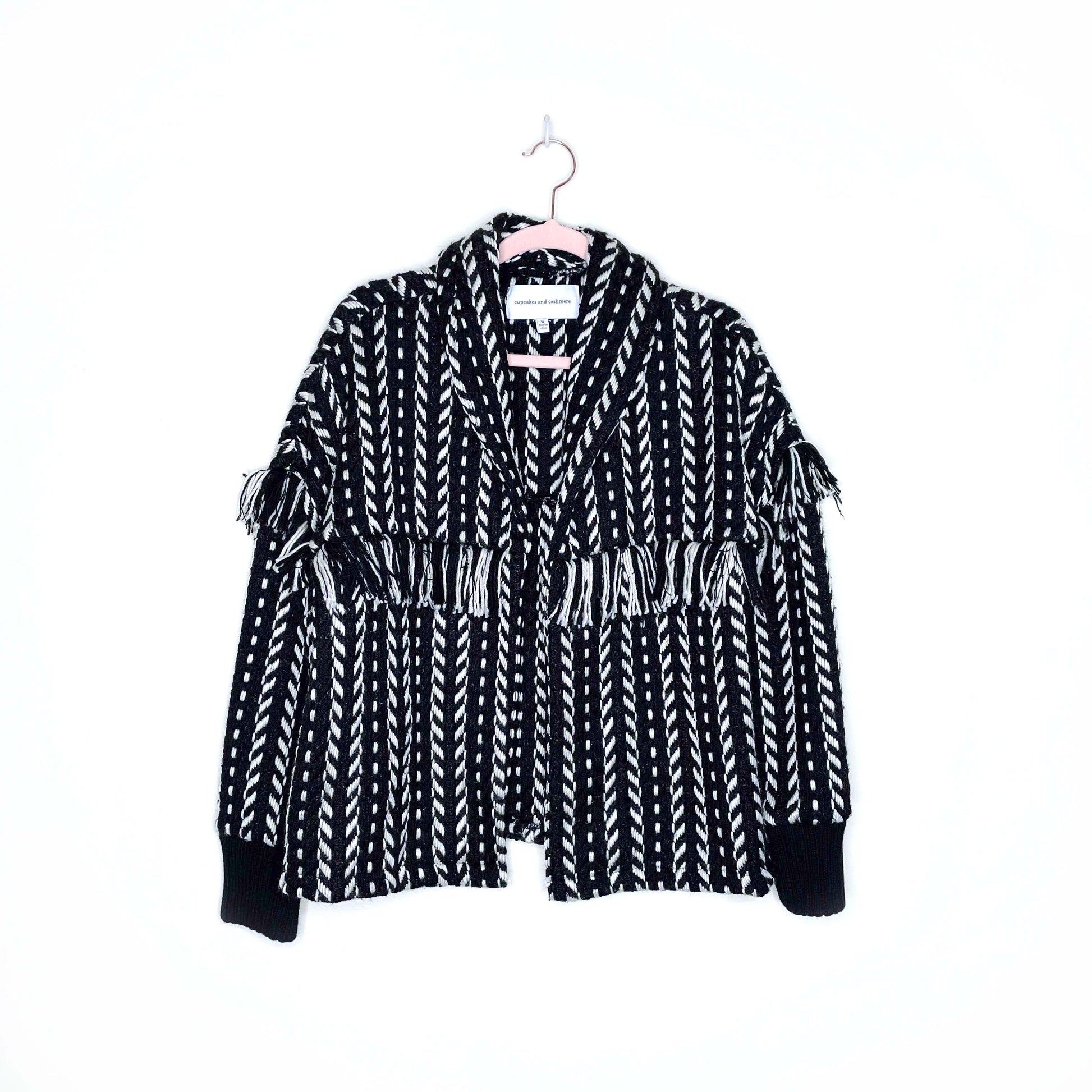 Item Description: This knit jacket from Cupcakes and Cashmere features a woven tweed design with fringe detail, an open front and knit cuffs. 80% polyester 20% acrylic