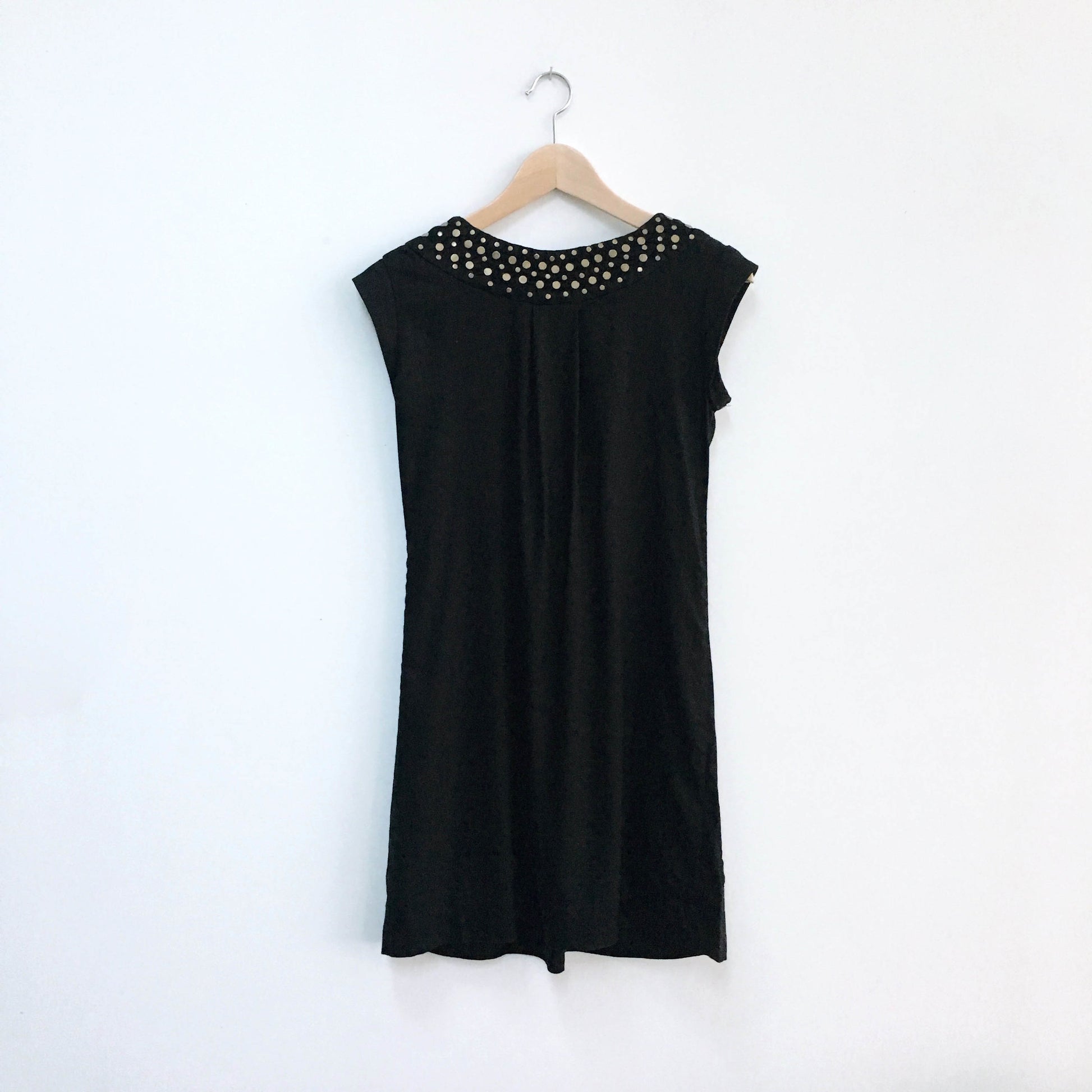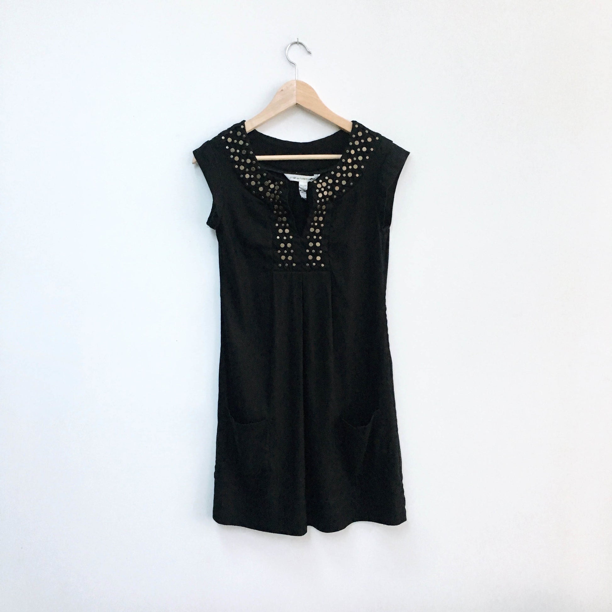 Item Description: The blend of this DVF dress gives it a beautiful drape. It features mini cap sleeves, two front pockets and beautiful metal beadwork around the neckline area. 95% linen 5% elastane