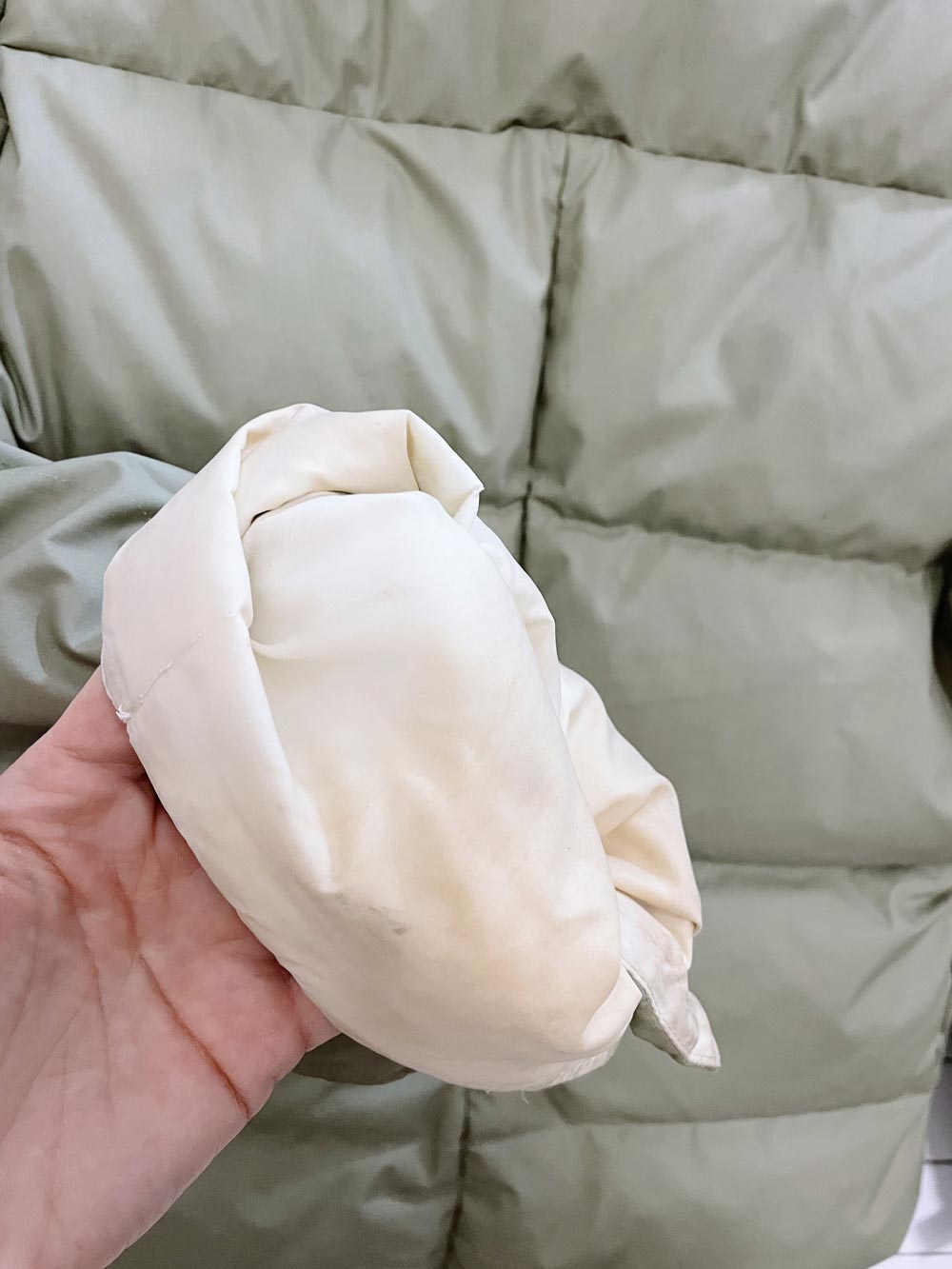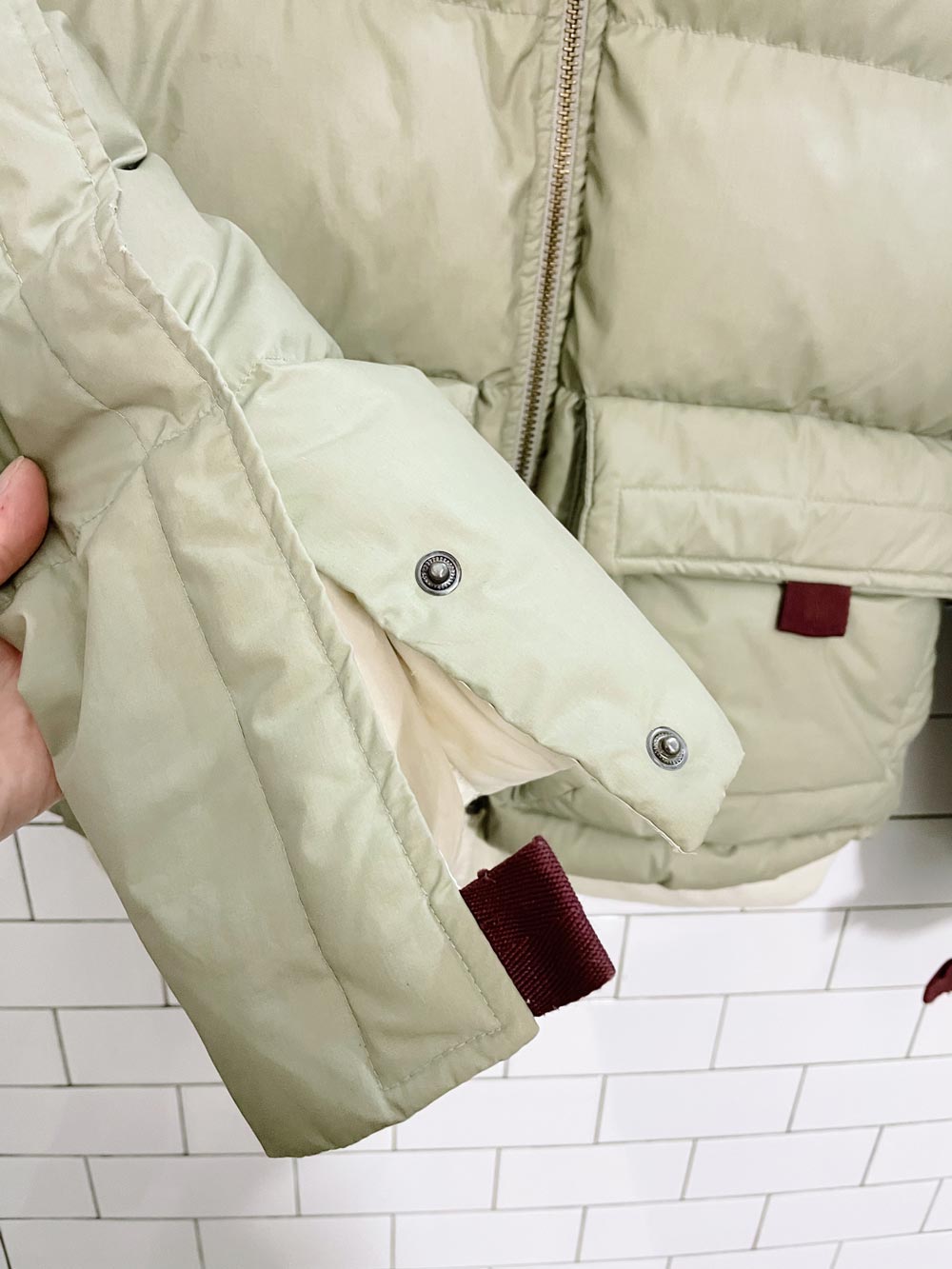Discolouration on inside sleeves and exterior seam was taken in when we found this, but has been taken out to restore to full, wide sleeve glory. Some stitch holes remain but will disappear slowly with wear.