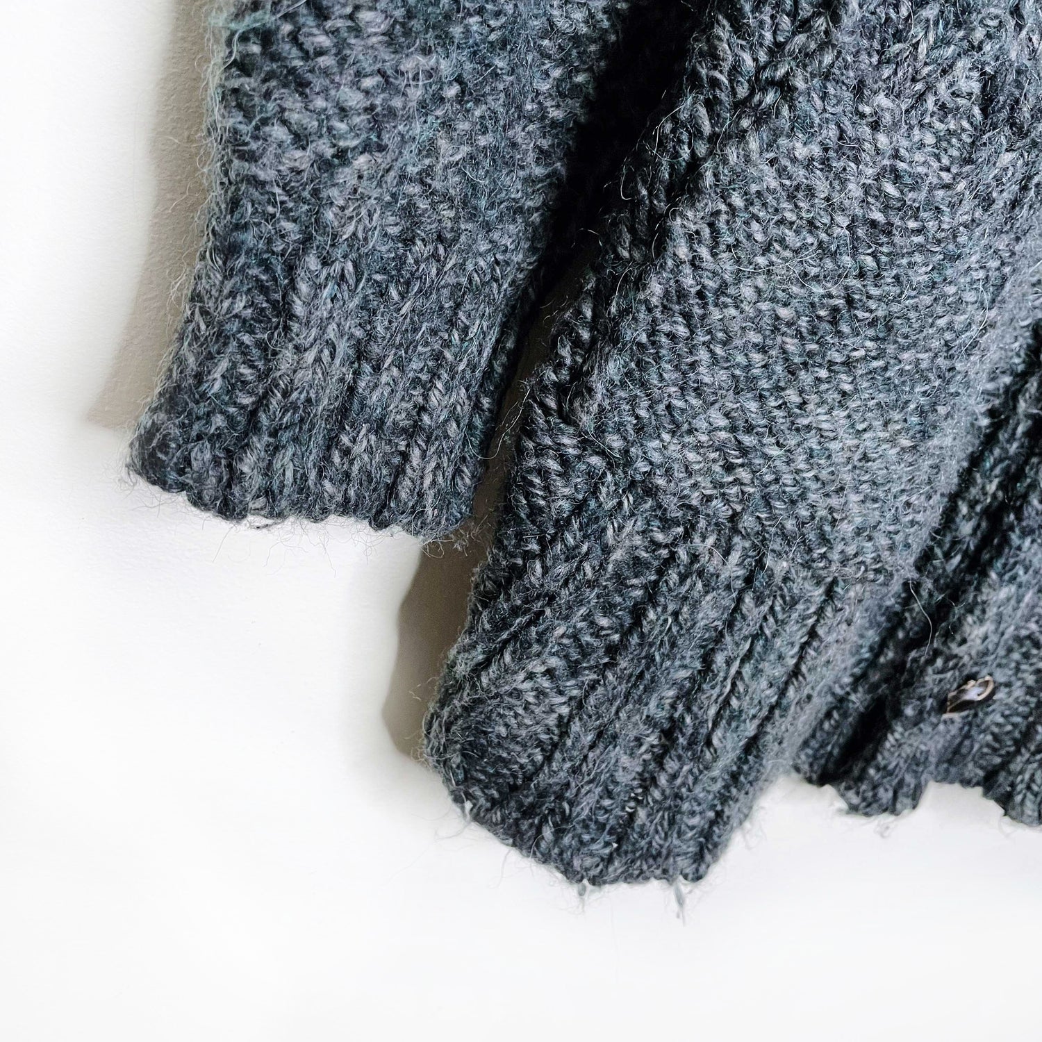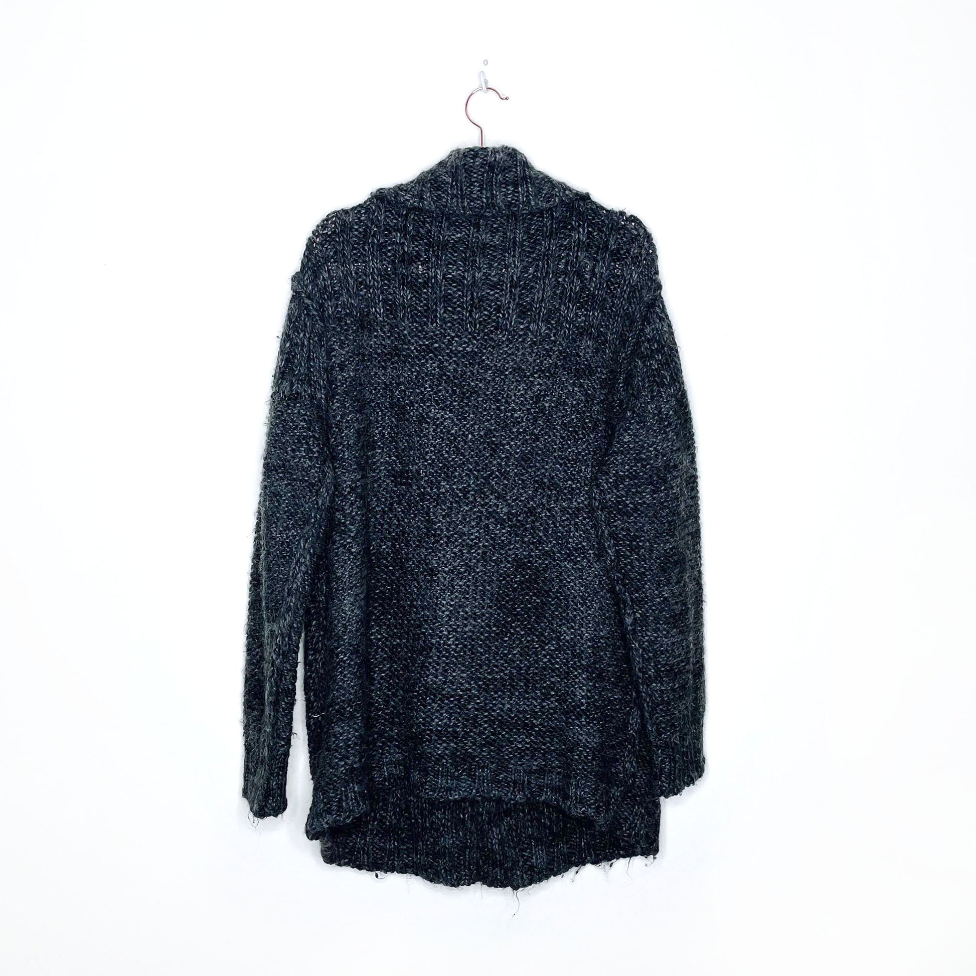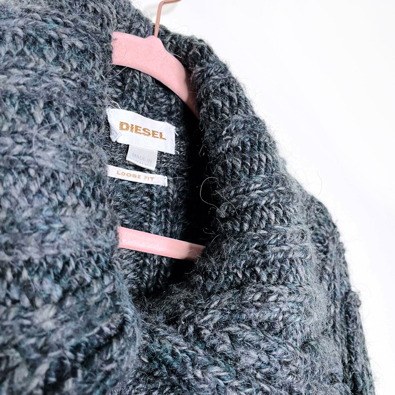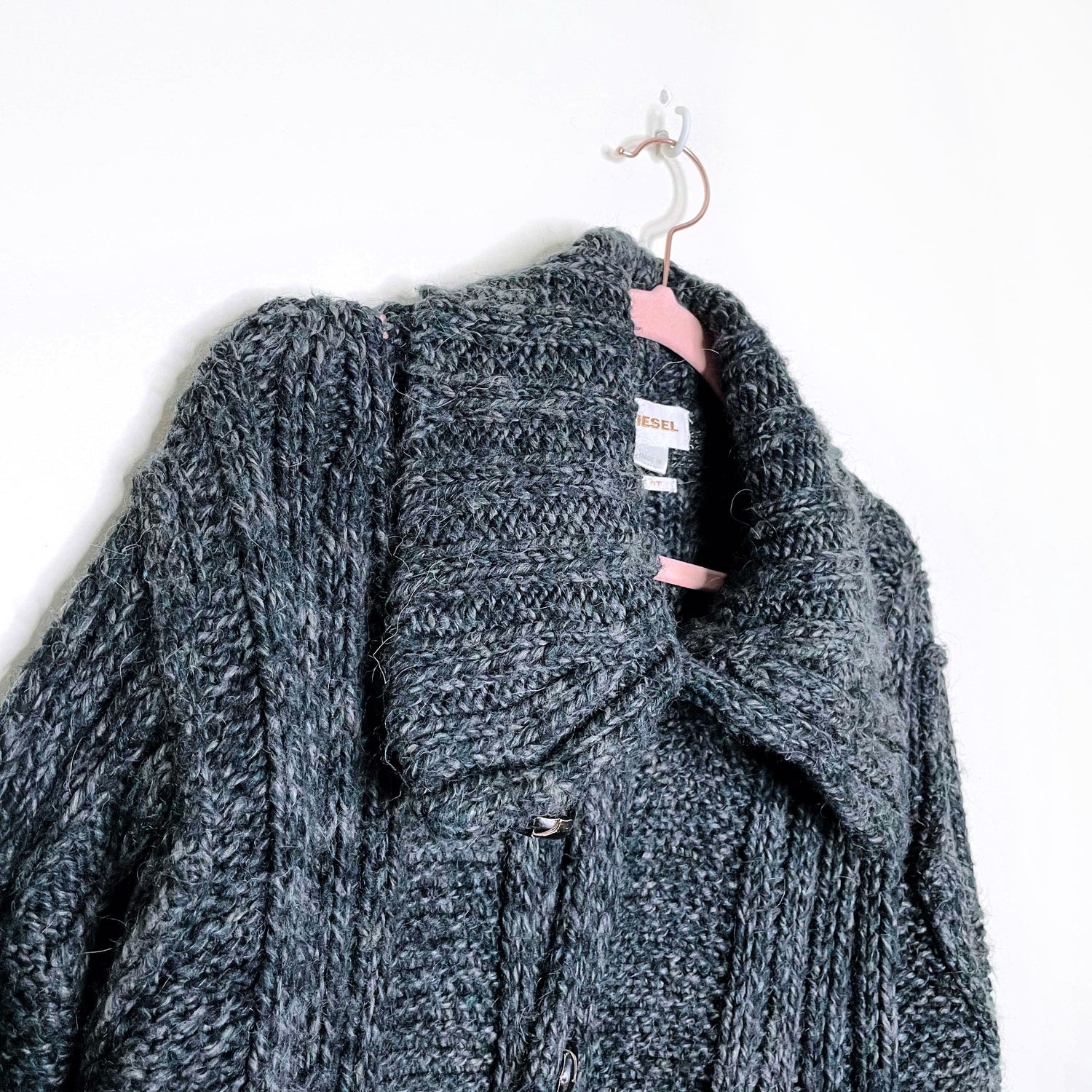 Item Description: This soft, oversized, chunky cardigan sweater from Diesel features a vertical ribbed knit design on the chest, front well pockets and a button-up cowl neck with leather button closure. "Loose-fit". 75% acrylic 15% wool 10% alpaca