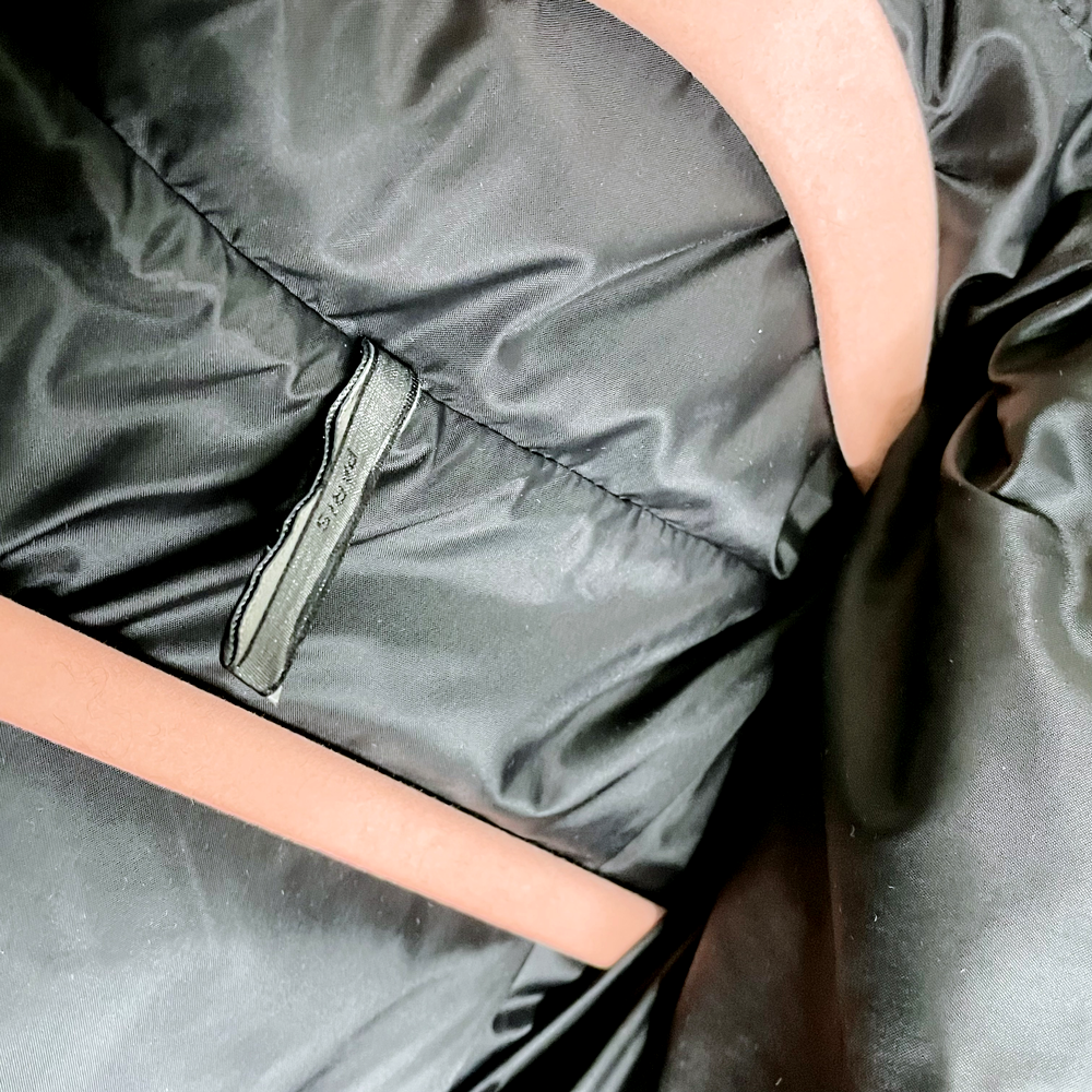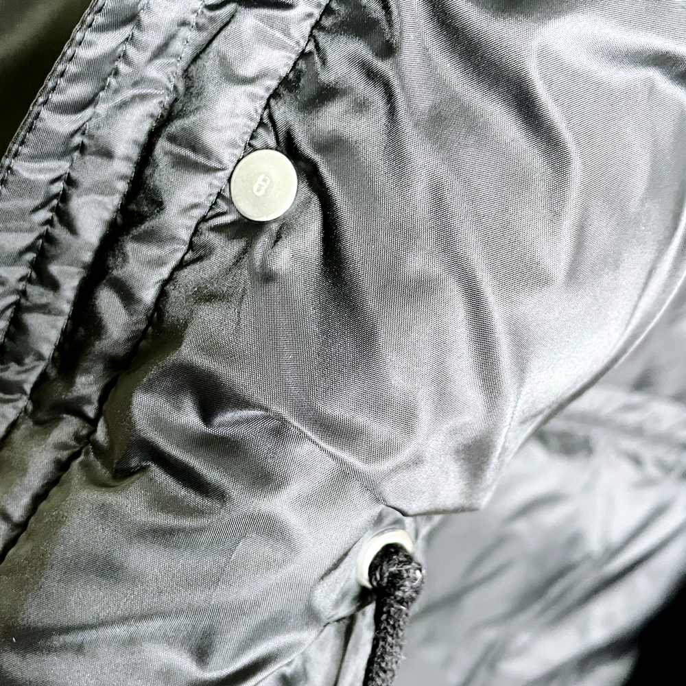 Item Description: This utility style puffer jacket from Dior Homme features double cargo pocket front with jersey gussets, removable hood with jersey lining, stretch ribbed jersey cuffs and an interior drawstring waist. Logo zipper pulls and button backs. Interior pocket. 100% polyamide shell 100% cotton trim (jersey) 100% goose feather down fill
