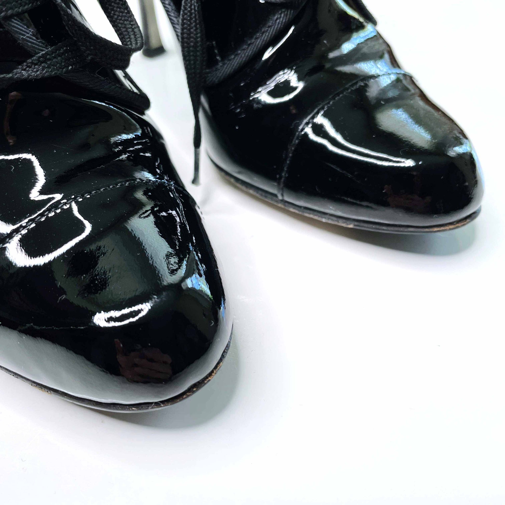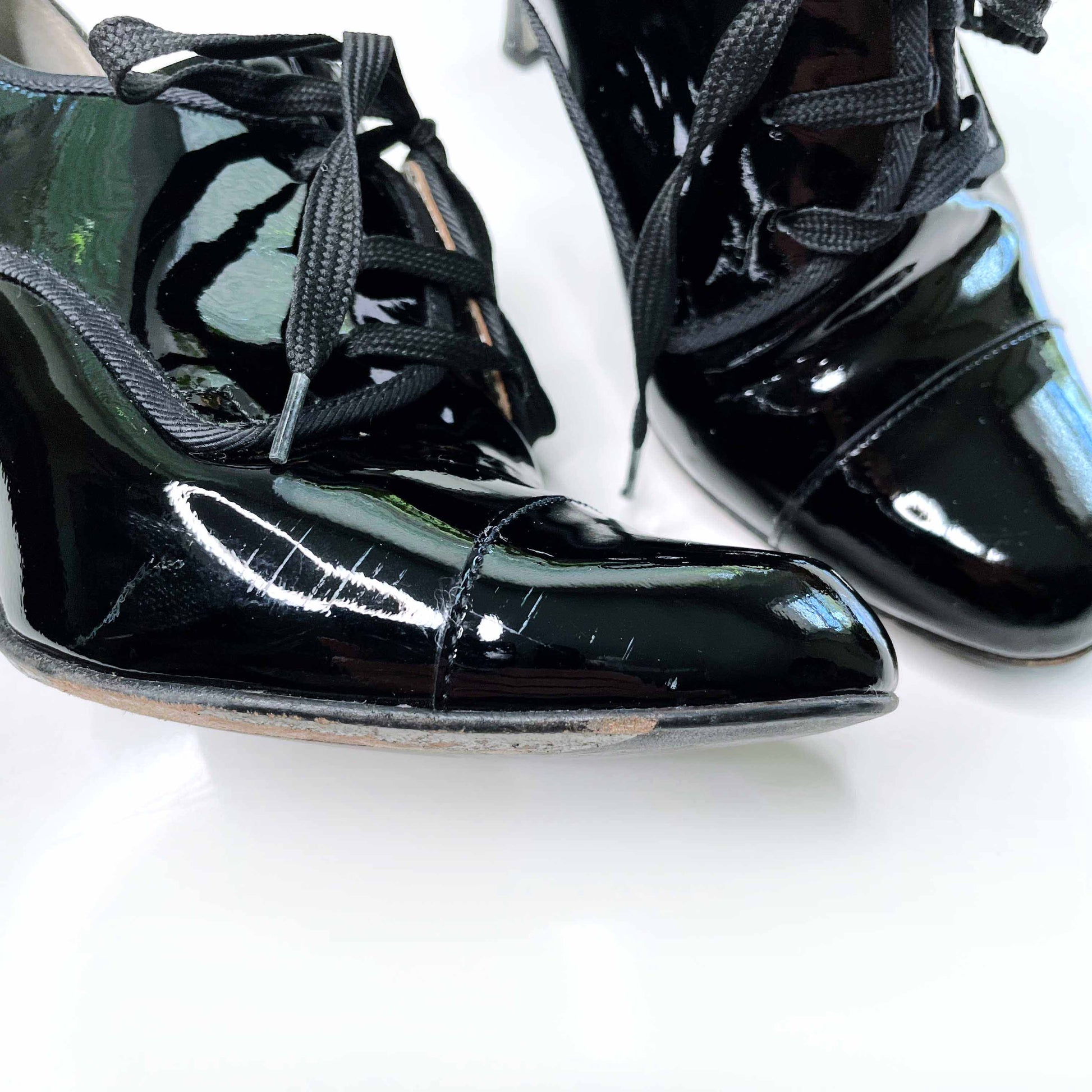 Item Description: These smoldering black lace up loafer-style heels from Dolce & Gabbana feature a patent leather shell, thick lace closure and elegantly thin heel. 100% leather