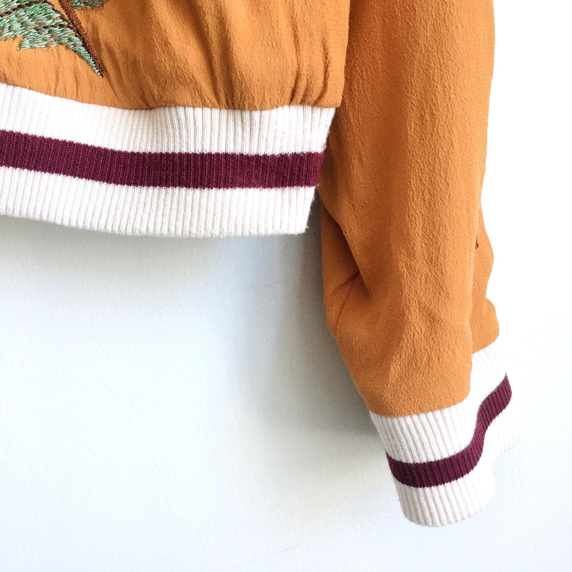 Item Description: This golden solstice bomber jacket from Elevenses features beautiful floral embroidery, striped varsity knit collar and cuffs and pink satin lining. 100% viscose shell, 100% polyester lining