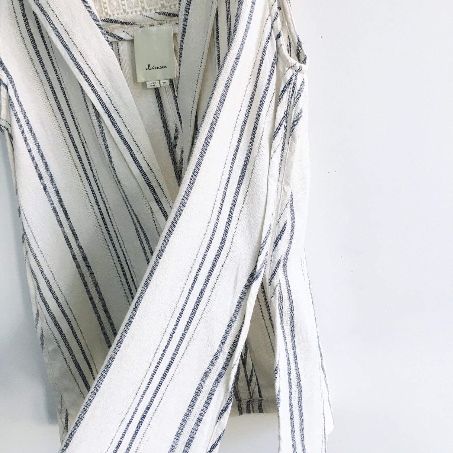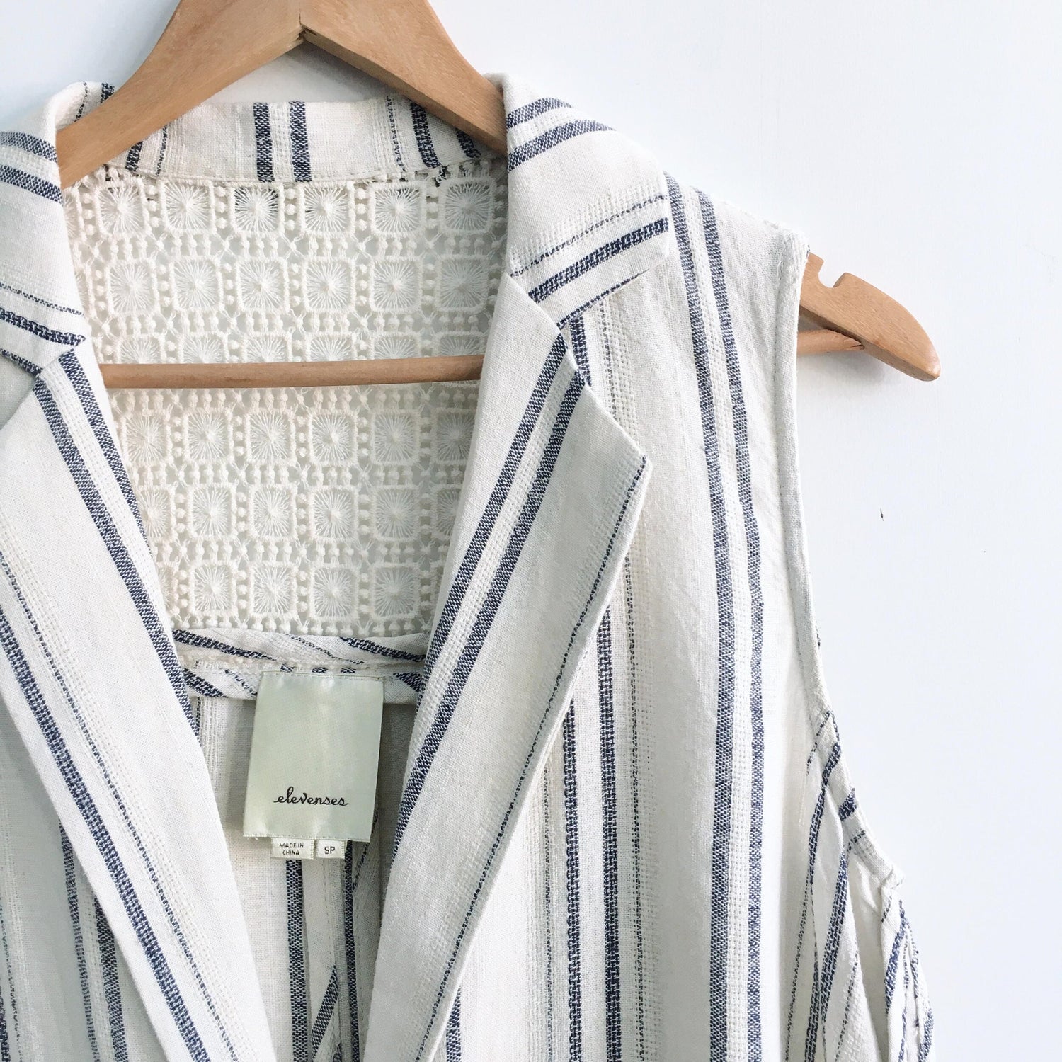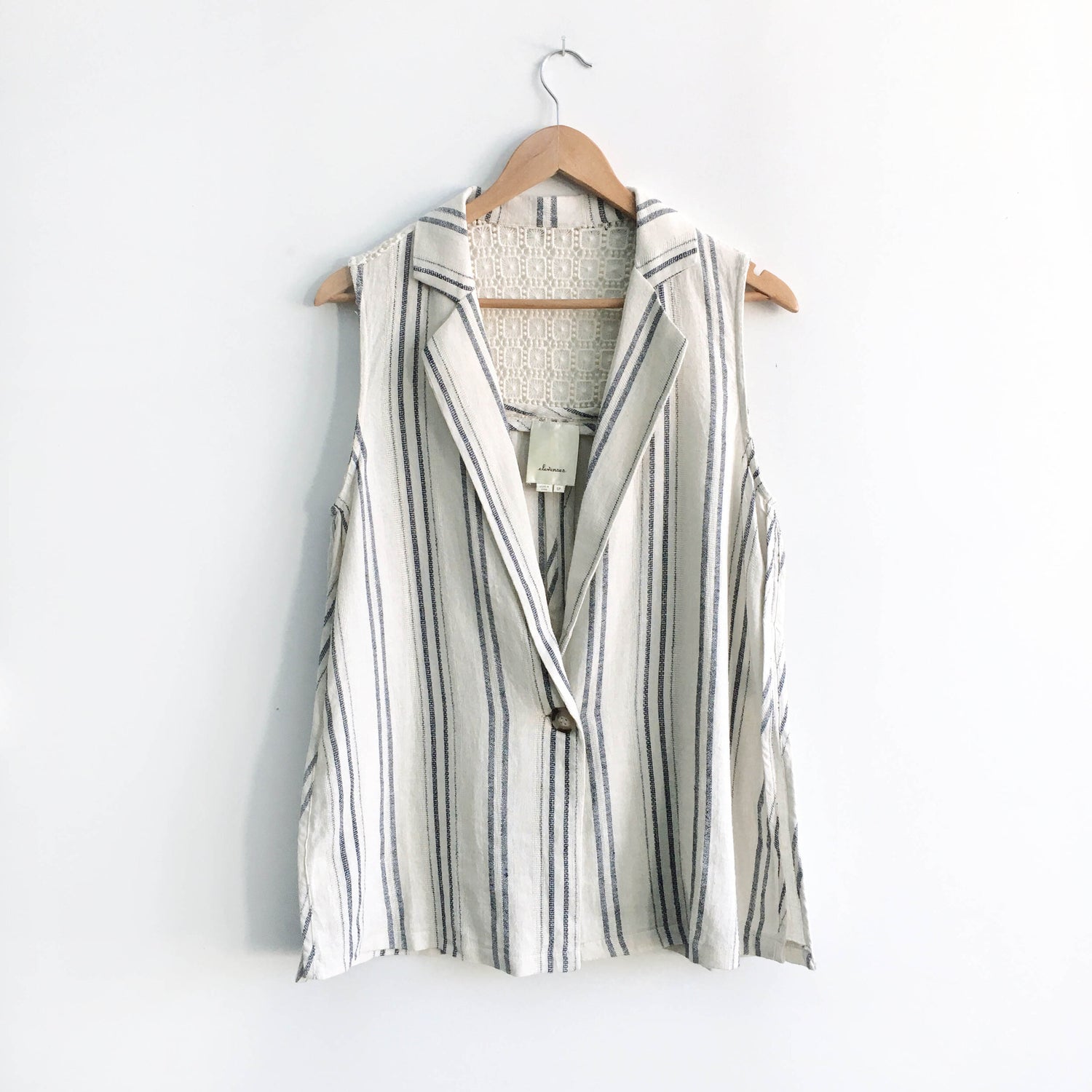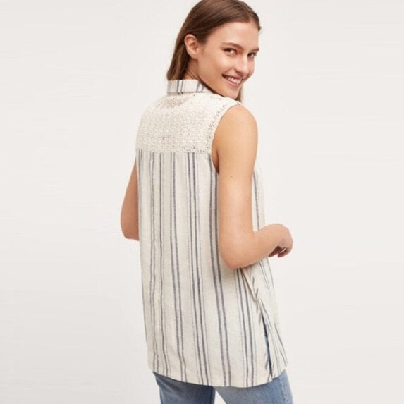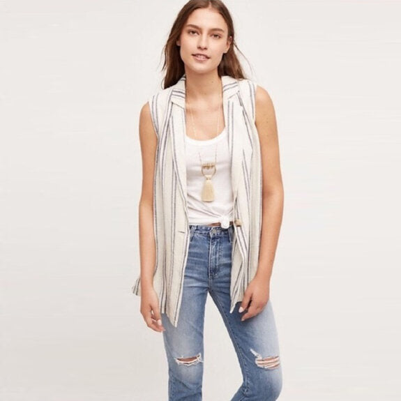 Item Description: I love the way Anthropologie has casually paired this linen vest with a tank and ripped jeans. But I think you can easily dress it up as well with a midi skirt. Striped linen vest with crochet/lace upper back detail and single button closure. 55% linen 45% cotton