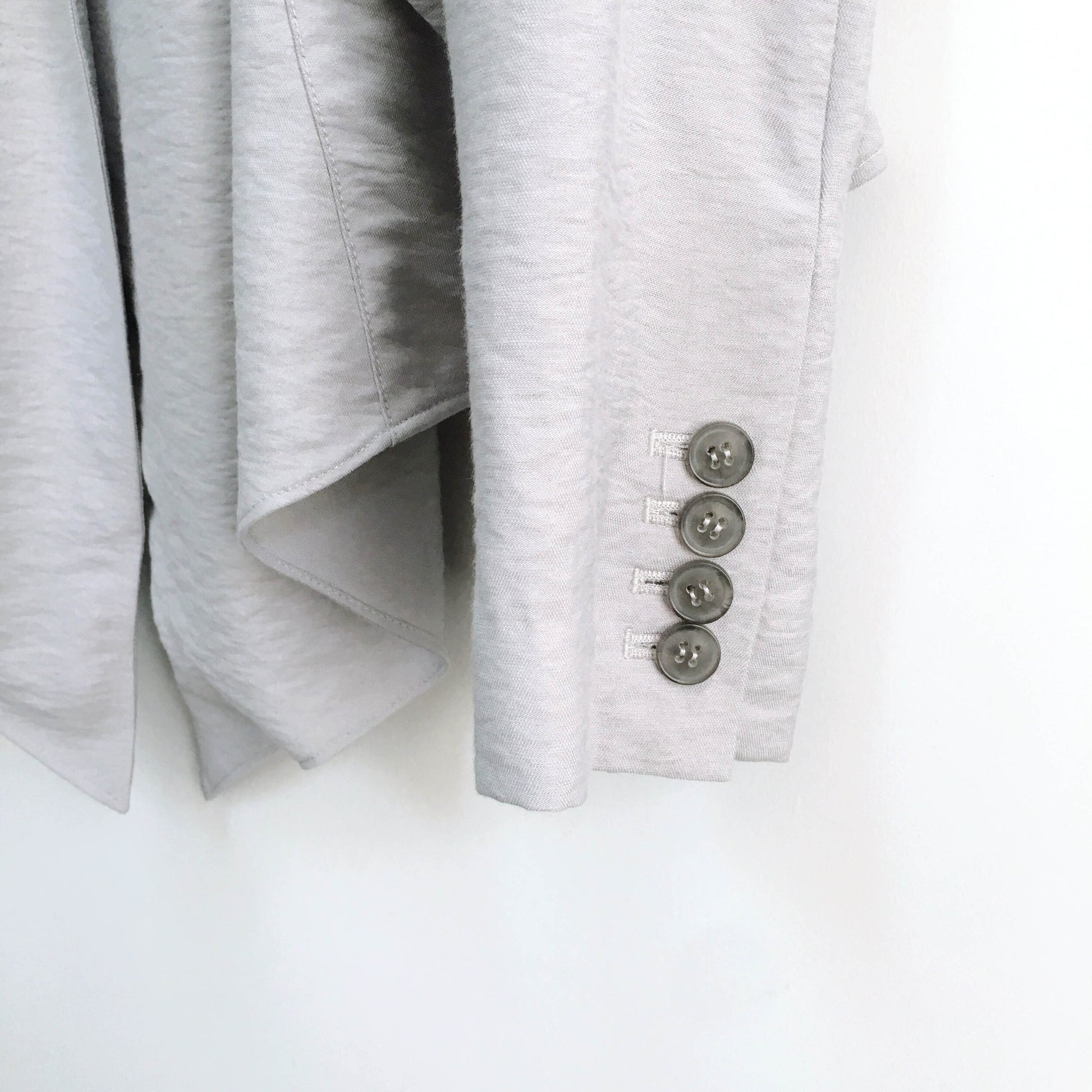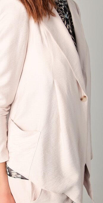 Item Description: A peaked hem elongates the beautifully draped front of a tailored, single-button blazer with slouchy side pockets. 90% rayon 10% nylon lining 100% polyester
