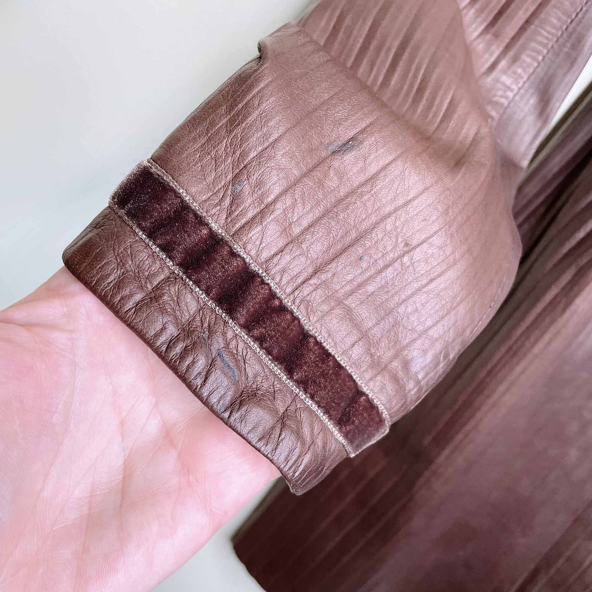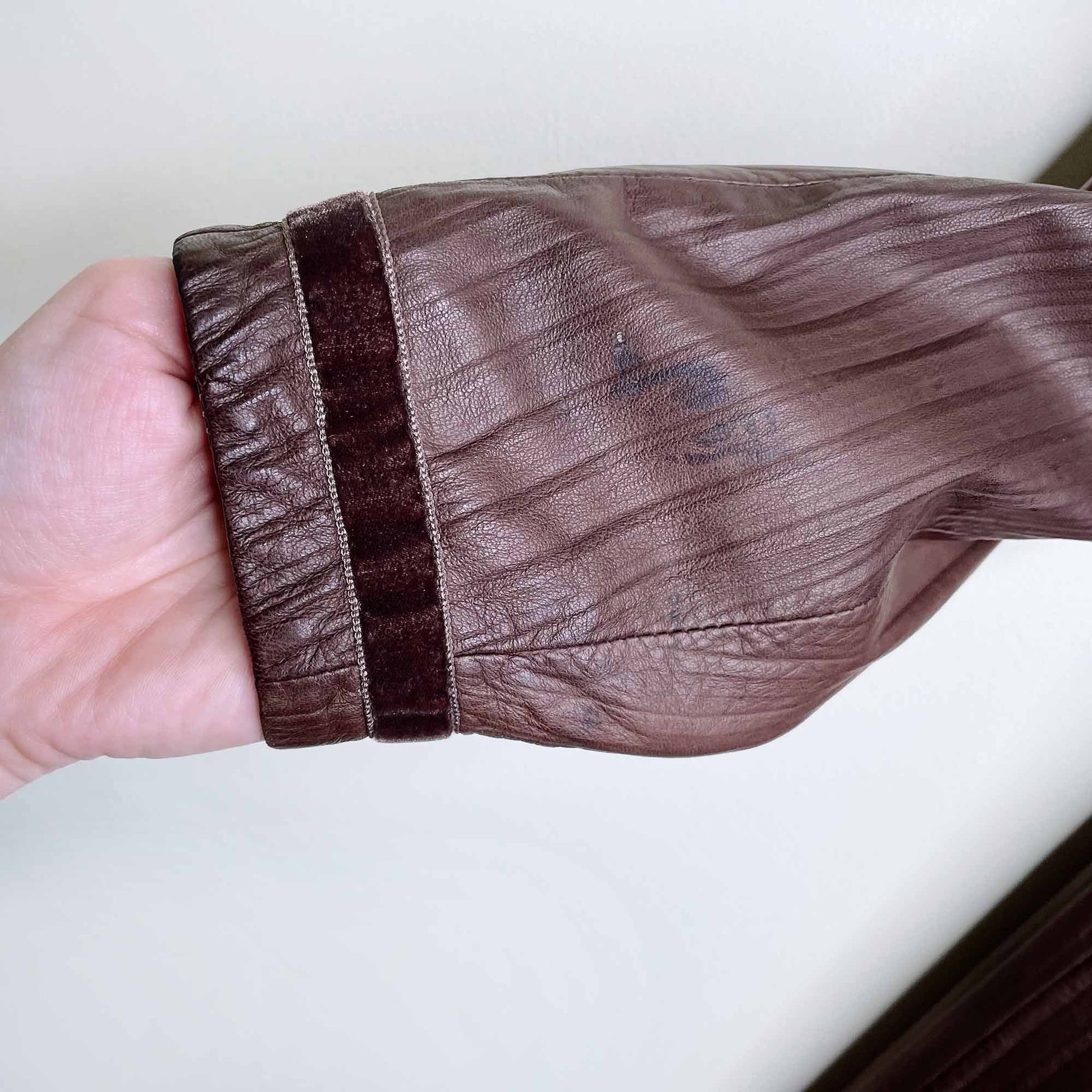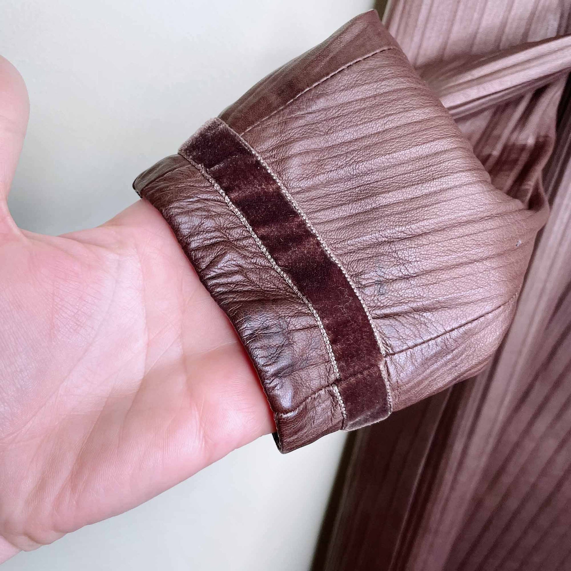 emanuel ungaro long brown leather jacket with velvet trim - size xs/sm