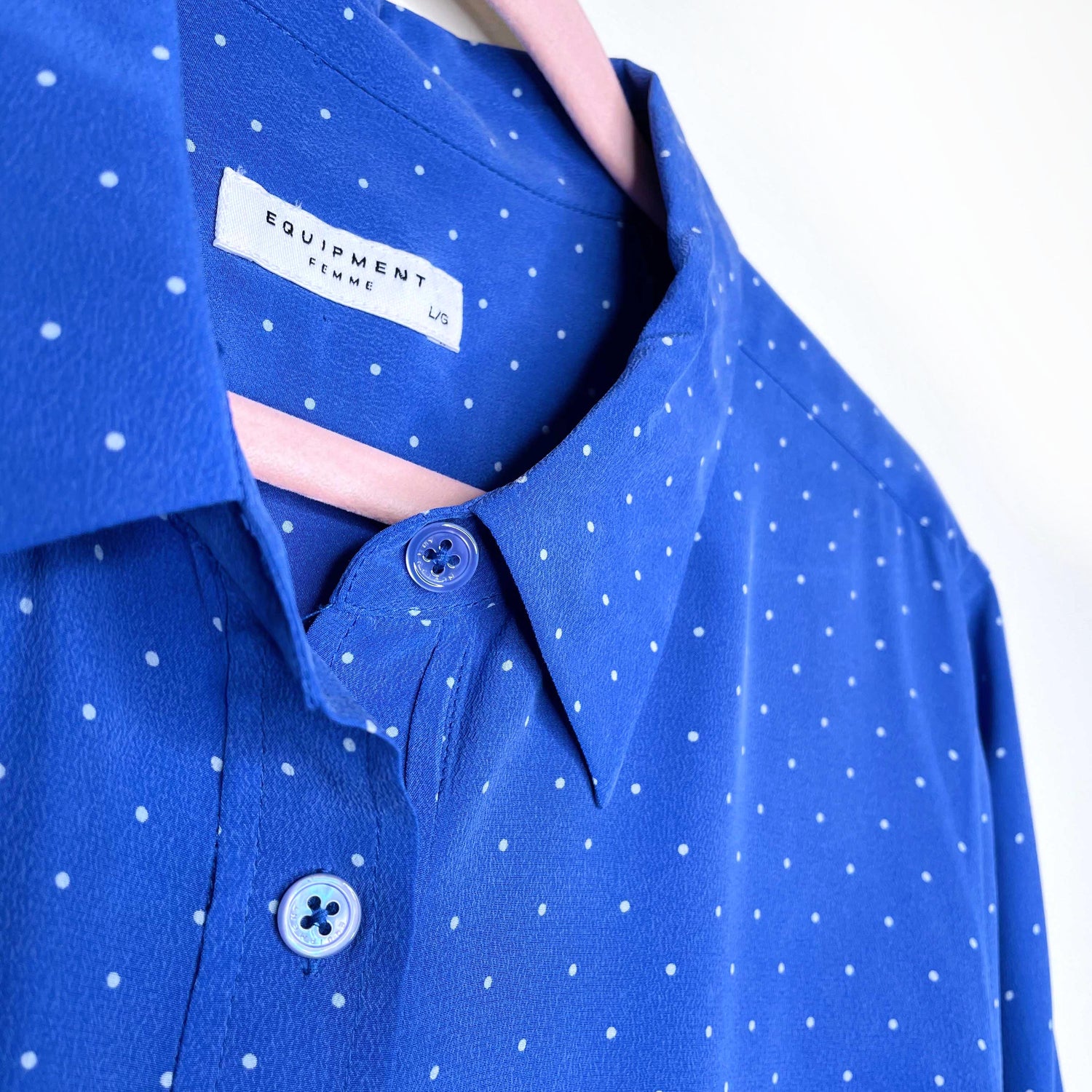 Item Description: This lovely blue silk shirt dress from Equipment features a white micro dot print, button down front, long sleeves and front pockets. 100% silk