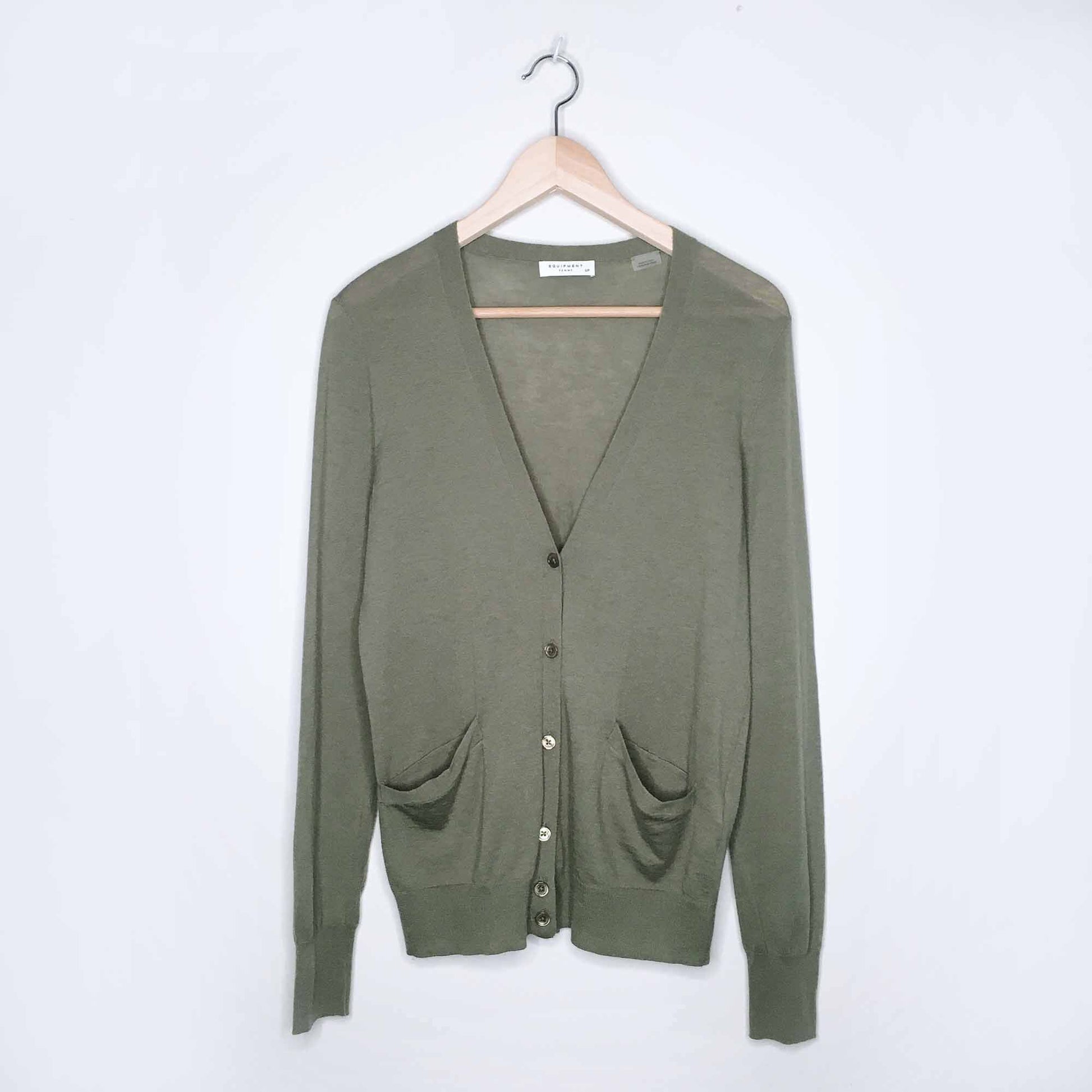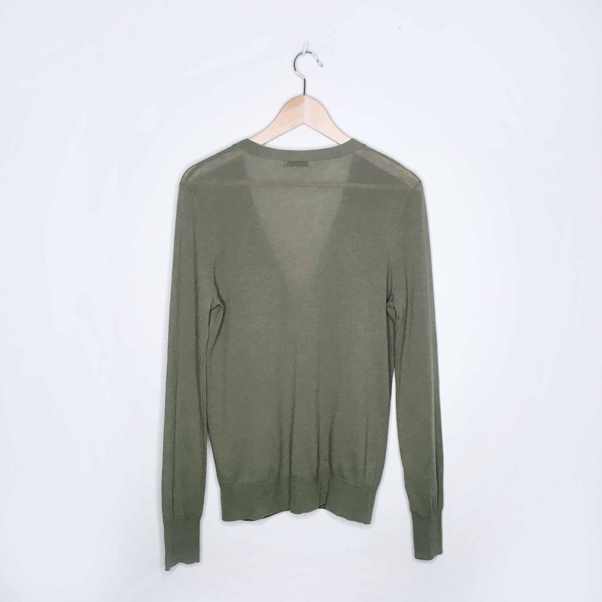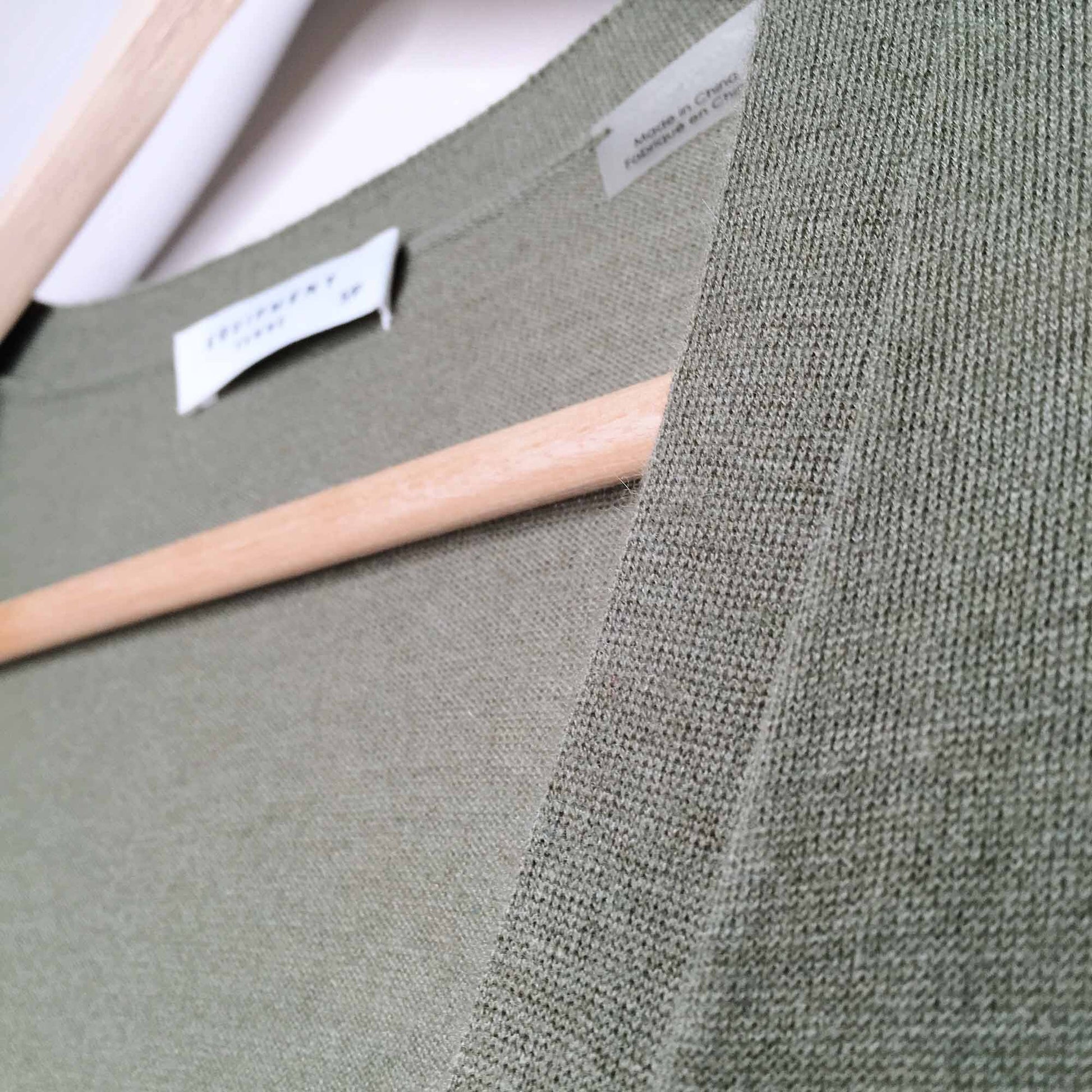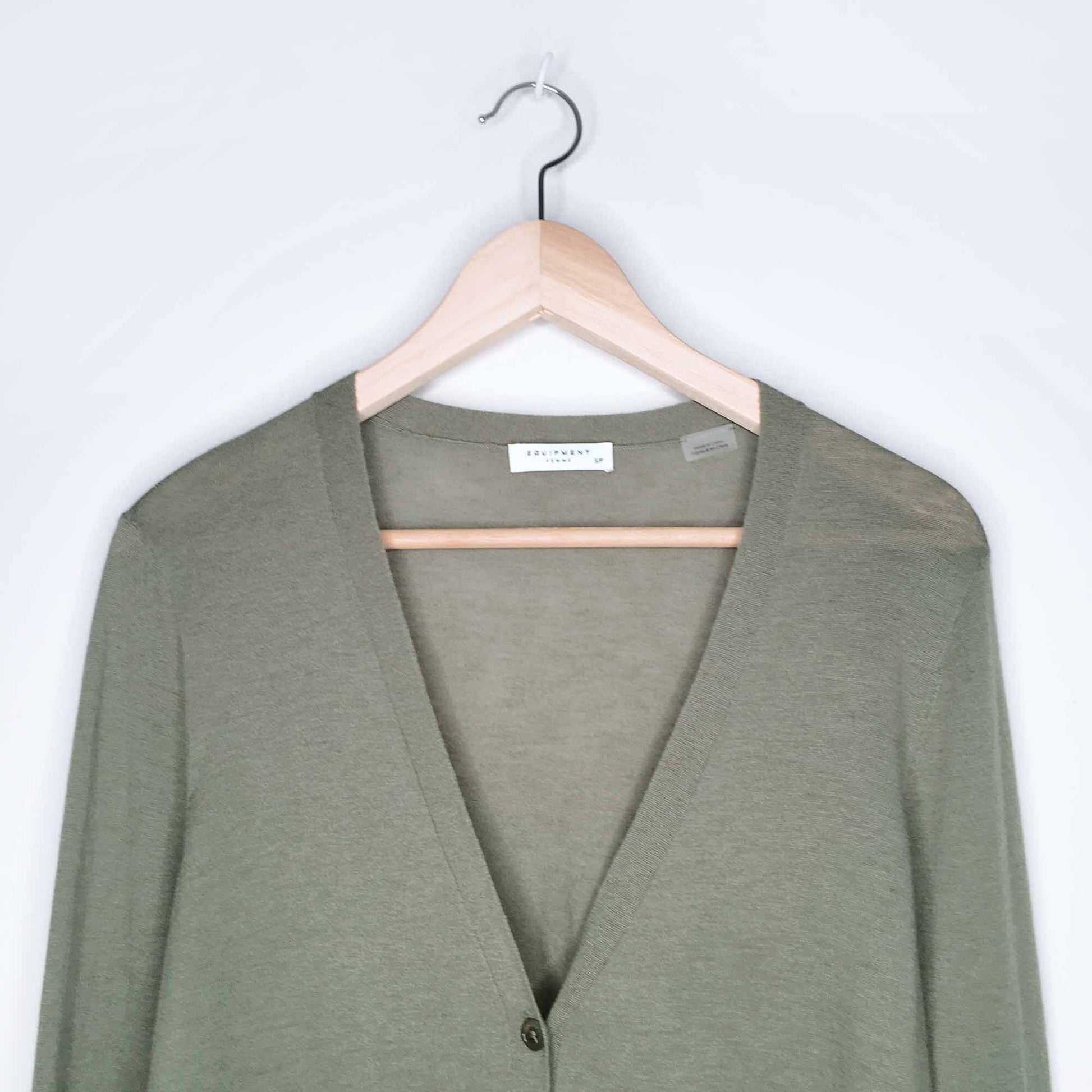 Item Description: This lightweight ultra soft sweater from Equipment is a beautiful blend of wool and cashmere, in a lovely olive green. 60% wool 35% polyester 5% cashmere