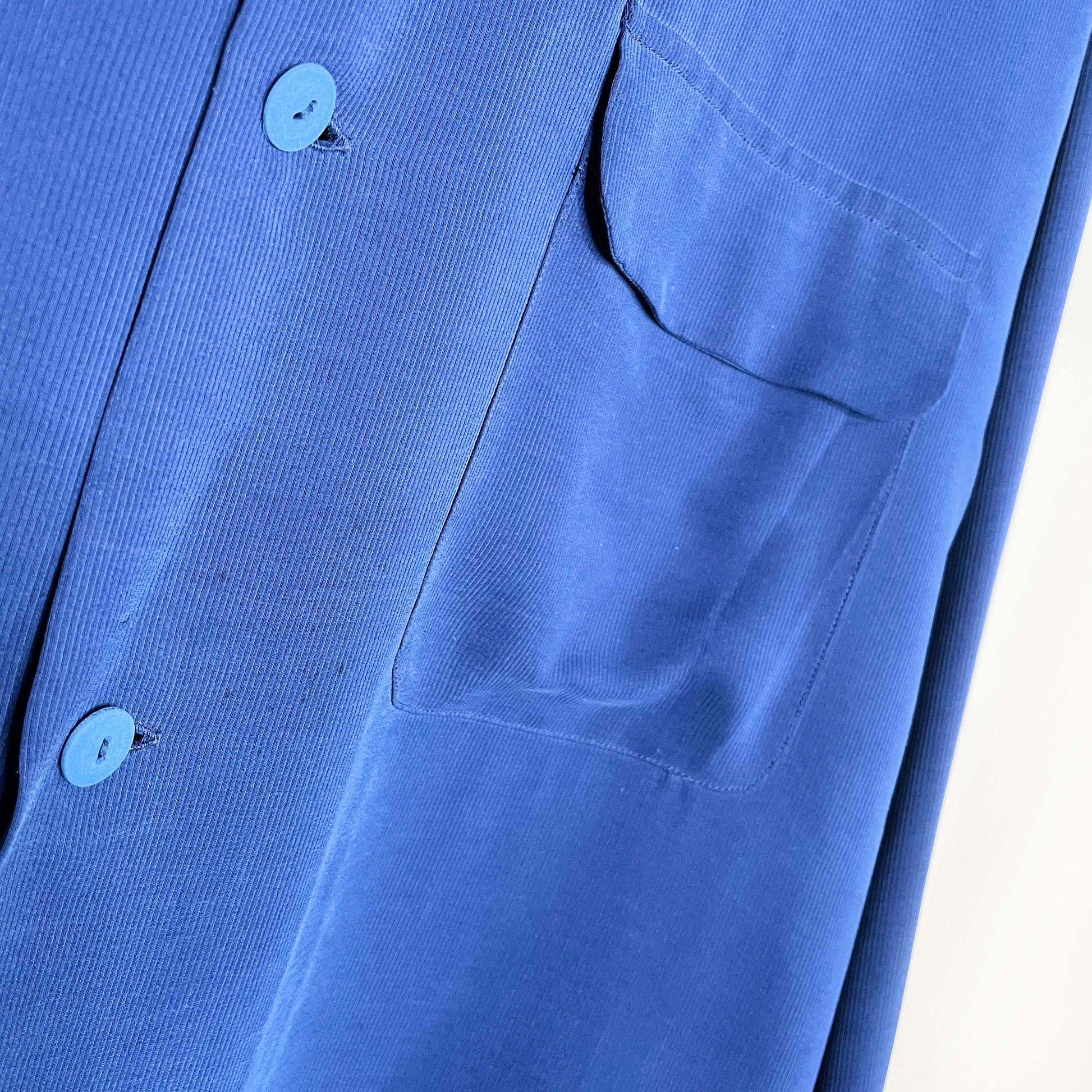 Item Description: This gender neutral silk shirt from Equipement features a ribbed texture in a striking blue with front flap pockets. 100% silk