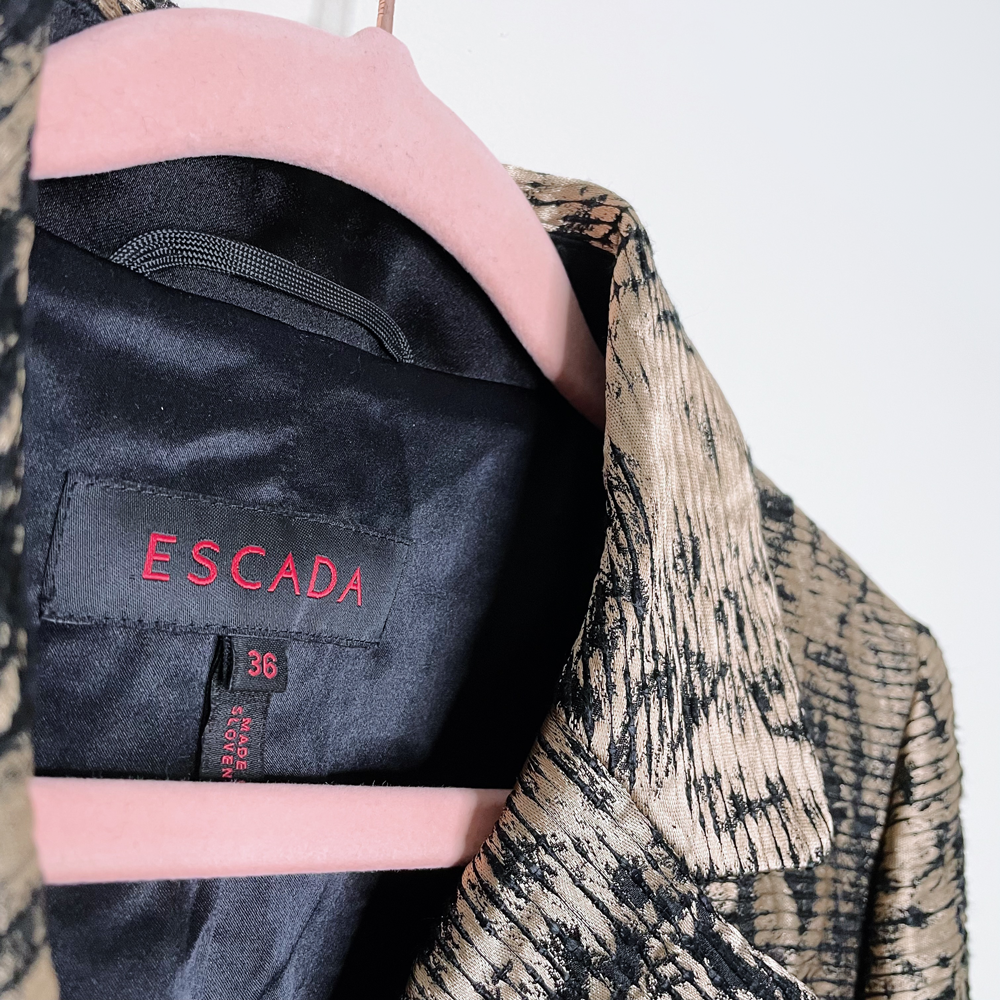 Item Description: This hot-hot-hot blazer from Escada features an all over distressed gold brocade with logo printed double button closure, front flap pockets and a notch lapel. Pair with leather pants (leggings or jogger style) for a spicy look, or add a denim button down to take it down a notch.