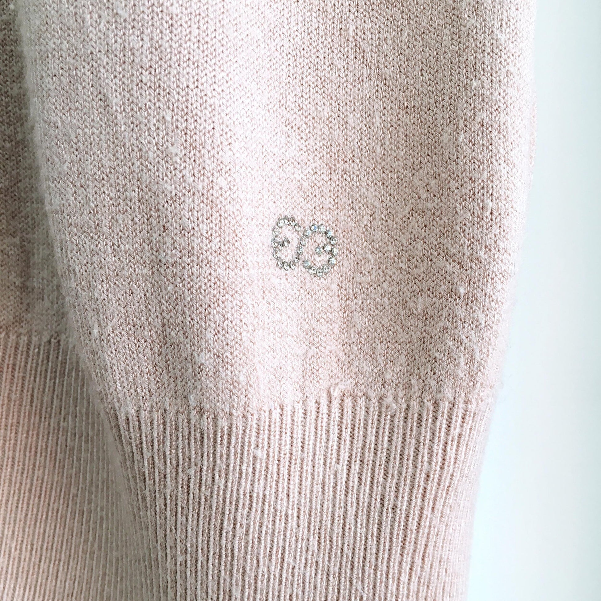 Item Description: This stretch knit pullover crewneck from Escada sport is set in a pretty blush pink, and features button sleeves and crystal monogram logo on hip. 96% viscose 4% polyester