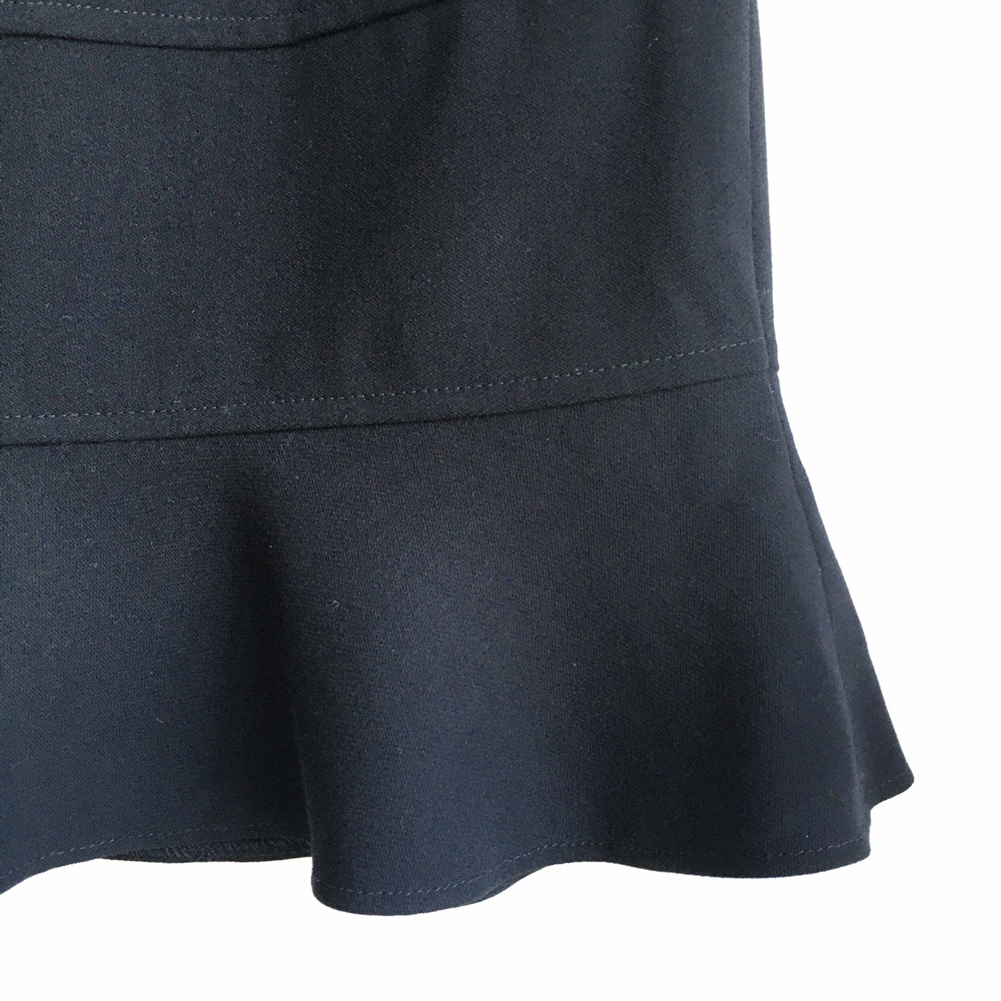 Item Description: This skirt has a peplum hem that moves so elegantly when you walk. Cut to mid-short length from virgin wool, it sits high at the waist to accentuate a feminine profile. Side zip and button closure. 100% pure new virgin wool