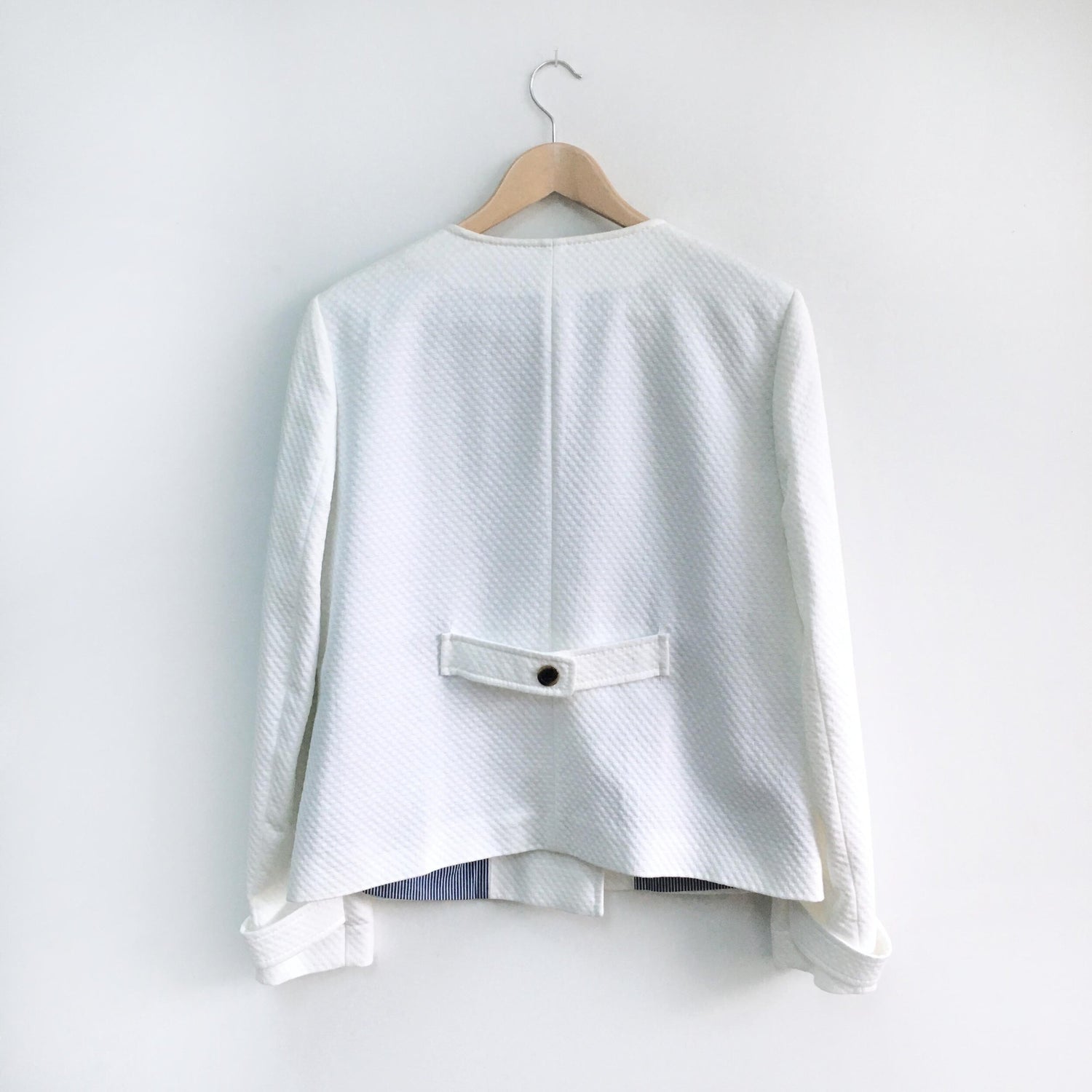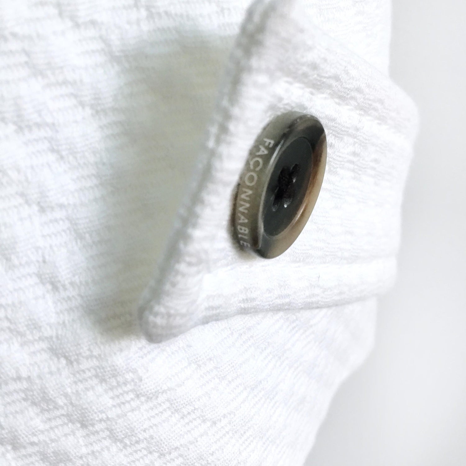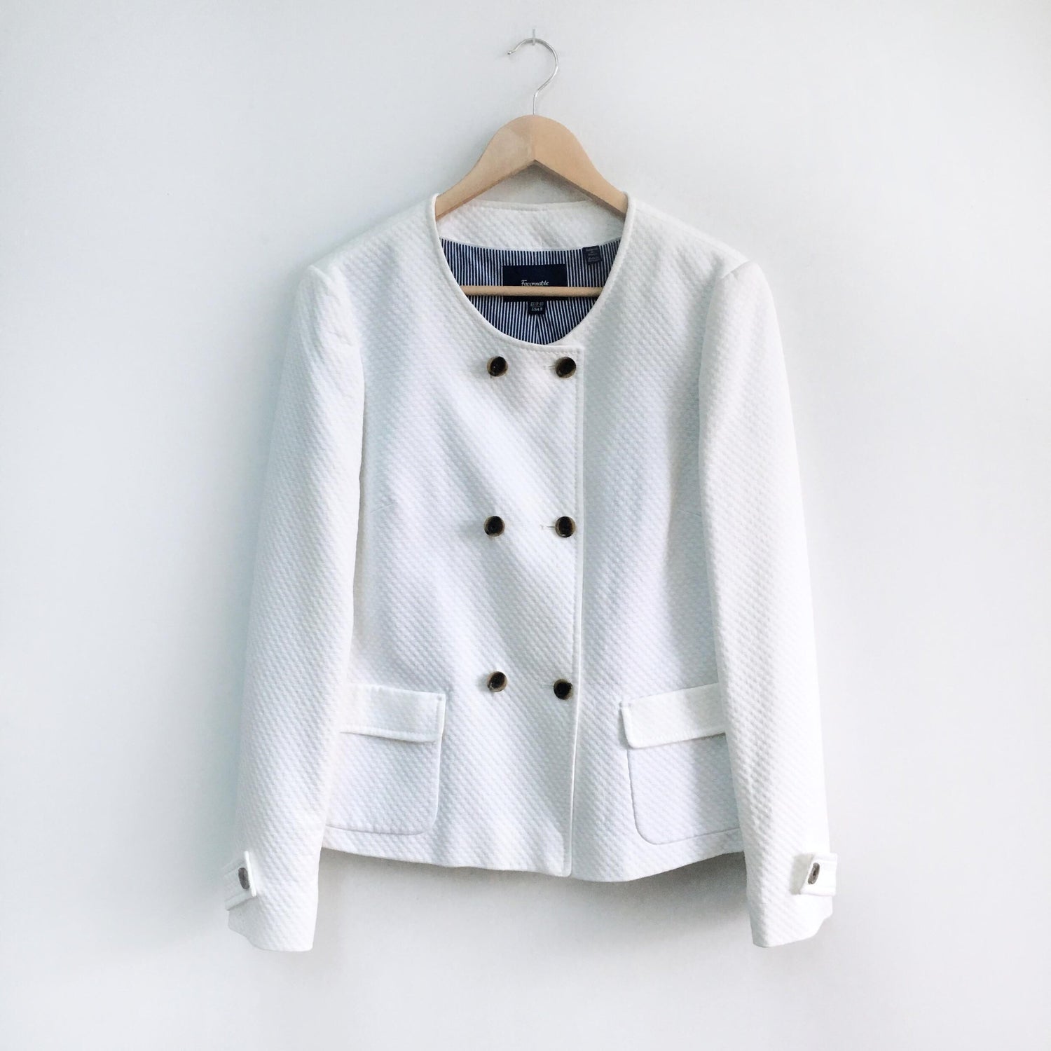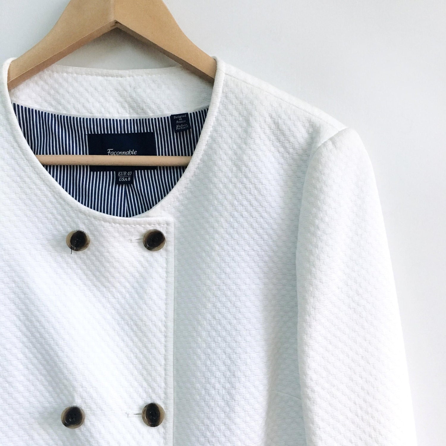 Item Description: Arrive in style in Façonnable’s women’s cruise collection jacket featuring a textured exterior, double breasted front and belted cuffs. 100% cotton