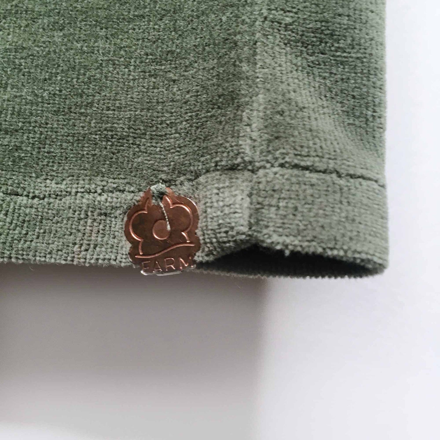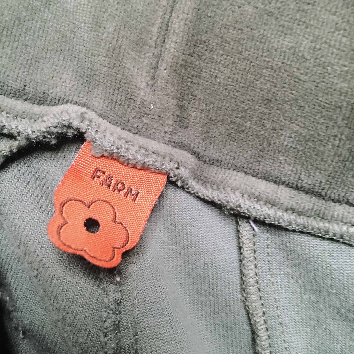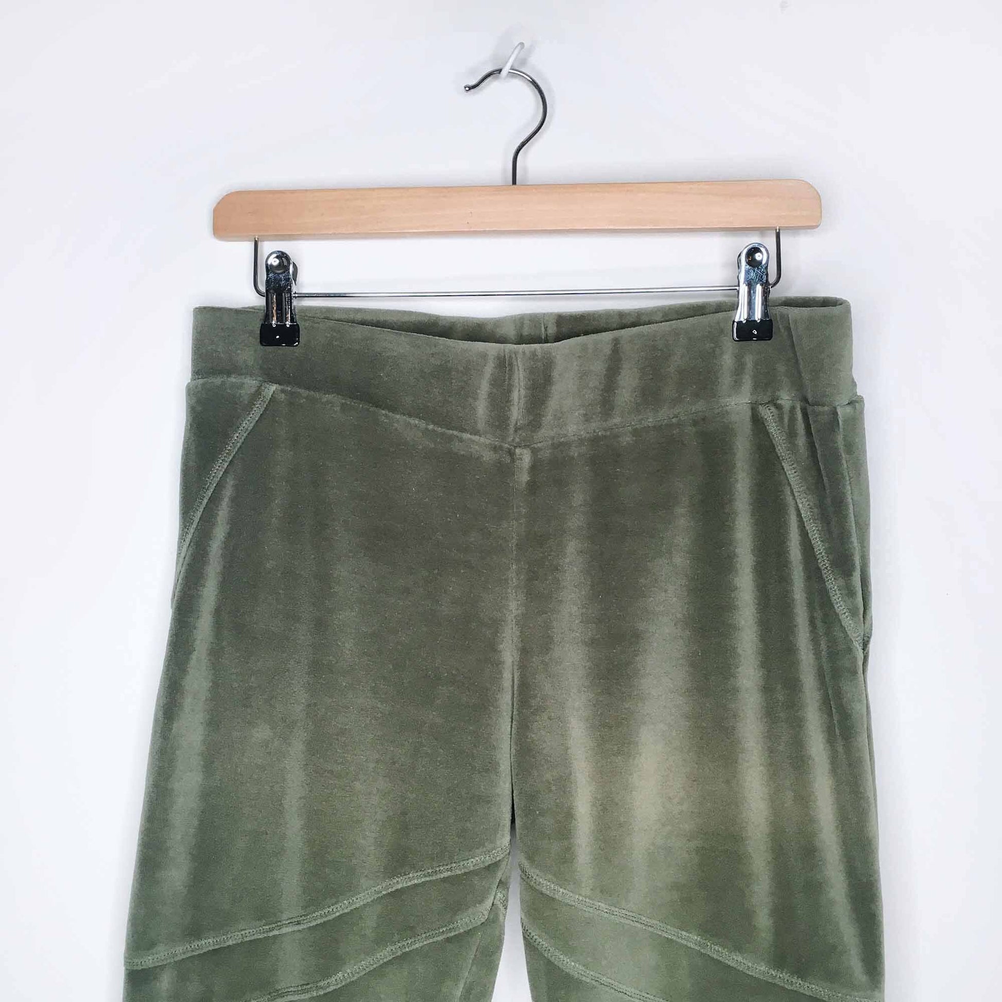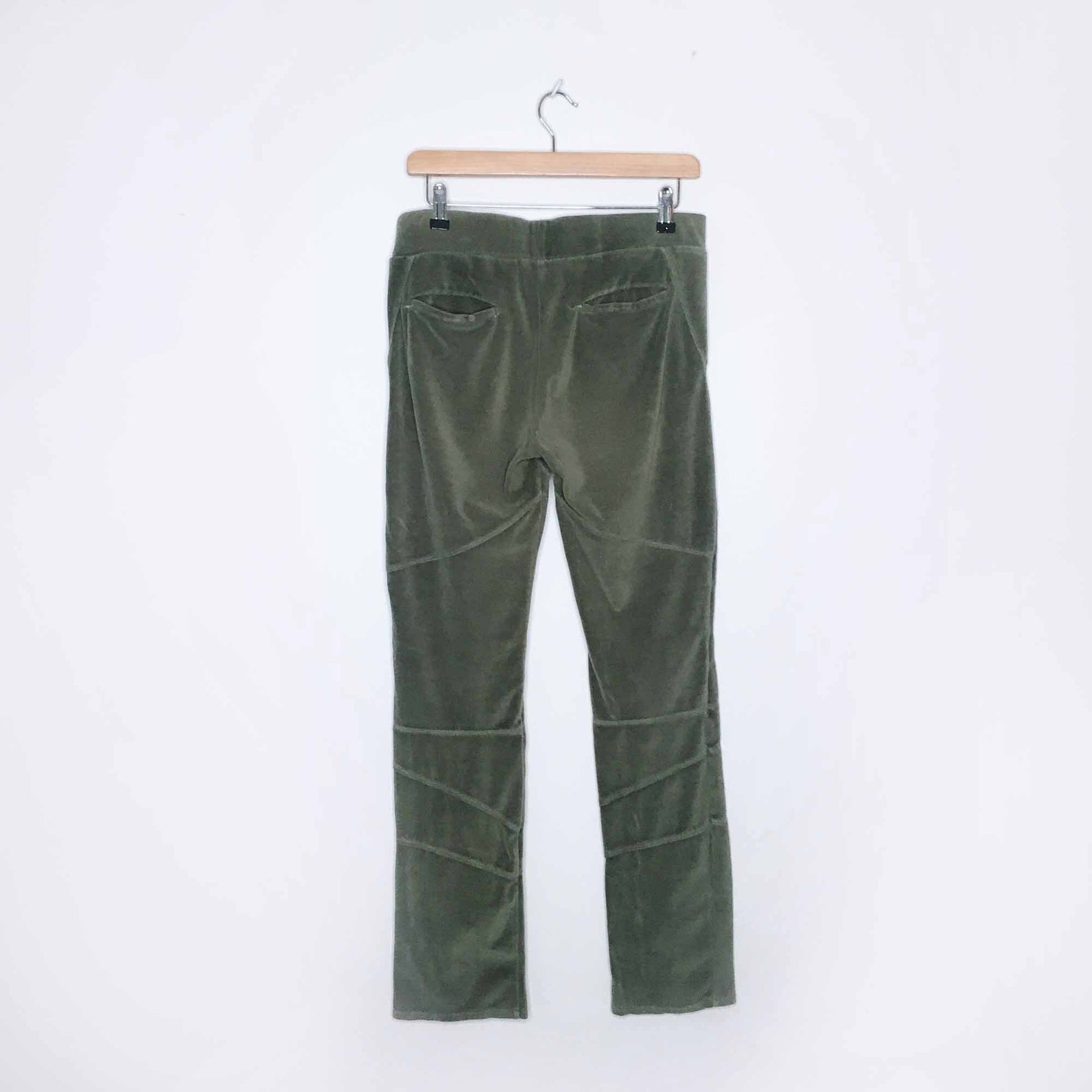 Item Description: Nothing says haute couture loungewear like velour! These slim loungers from Farm Rio (sold at Anthropologie) feature reinforced moto lines in a classic khaki green. No content tag, but stretchy.