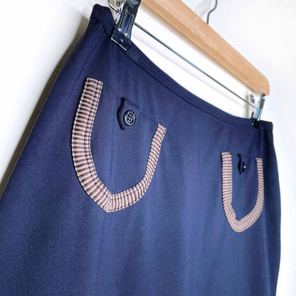 Item Description: This Y2K mini skirt from Fendi features pockets trimmed with their signature brown, this time in a striped pattern with logo button closure. Zip back closure. 75% NY 25% EA