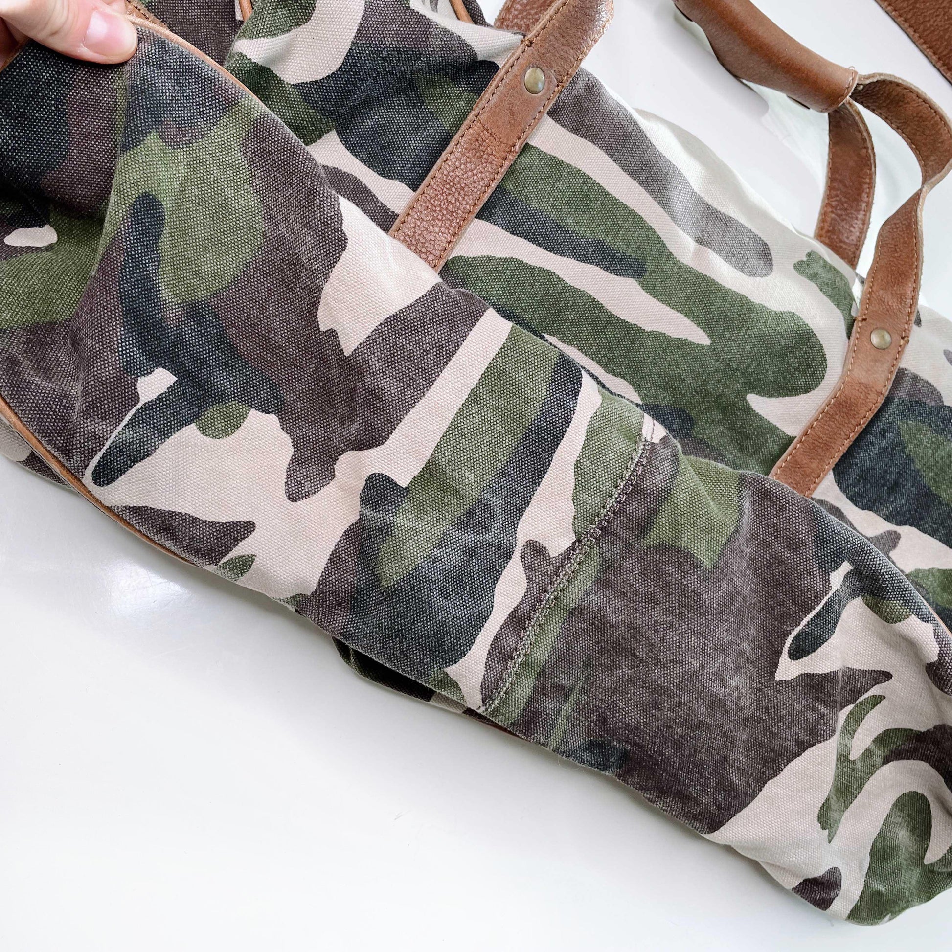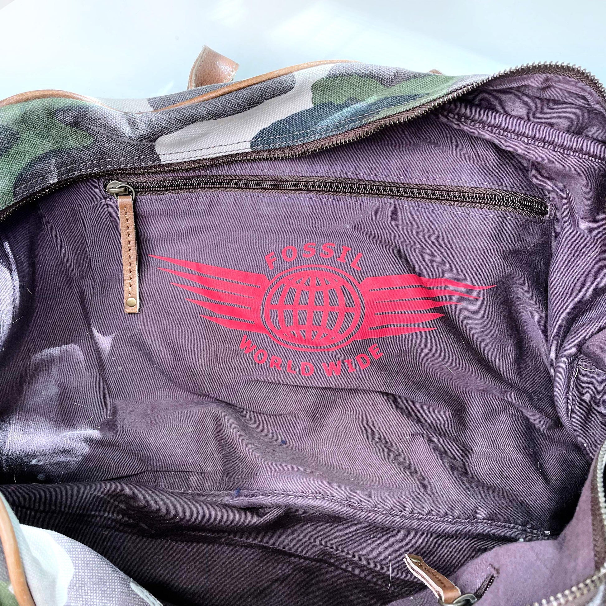 Item Description: This ultra hand, ultra stylish unisex duffle bag from Fossil features numerous utility cargo pockets, spacious interior with brown leather trim and an aviation edge. Cotton shell, leather trim.