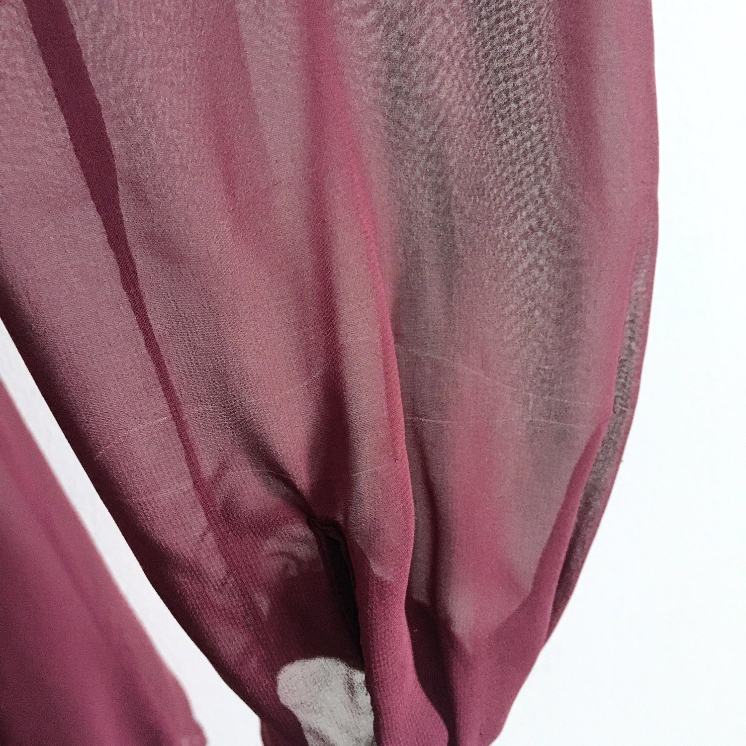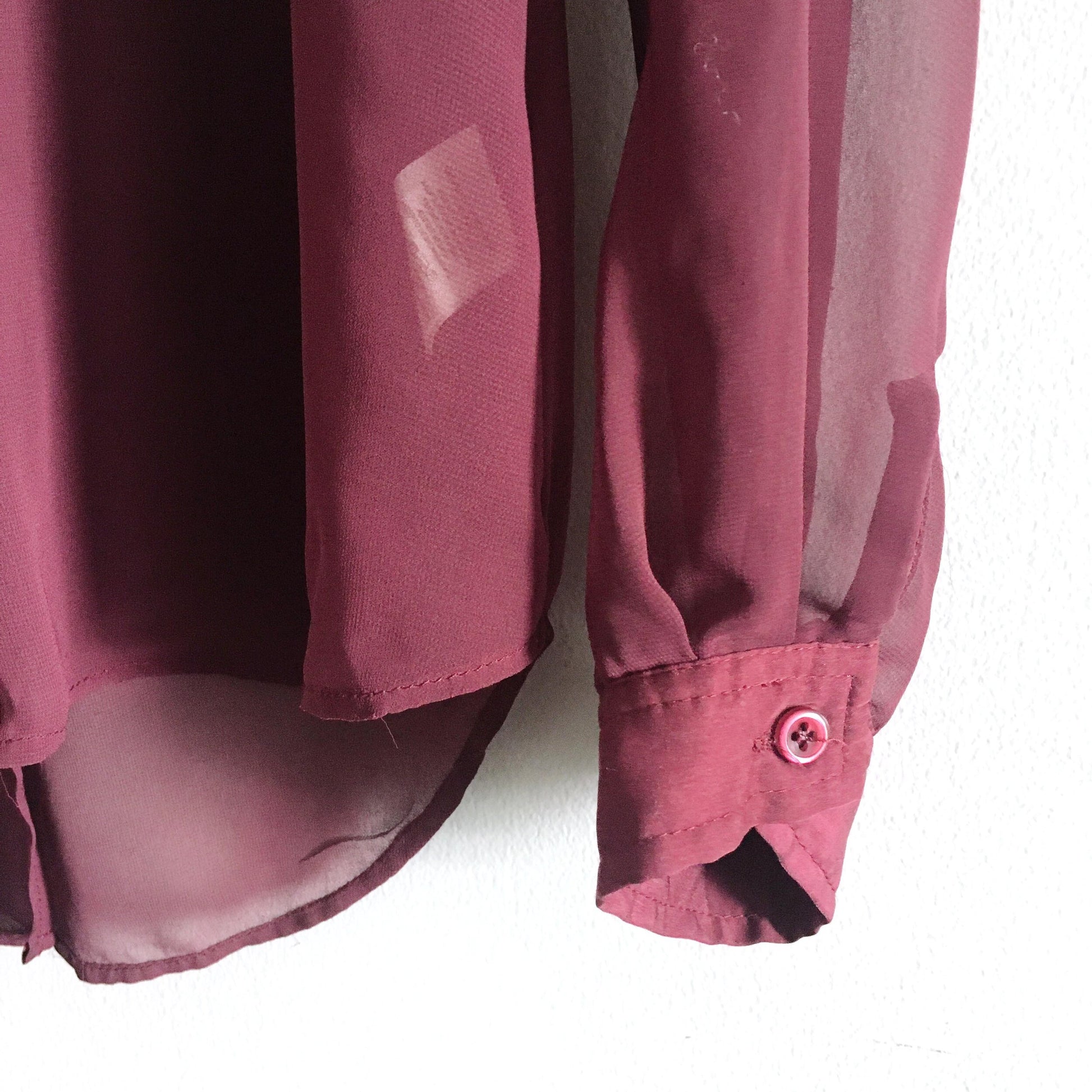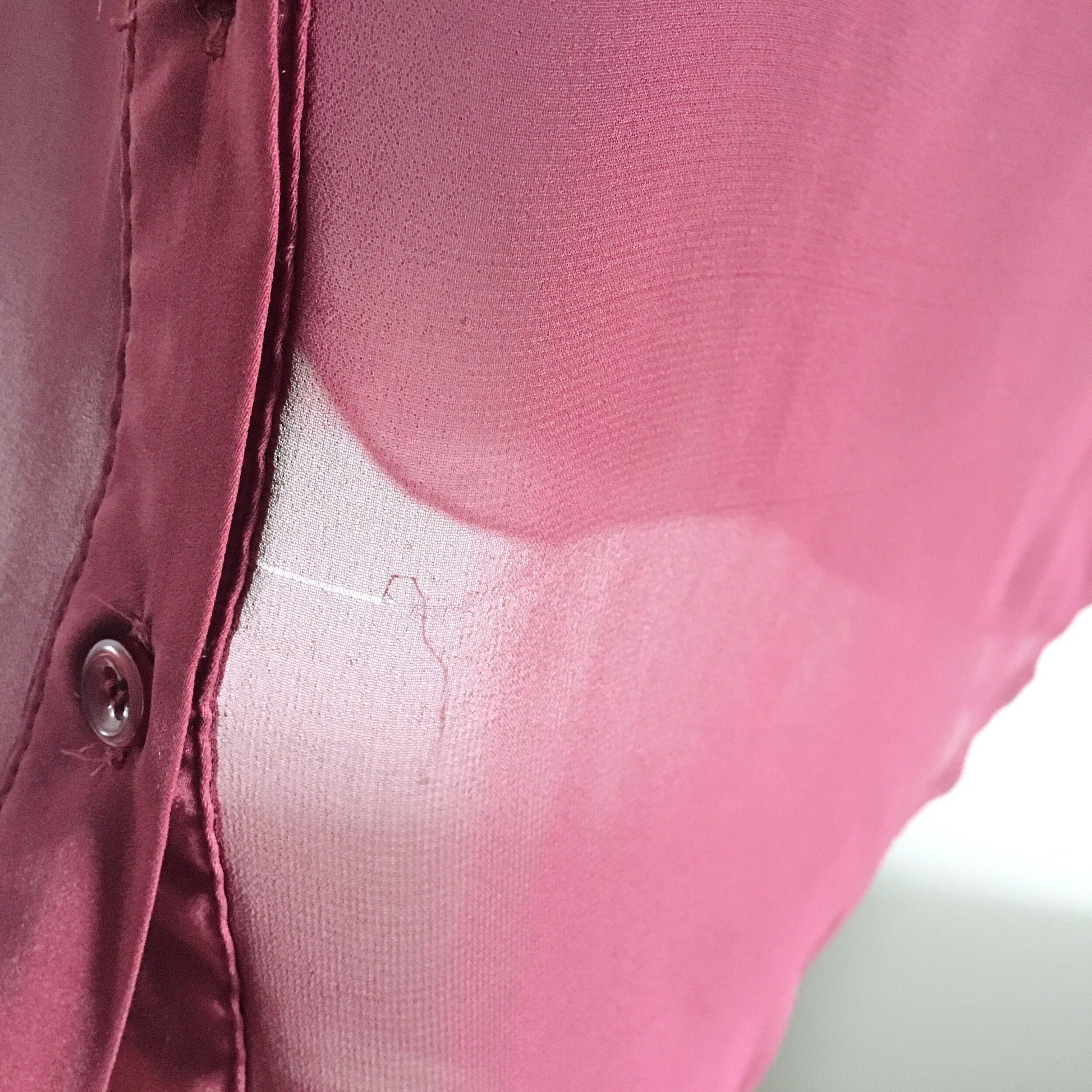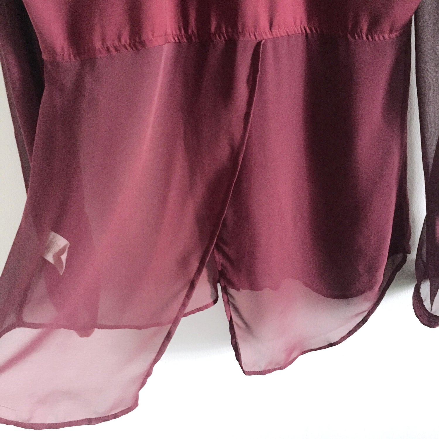 Item Description: This chiffon top features crepe panels at the front and back. 9-button closure and a rounded, asymmetrical hem. Fold-over collar and patch bust pocket. 16" slit at back. Long sleeves. Sheer at chiffon. 100% polyester