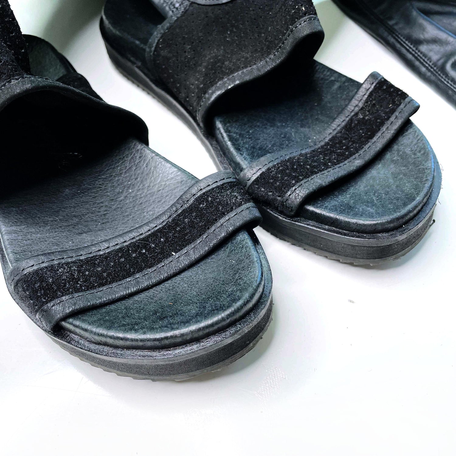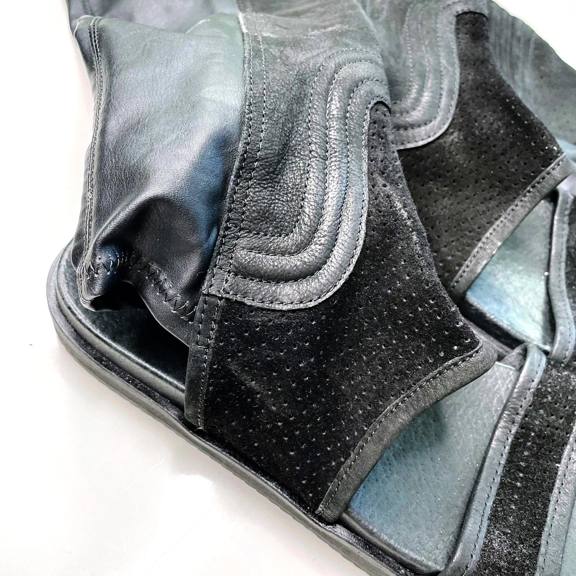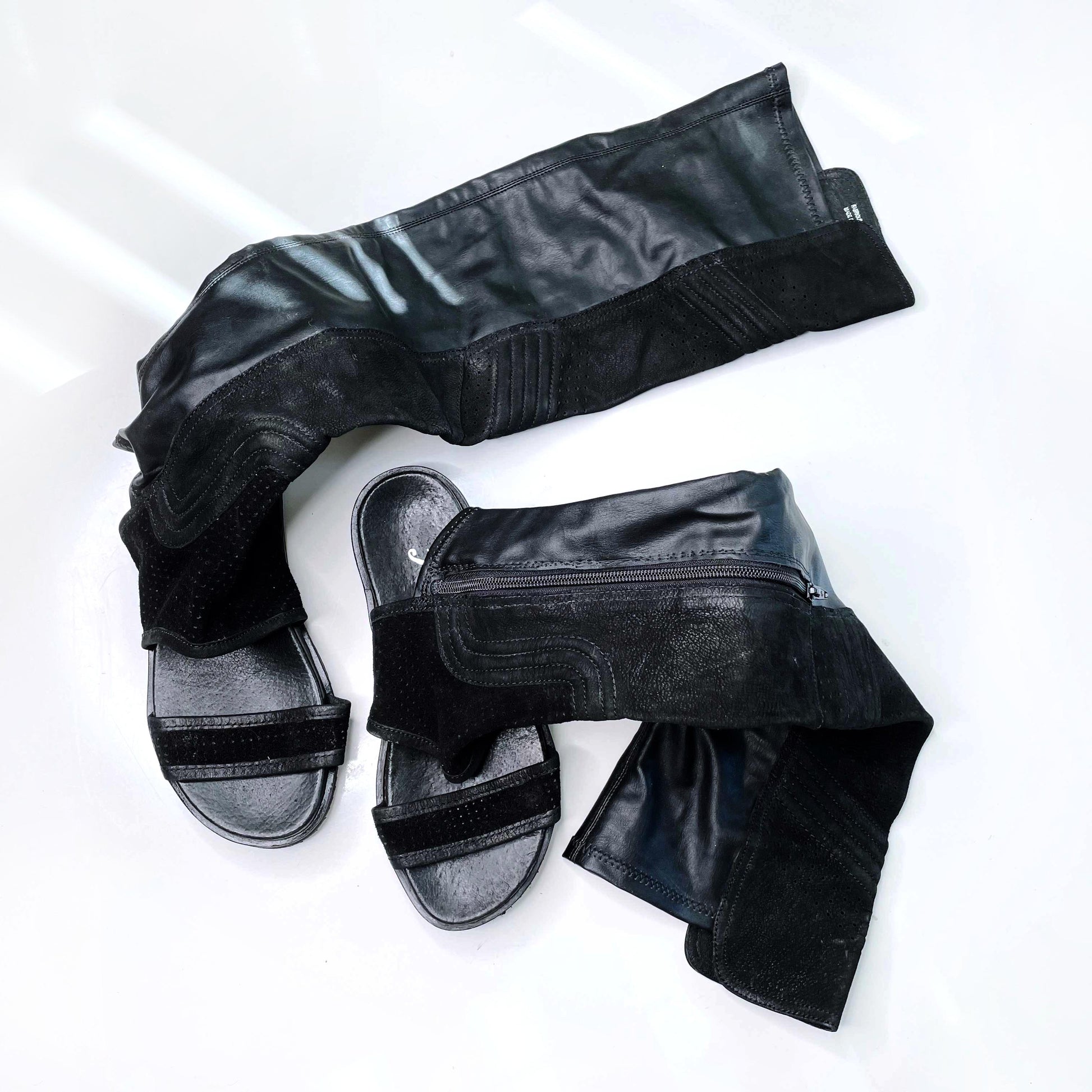 Item Description: These unique sandals from Free People are giving major summer Matrix meets goth grunge vibes. A mix of faux leather and suede, these tall boots feature a cut out sandal with cushioned sole.