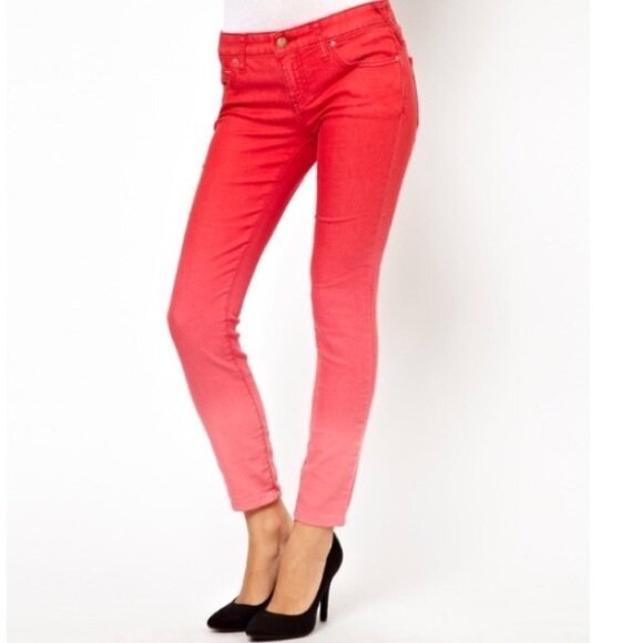 Item Description: Roll up the cuffs on these skinnies and dip your feet into the ocean. These dip dye ombre skinnies in red ombre are so festival ready! 78% cotton 20% polyester 2% spandex