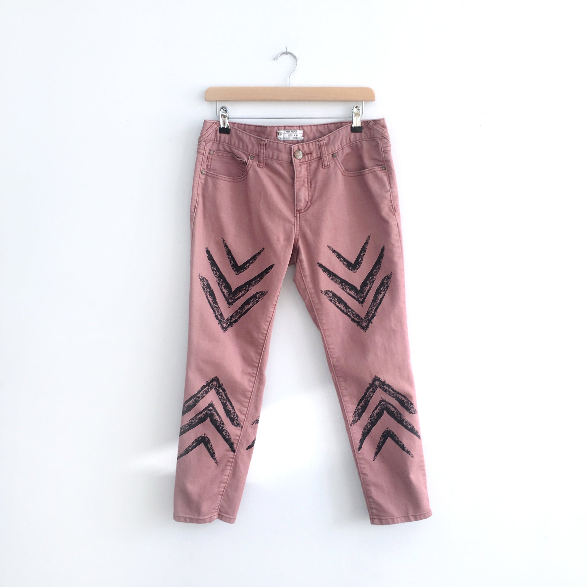 Item Description: Ankle length skinny jeans with dotted ikat print on the front and back. 5-pocket style with zipper and button fly closure. Just a touch of stretch for a comfortable and flattering fit.