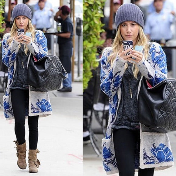 Item Description: Eye-catching roses pattern this long and cozy cardigan, which is detailed with oversized, yet discreet, hip pockets. The tapered shawl collar frames the placket and fastens mid-way with a single snap.