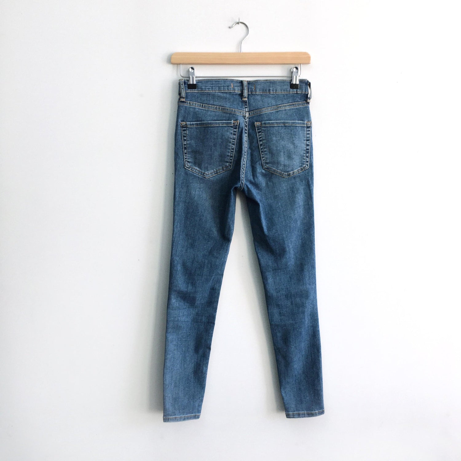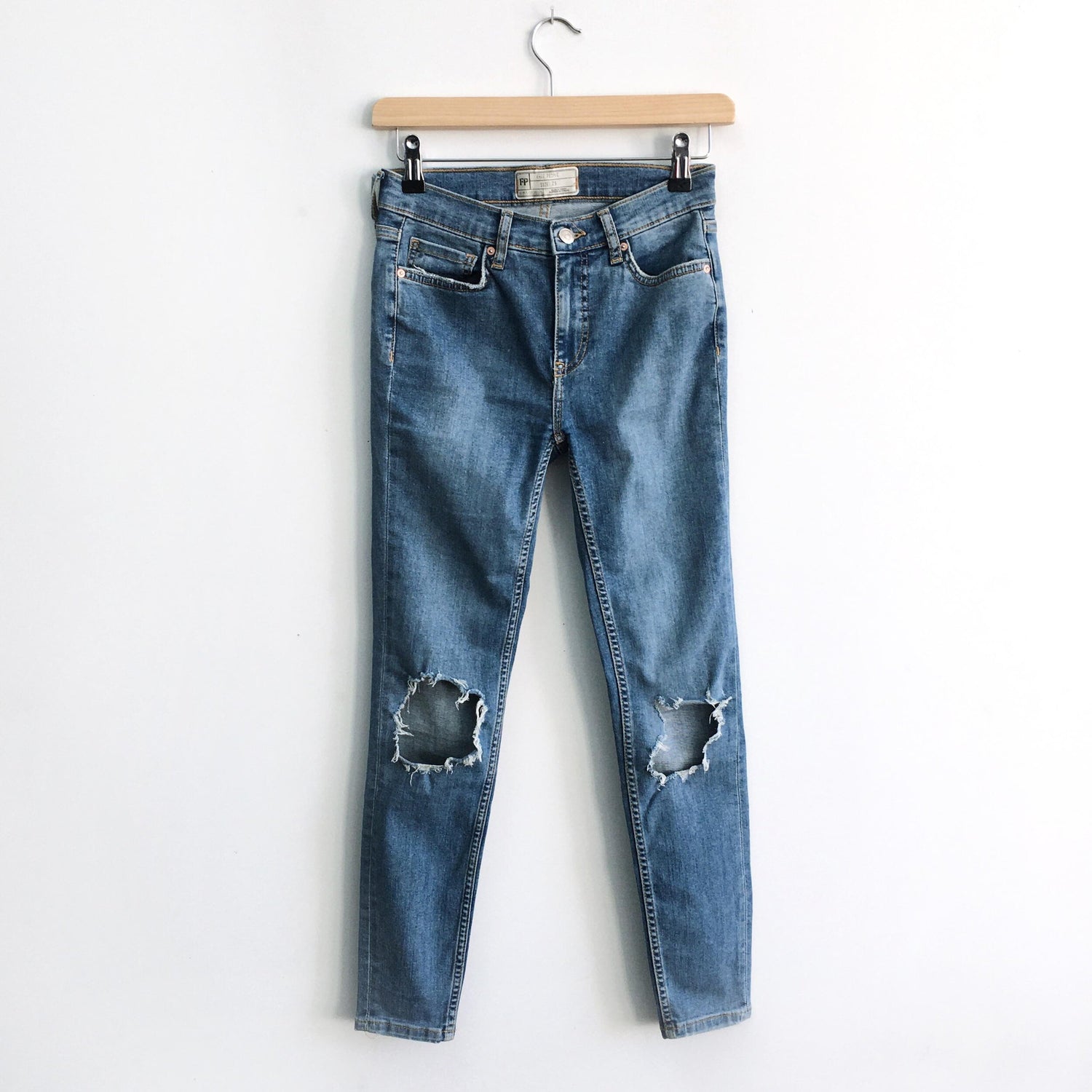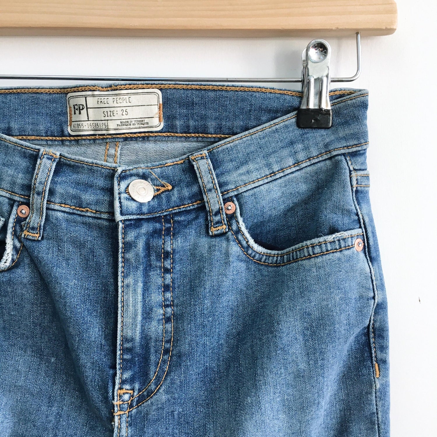 Item Description: Frayed holes at the knees lend a well-worn feel to these soft, faded Free People skinny jeans. 5-pocket styling. Button closure and zip fly. 89% cotton 9% polyester 2% spandex