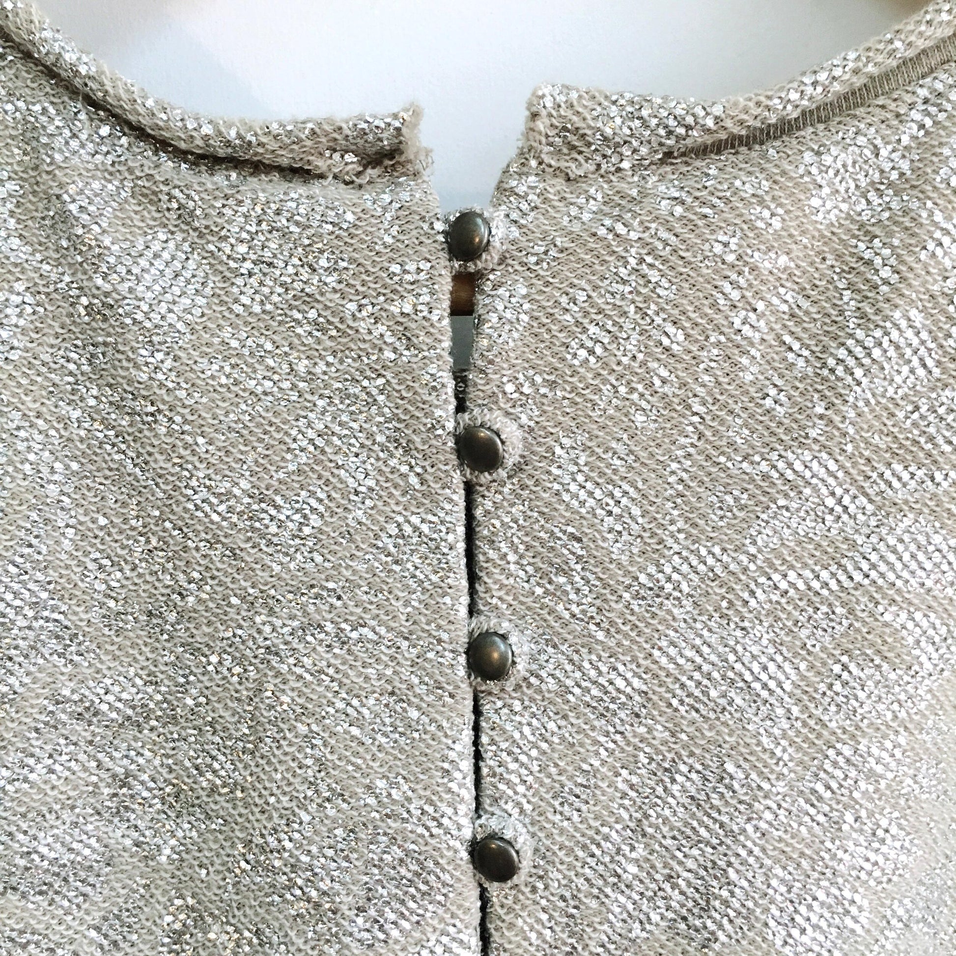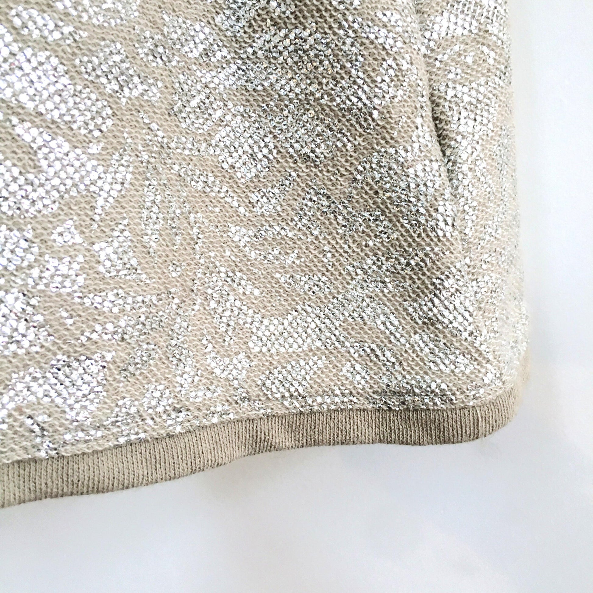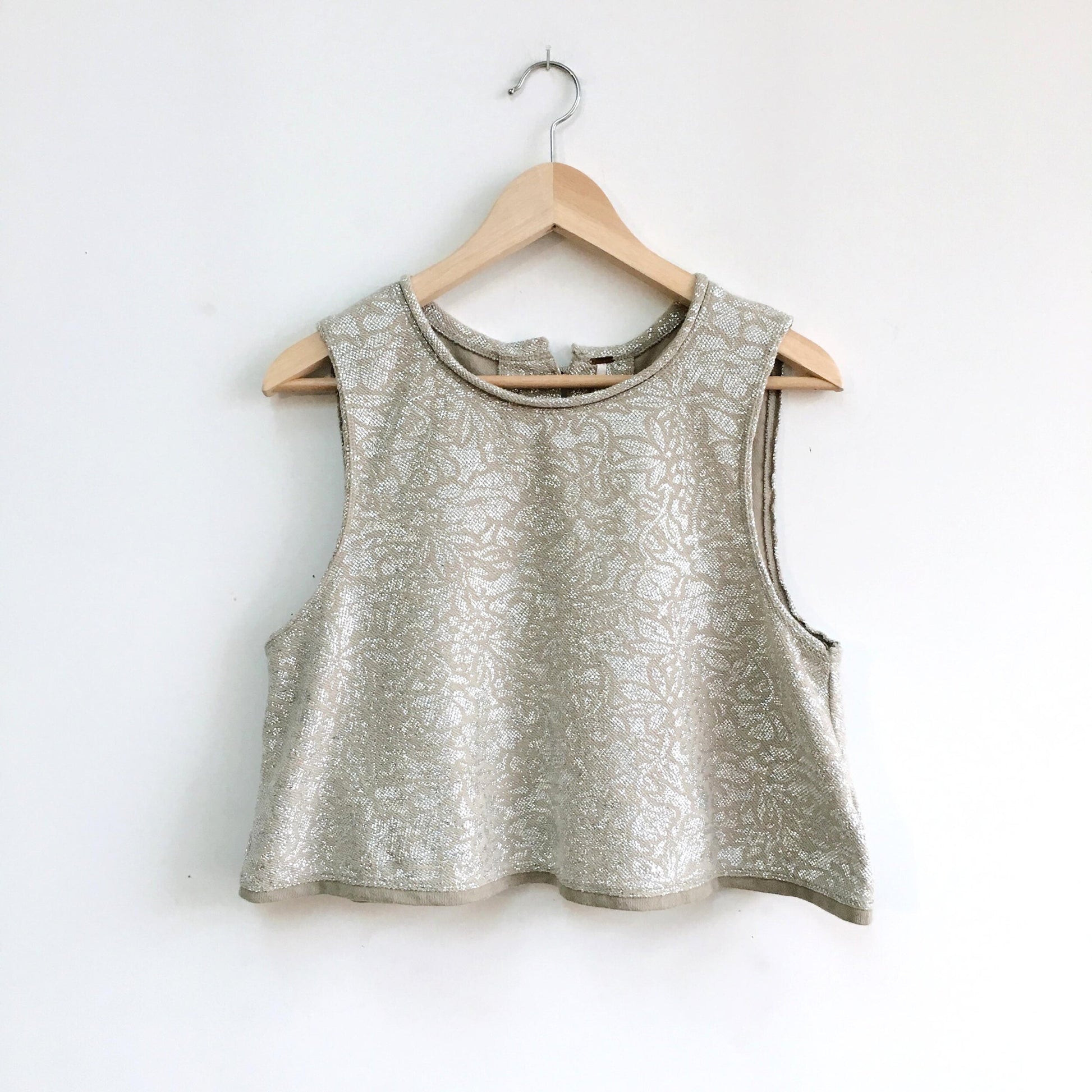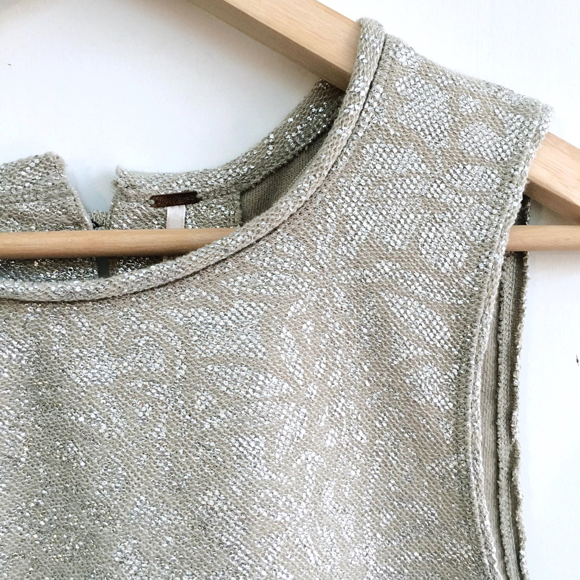 Item Description: This ultra rad sleeveless crop from Free People is made from a light sweatshirt type material and features a button up open back and all over silver stencil print. 50% cotton 50% polyester