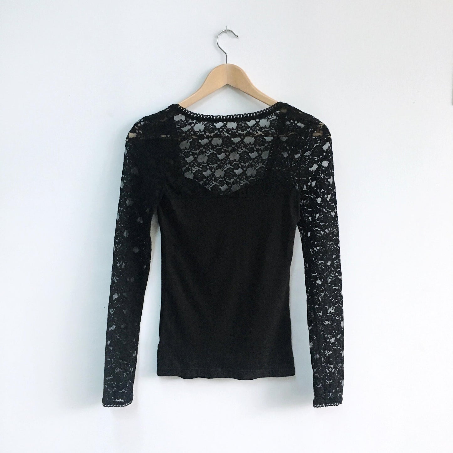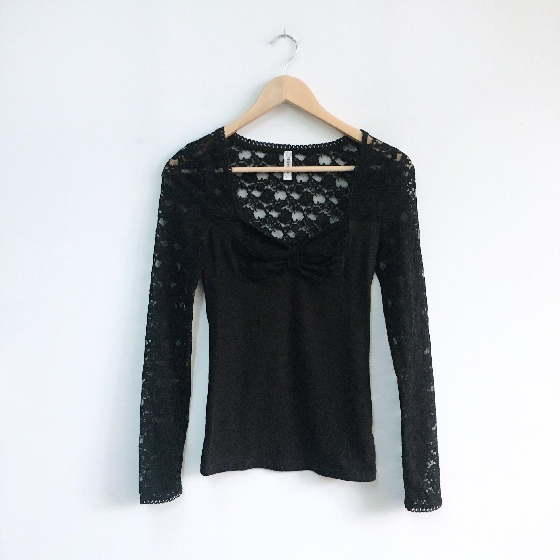 Item Description: This jersey top features a sheer lace yoke and sheer, lace long sleeves. Picot trim at sweetheart neckline and at cuffs. Lace bow overlay at bust. Lace: 90% nylon 10% spandex Body: 95% cotton 5% spandex