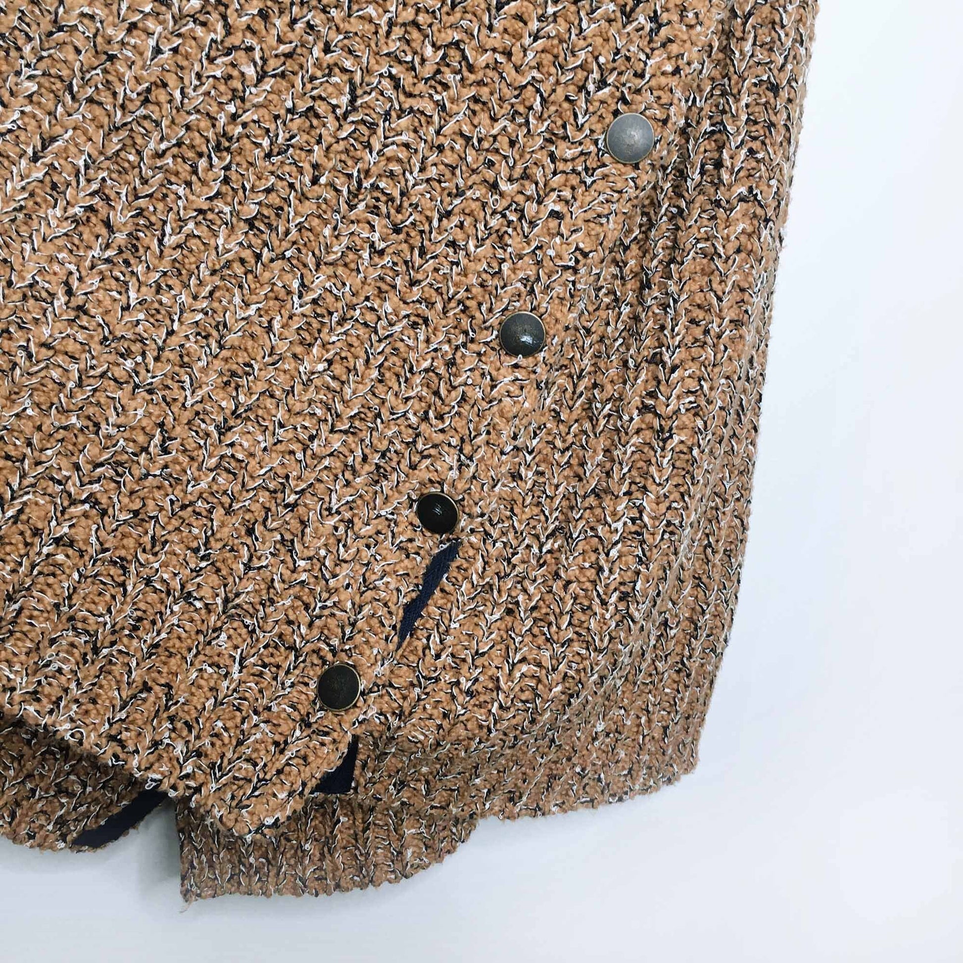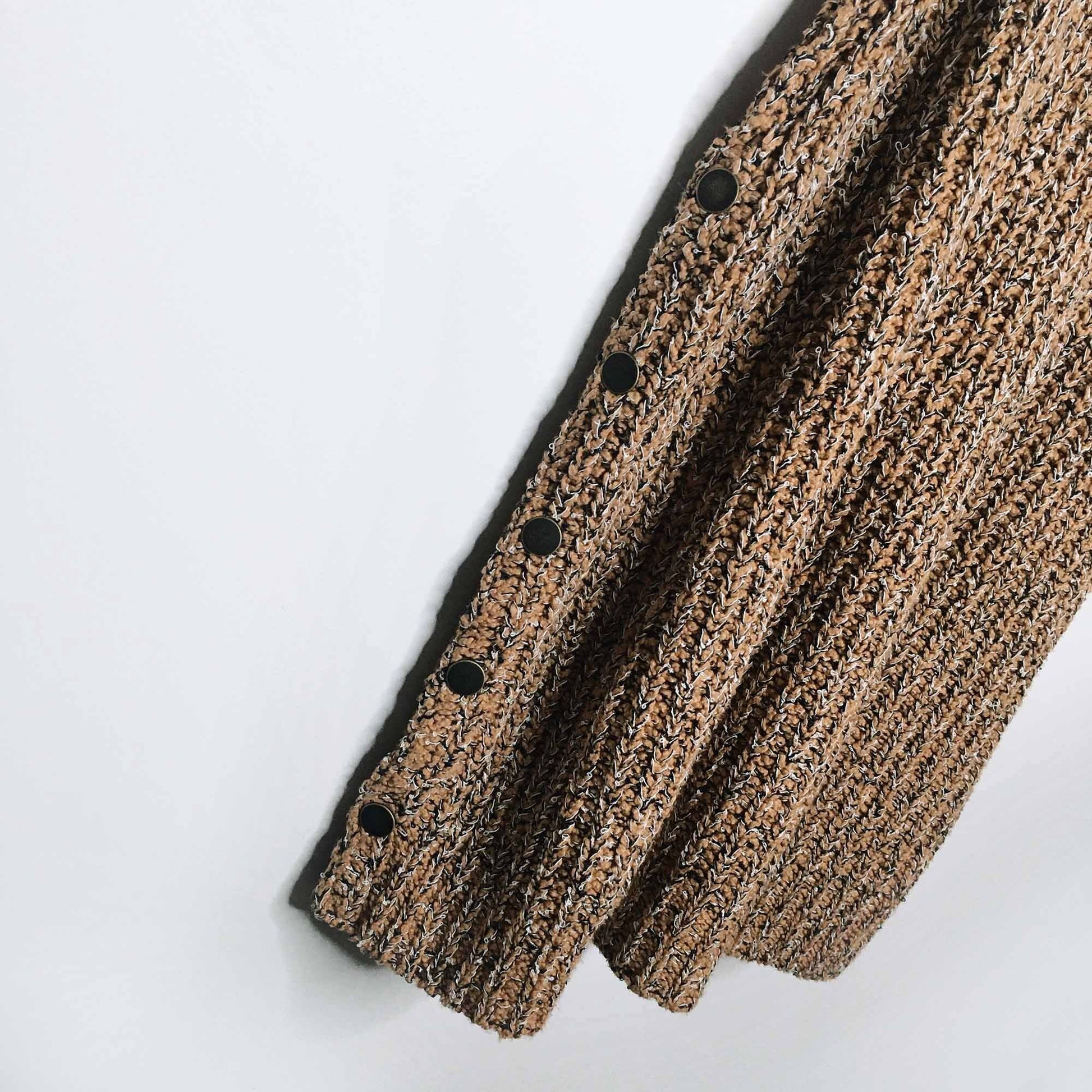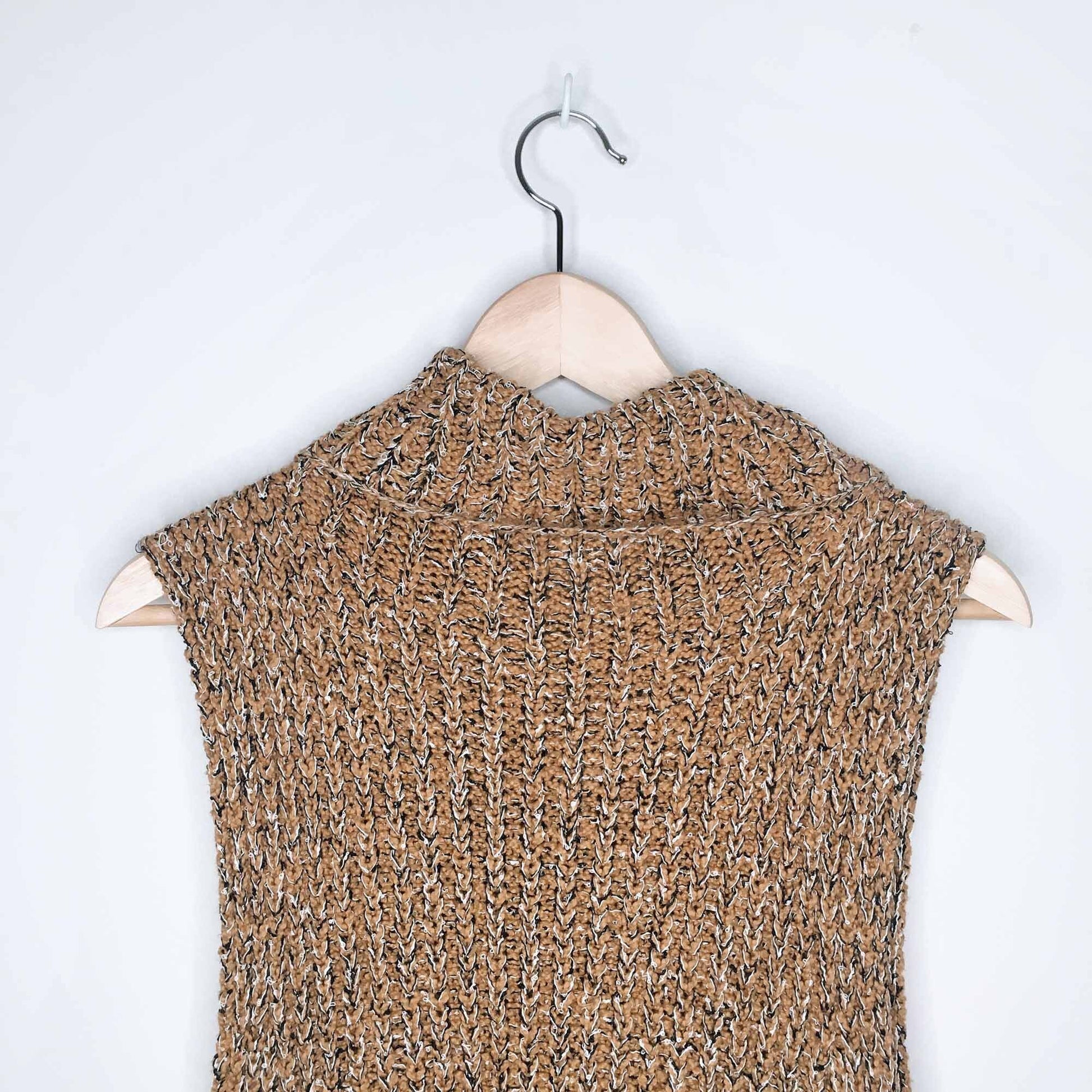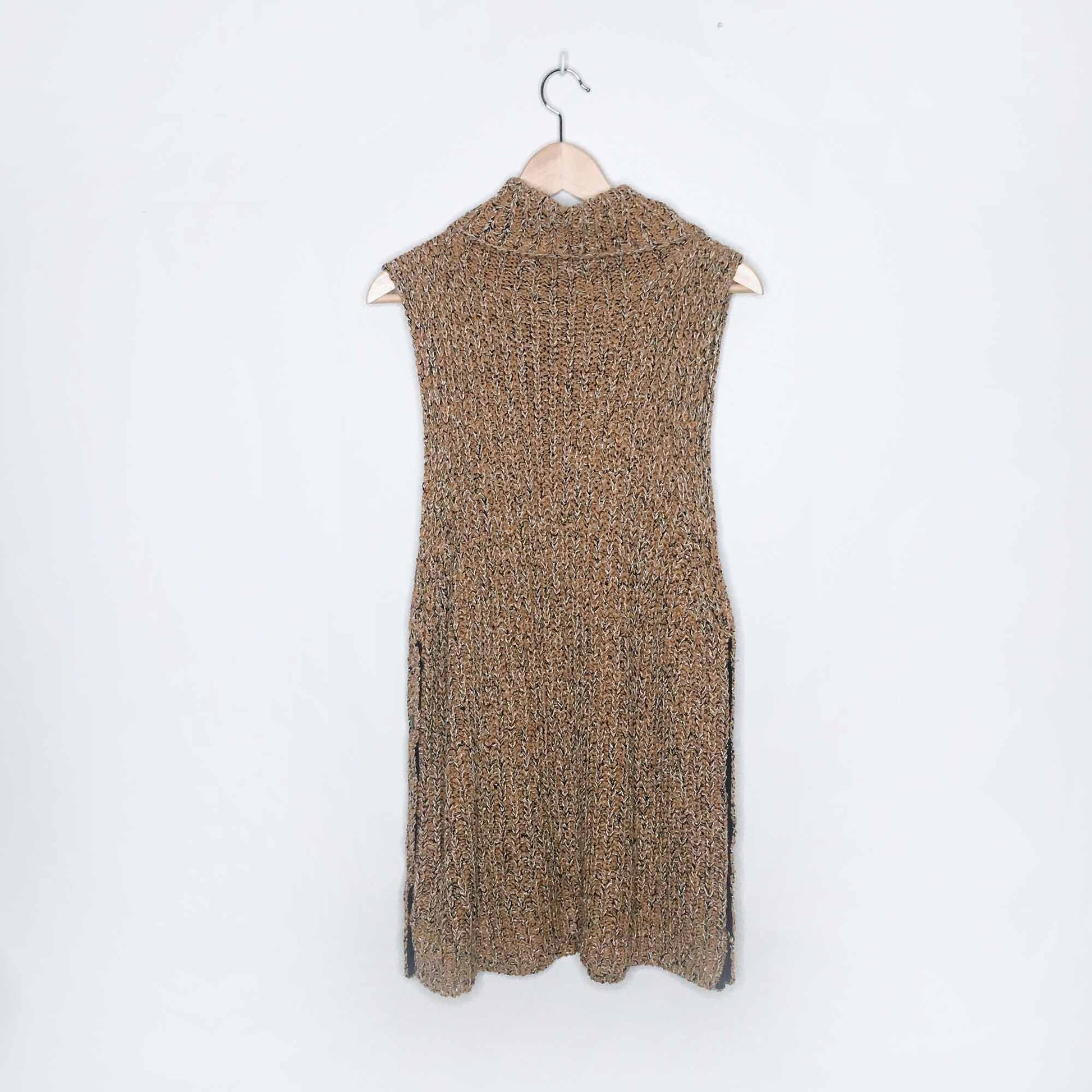Item Description: Featuring dropped armholes and a cowl turtleneck this chunky knit sweater tunic is in a sleeveless silhouette. Open sides with snap closures for customizable side vents. 66% cotton 29% viscose 5% nylon