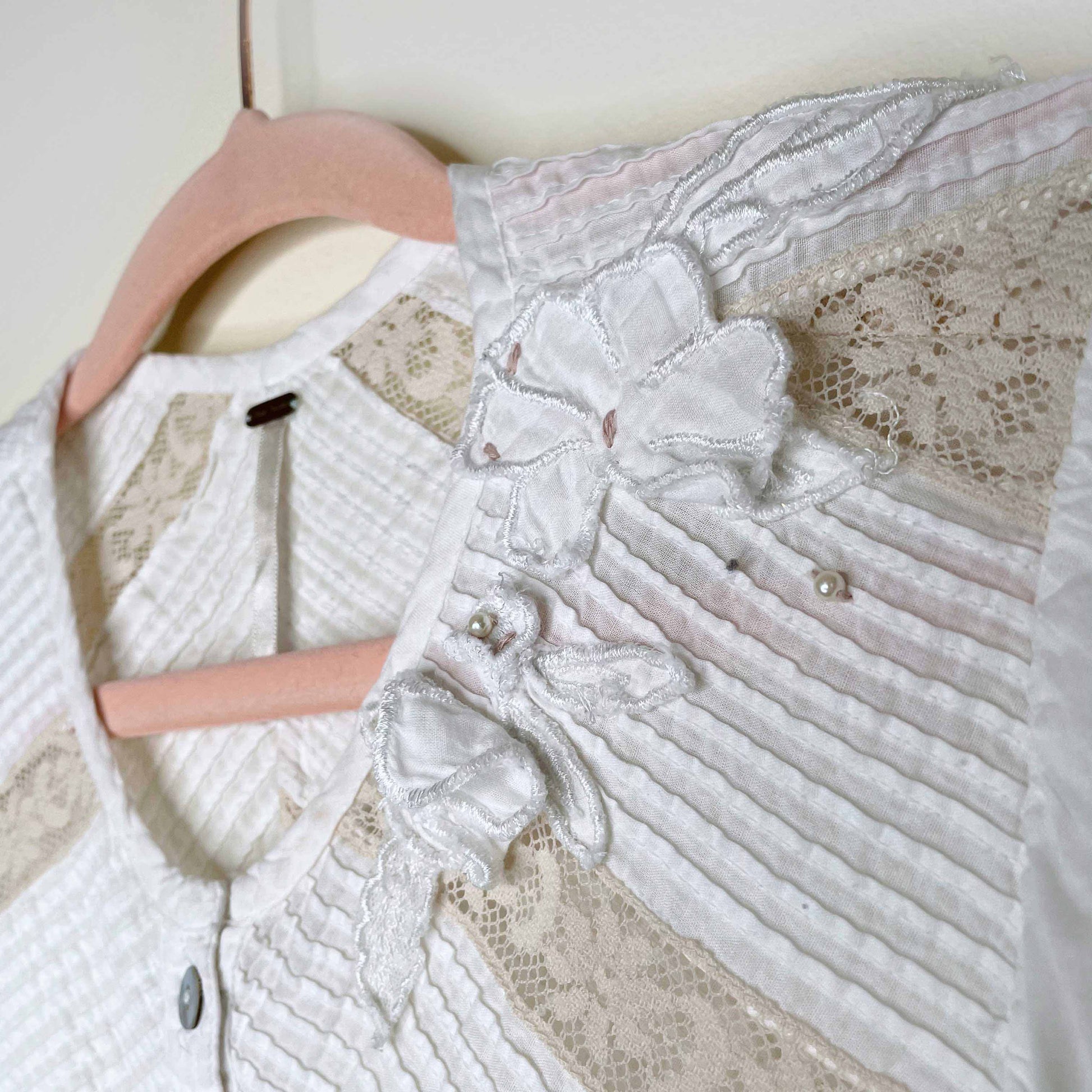 Item Description: Romantic and flowy, this Free People peasant blouse has all the right features - 3/4 sleeves, lace inlay, and flower decals on the shoulder to top it all off. 100% cotton