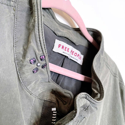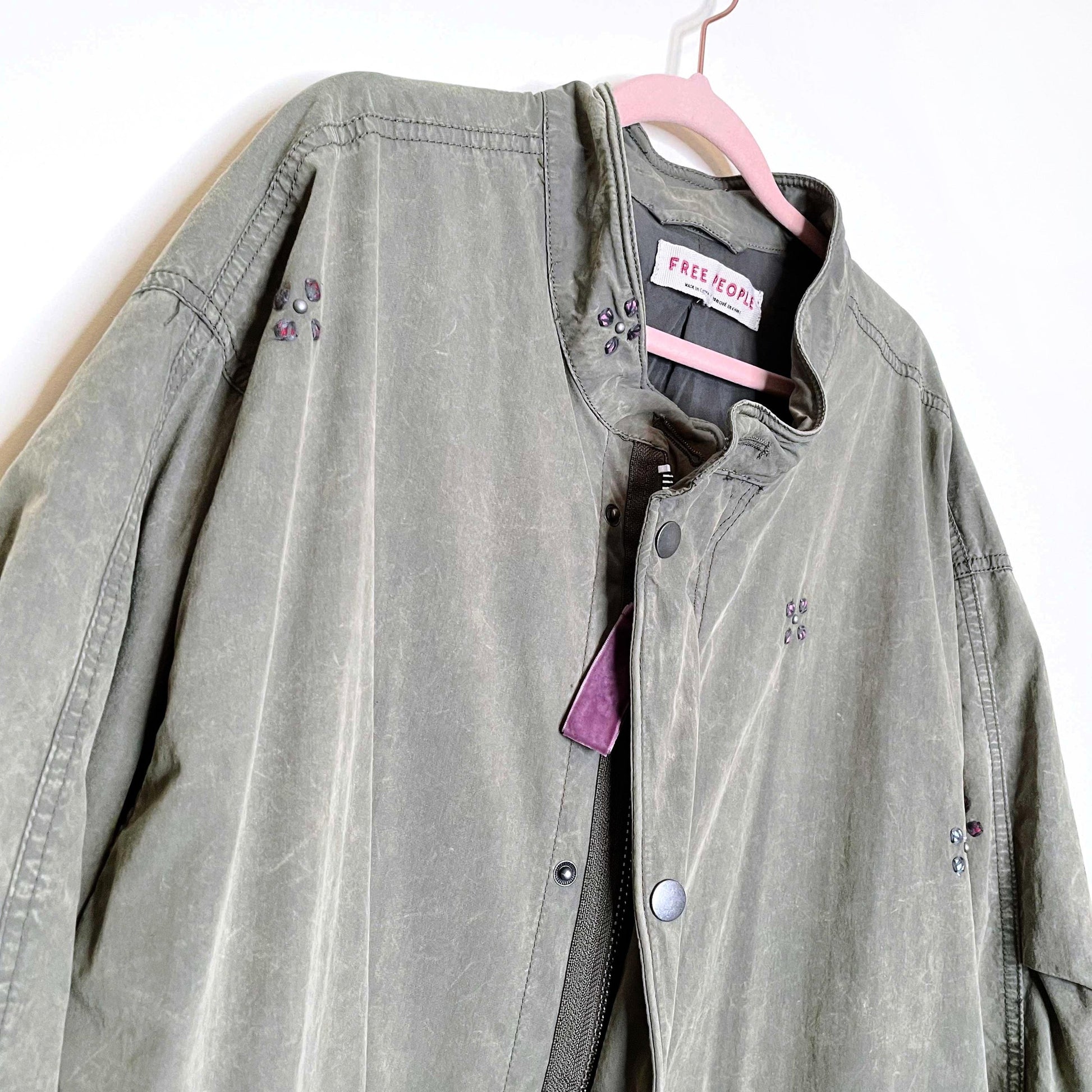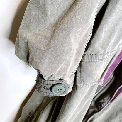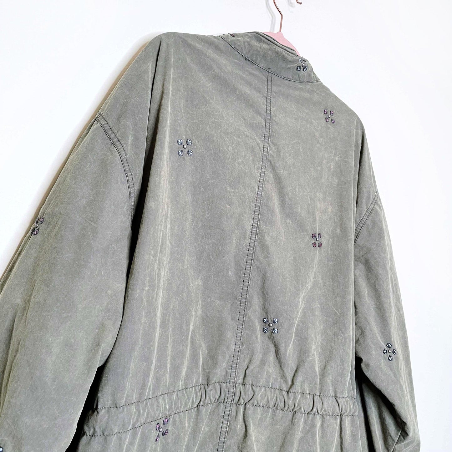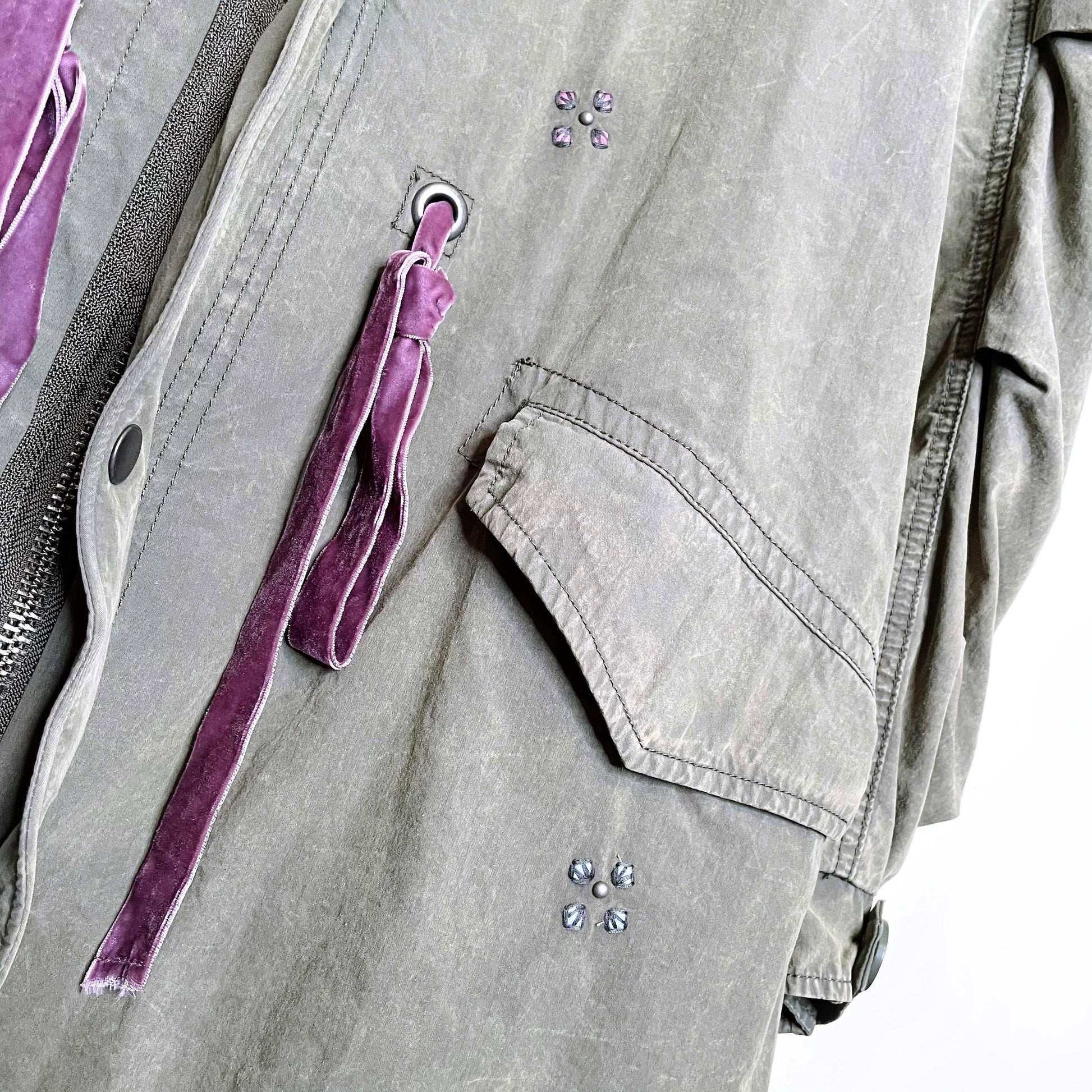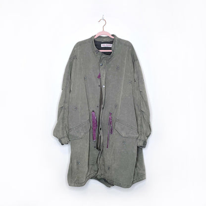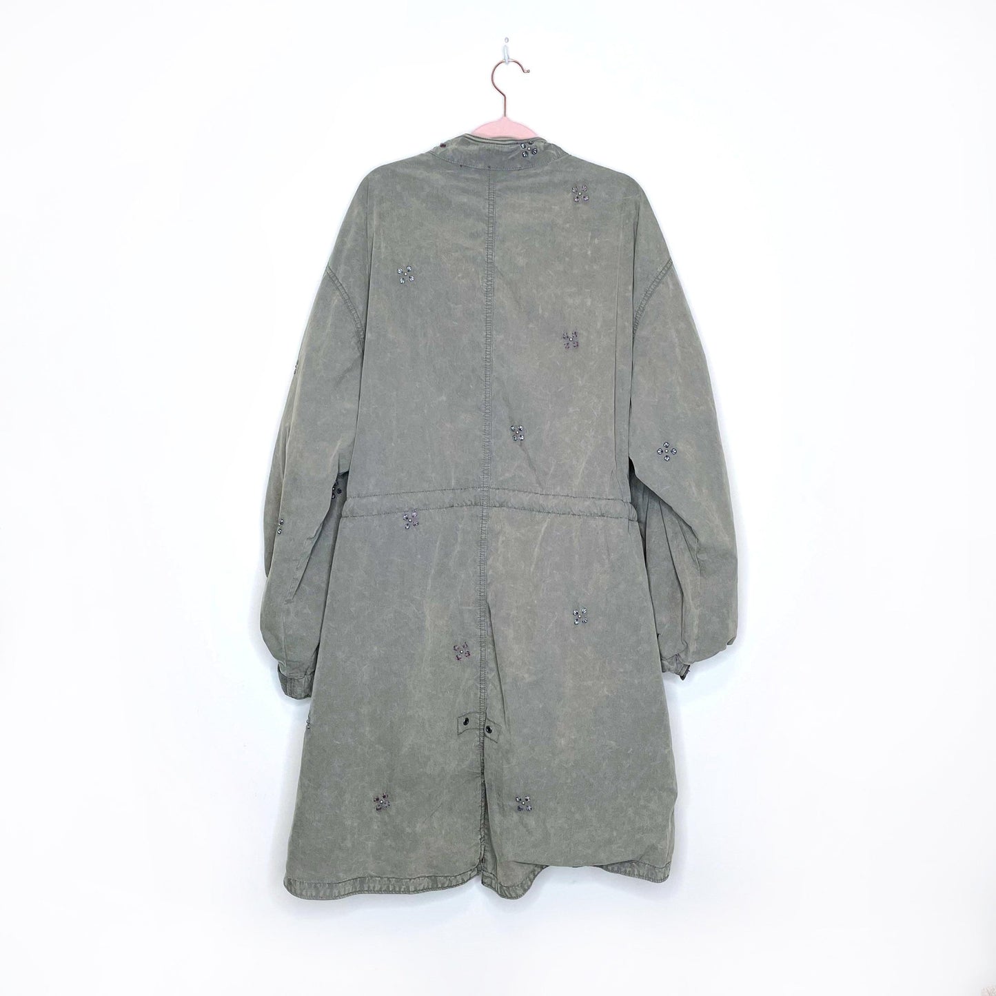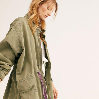 Item Description: The perfect jacket for any season, this effortless parka features floral embroidery and velvet drawstring waist in a slouchy, longline silhouette. 70% cotton 30% nylon 100% viscose lining