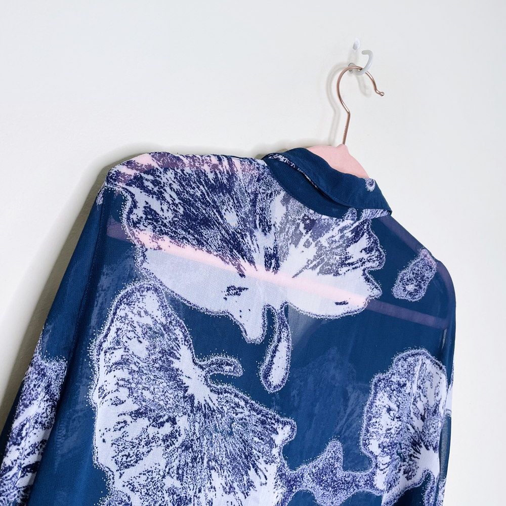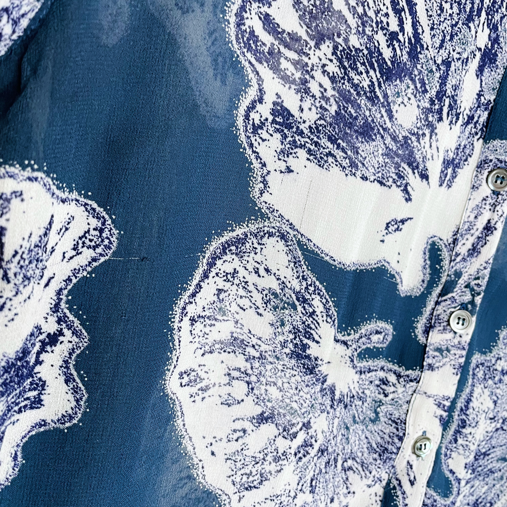 Item Description: This airy, flowy blouse from Ganni features a blue macro floral design in a semi-sheer chiffon fabric, and classic button down silhouette.