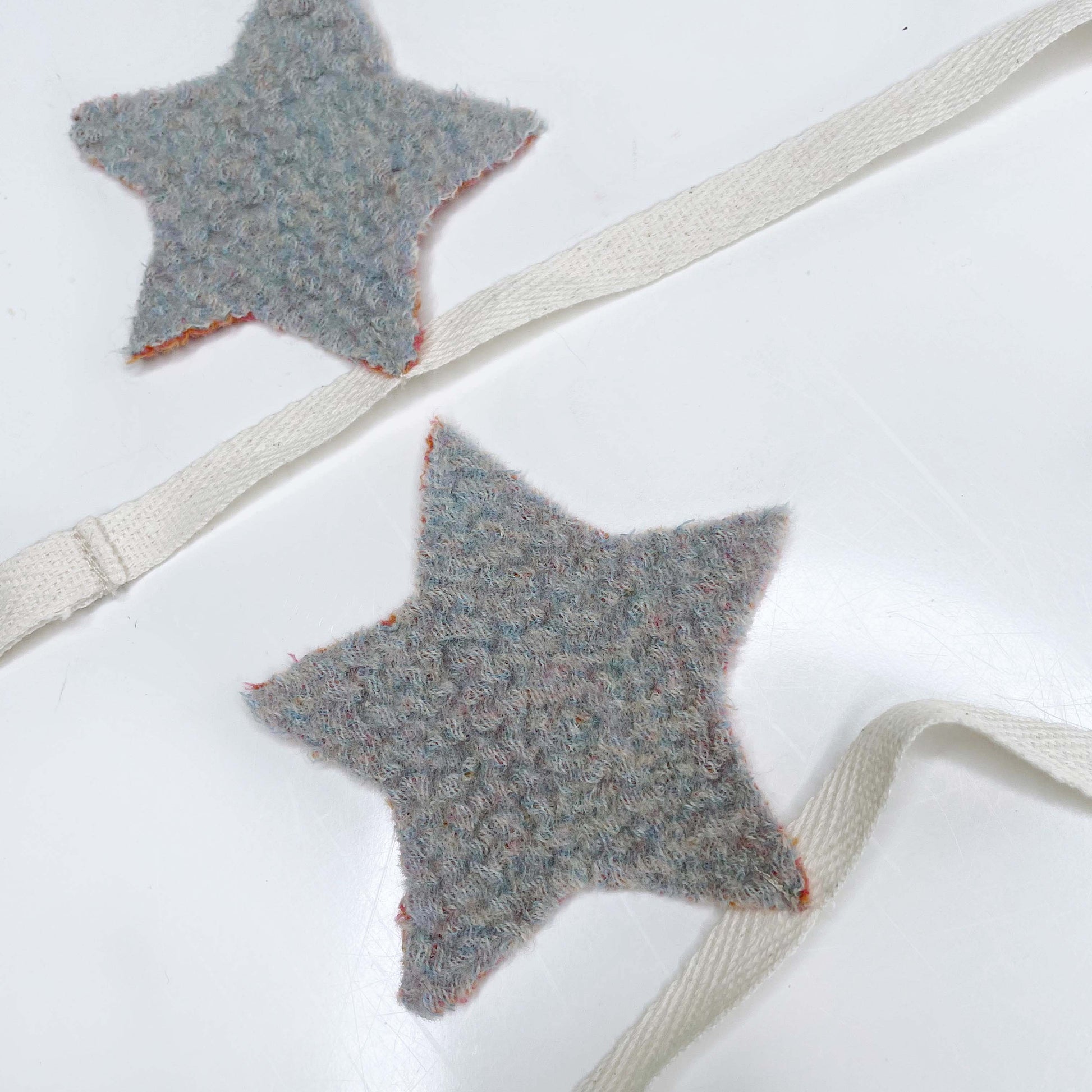 Item description: This bohemian garland is made up of cutout stars from a boiled wool scarf - this scarf had a huge hole on one side but we just didn't have the heart to throw it out! So we cut out stars and made a multi-use garland. Drape across a wall or mantle for a party, or hang in a baby's room. Also makes a great gift. 100% wool