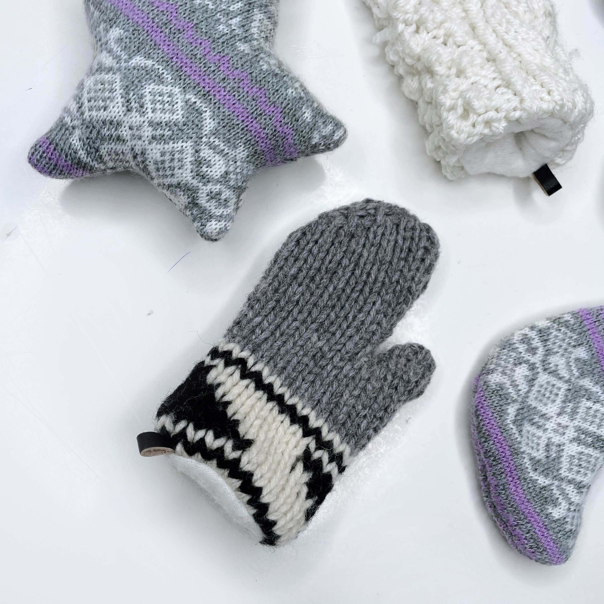 Item description: These novelty knit wool ornaments are stuffed to the brim for a fun, and novel aesthetic, set in neutral colours. We're thinking these are perfect for a christmas tree in a baby's room! Or tie to a gift for a little extra fun!
