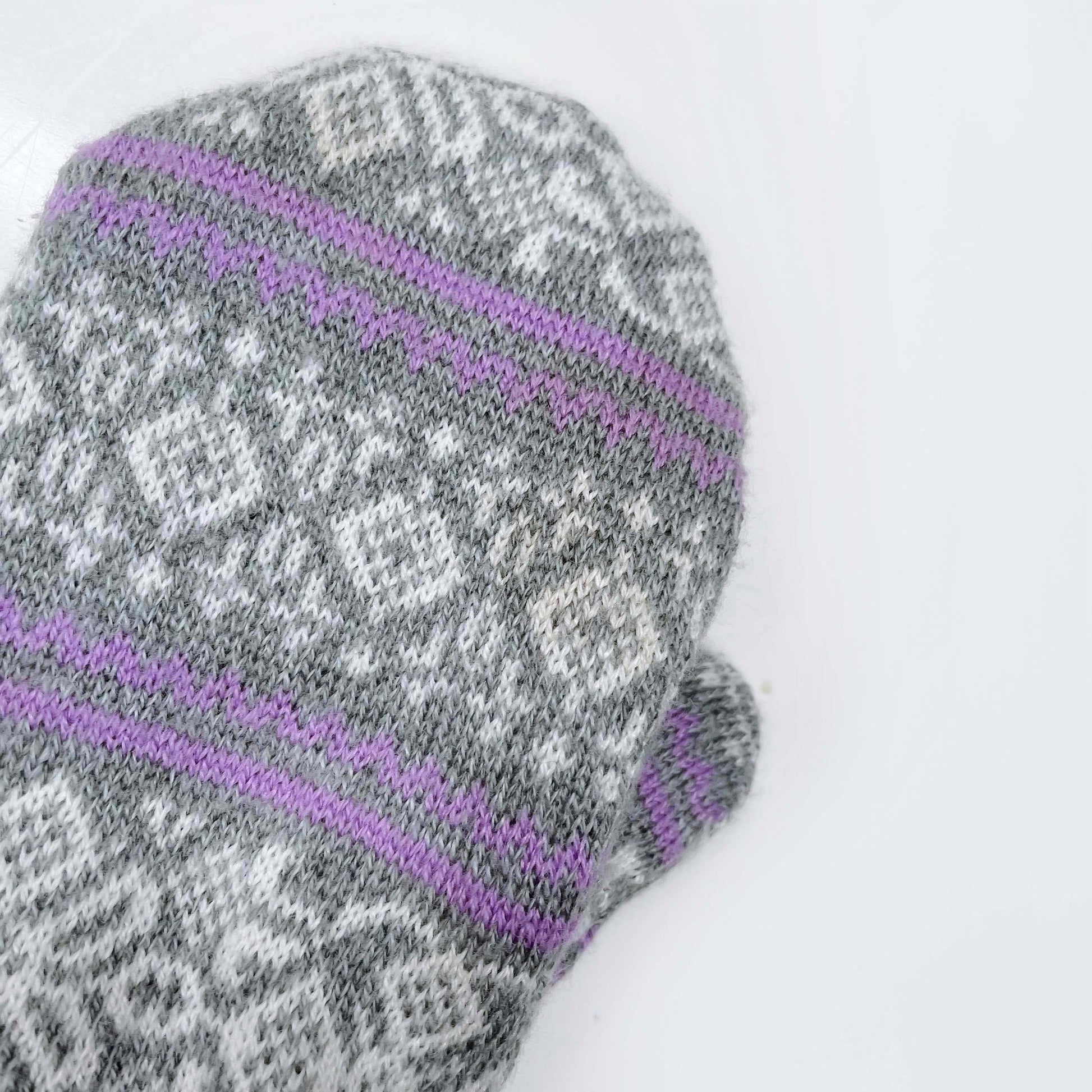 Item description: These wool-blend mittens are upcycled from an old sweater. Lined with fleece these mittens are a perfect fit!