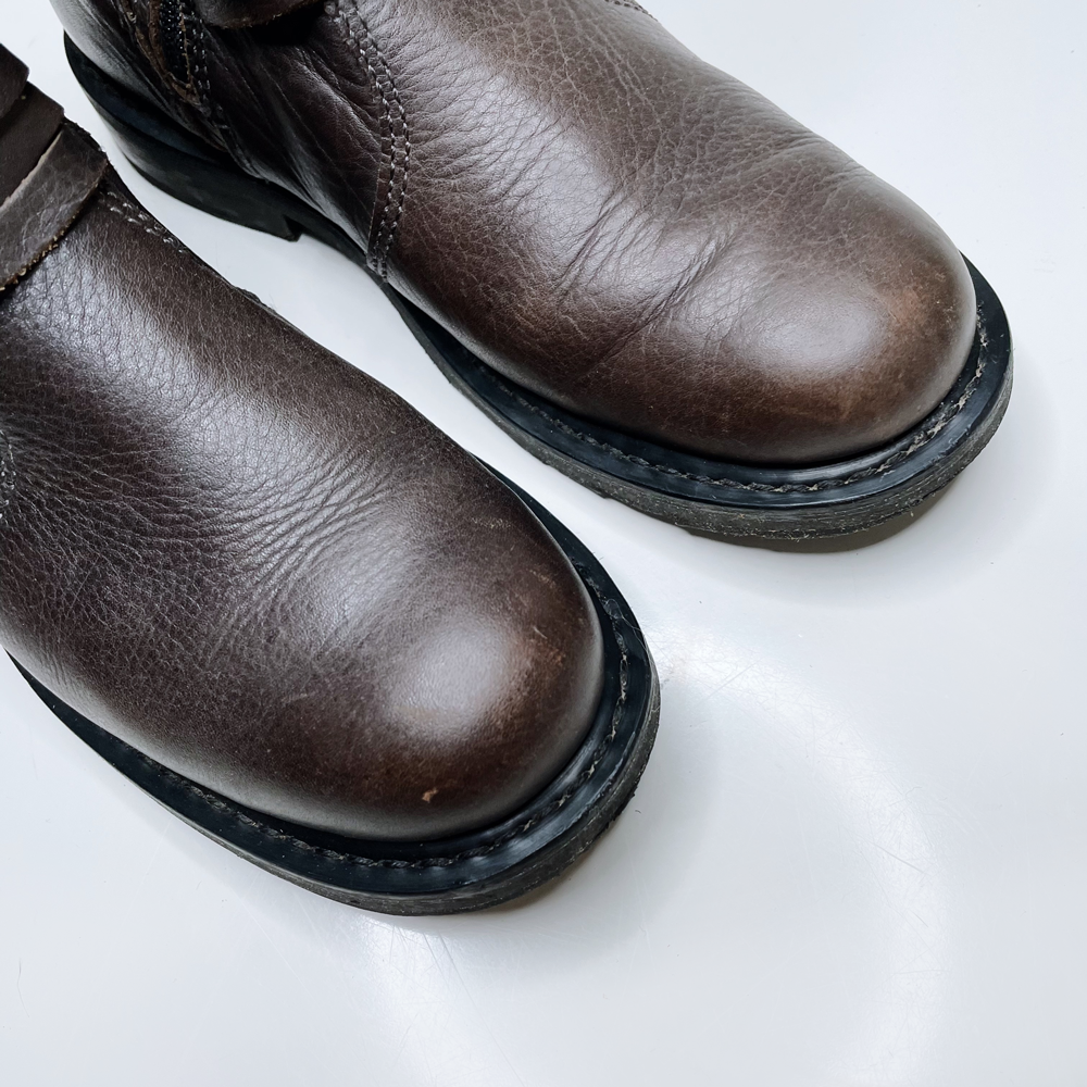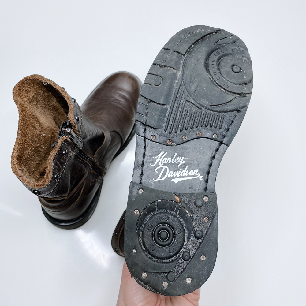 Item Description: These bad-a$$ leather boots from Harley Davidson feature a thick but supple leather upper, with strappy harness ankles and a studded top edge. Leather upper, rubber sole, zipper closure.