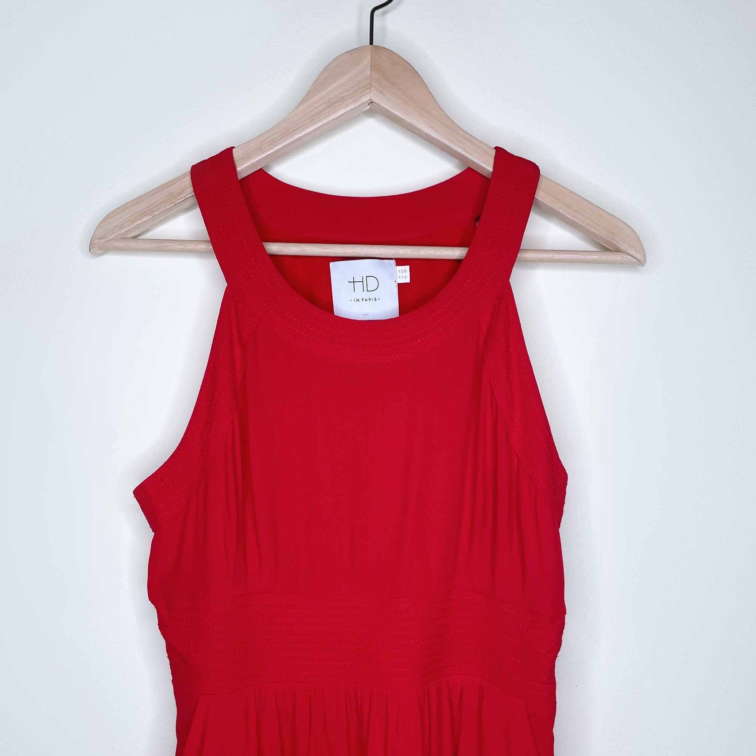 Item Description: This high neck halter dress dress from Anthropologie’s HD in Paris has a fit and flare silhouette with banded waistline, ruched stretch back and side pocked. Lined. 55% viscose 45% rayon