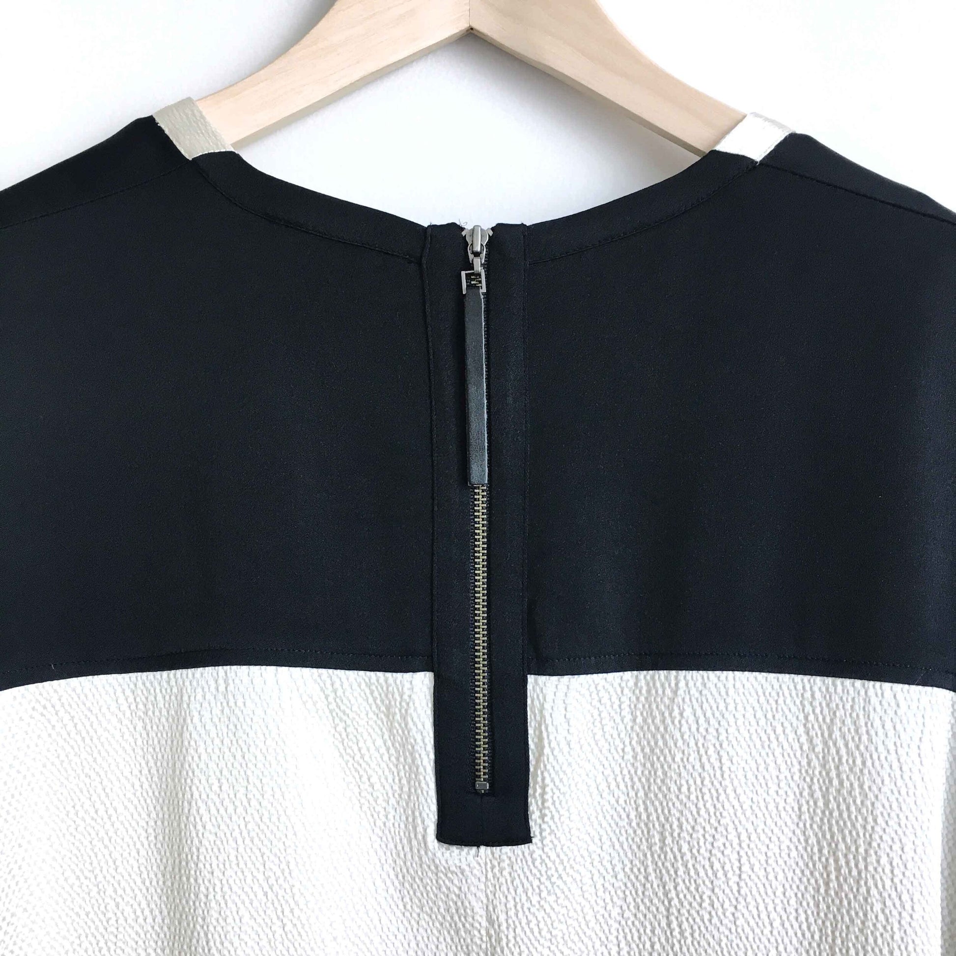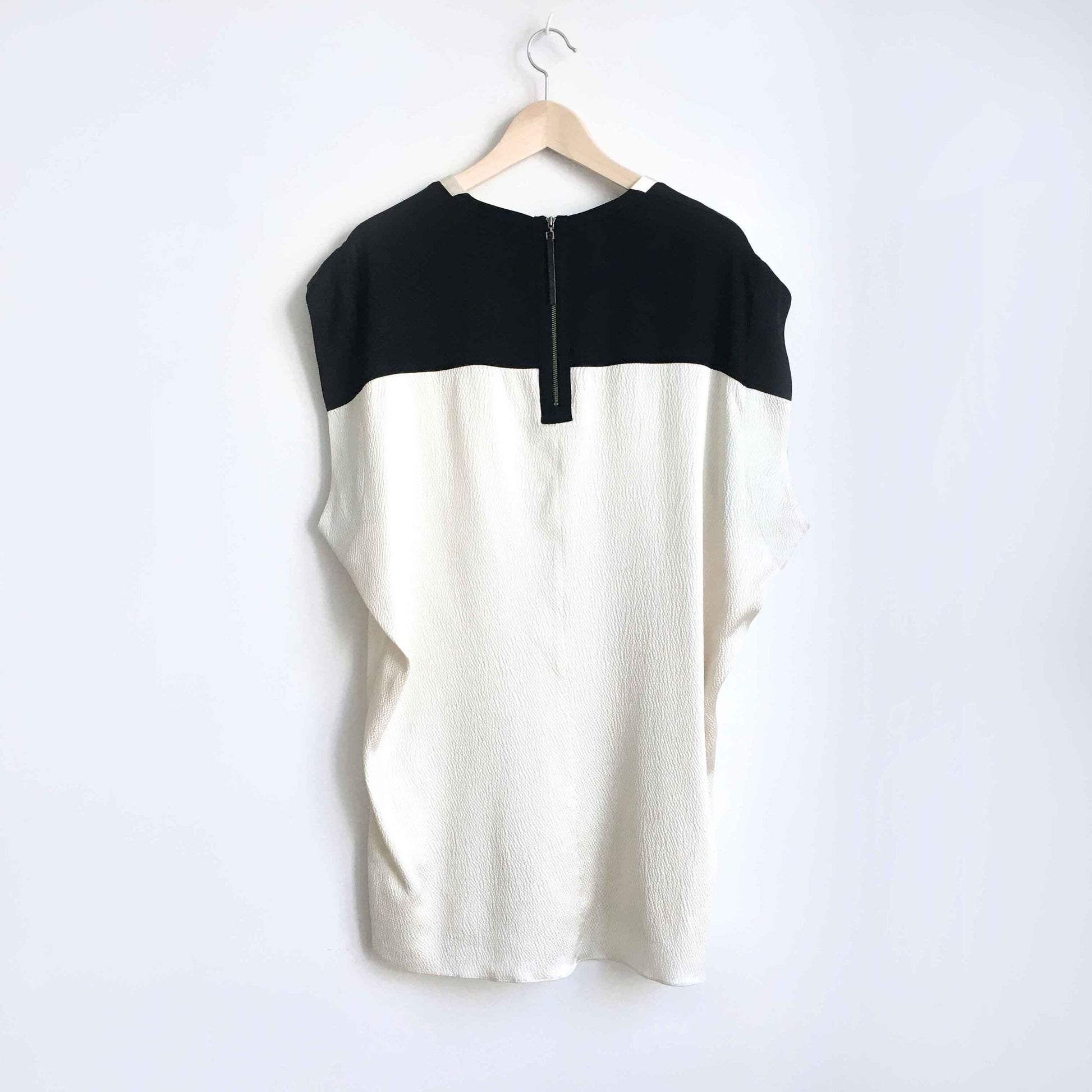 Item Description: This light gold and black colour block silk top from Helmut Lang features a crepe texture and zipper back. 93% silk 7% elastane