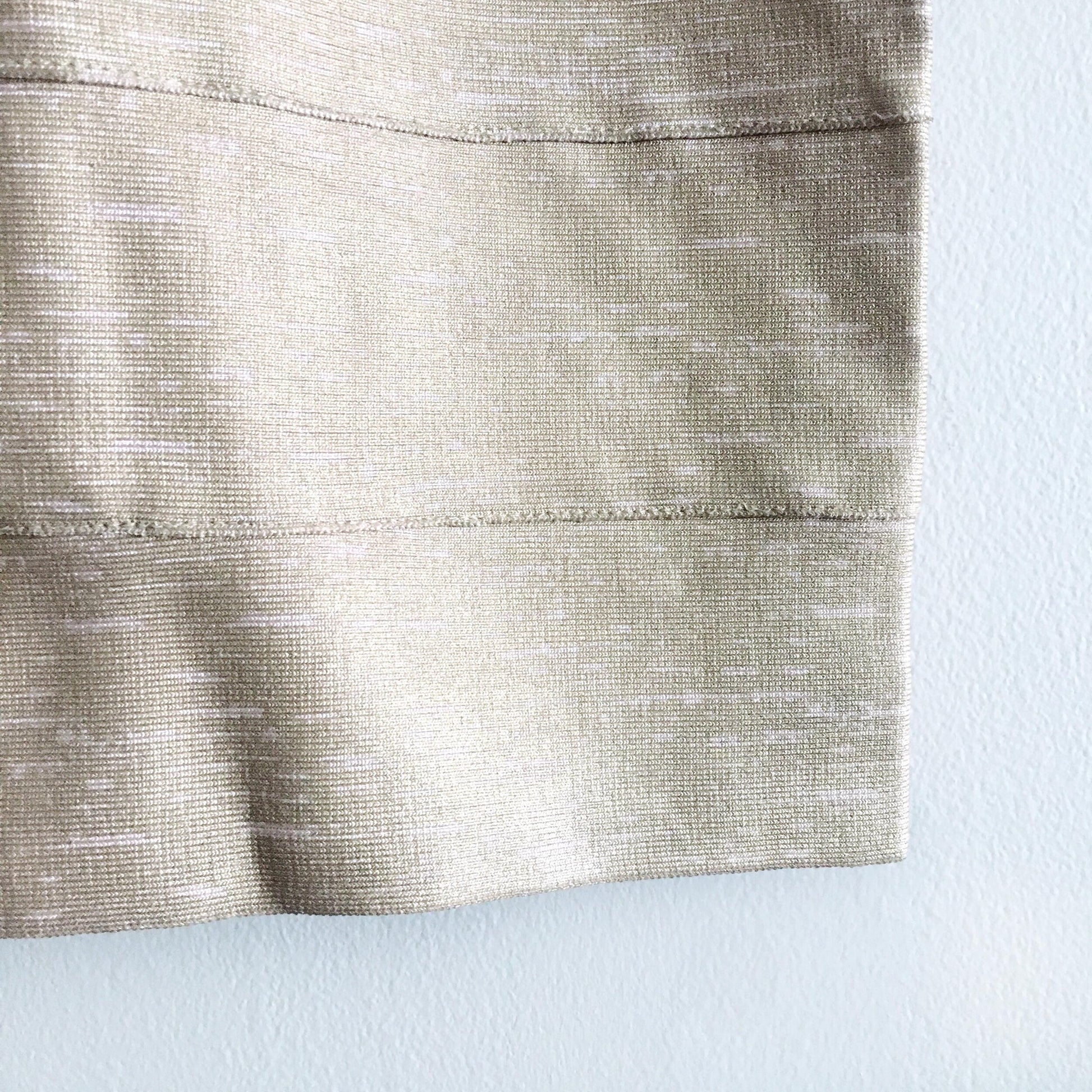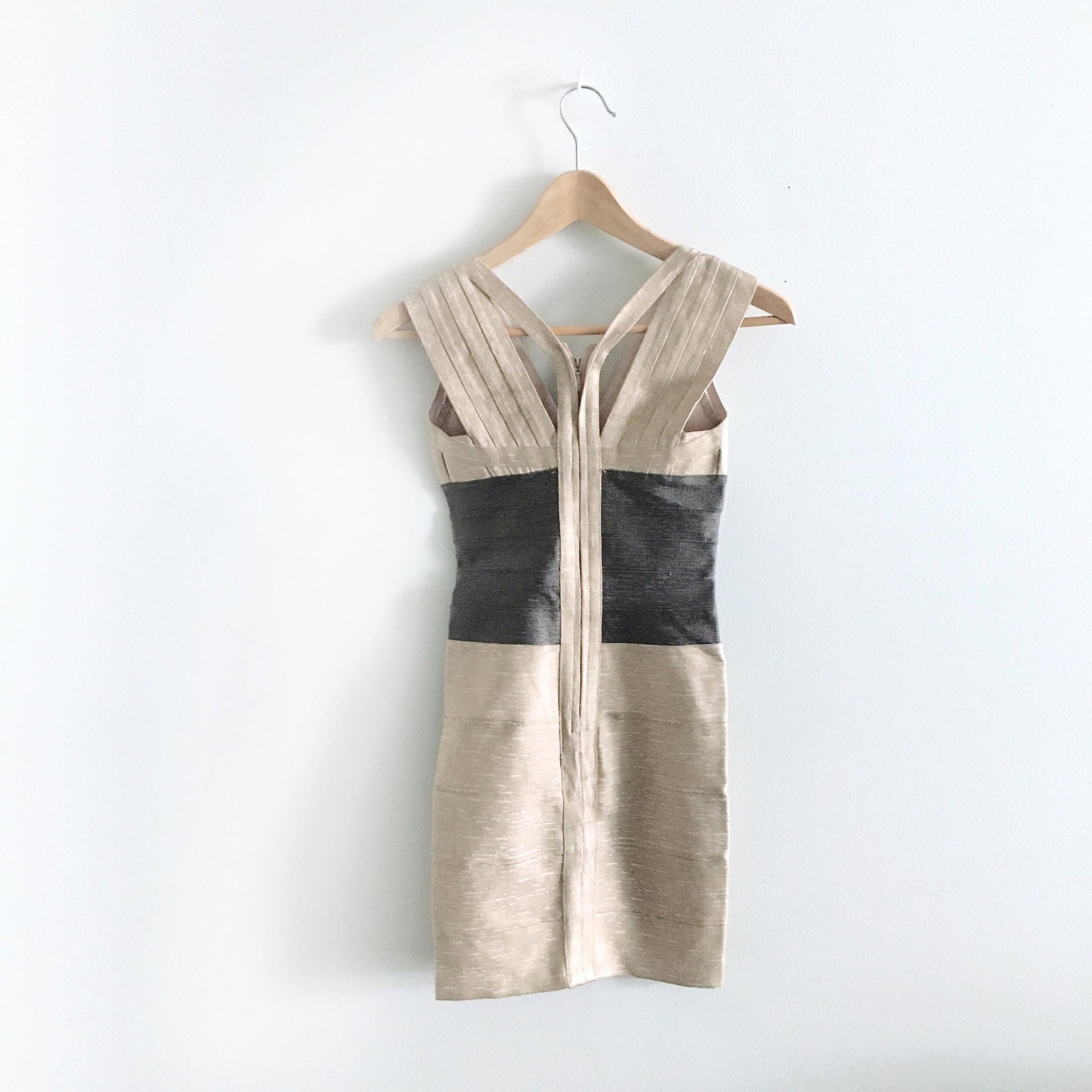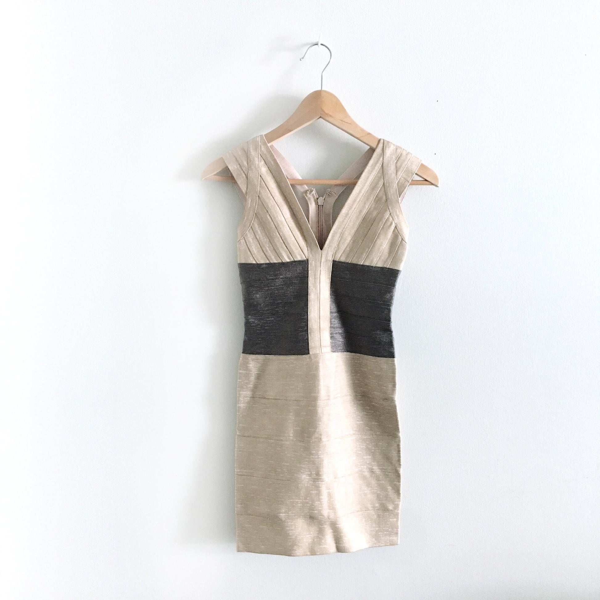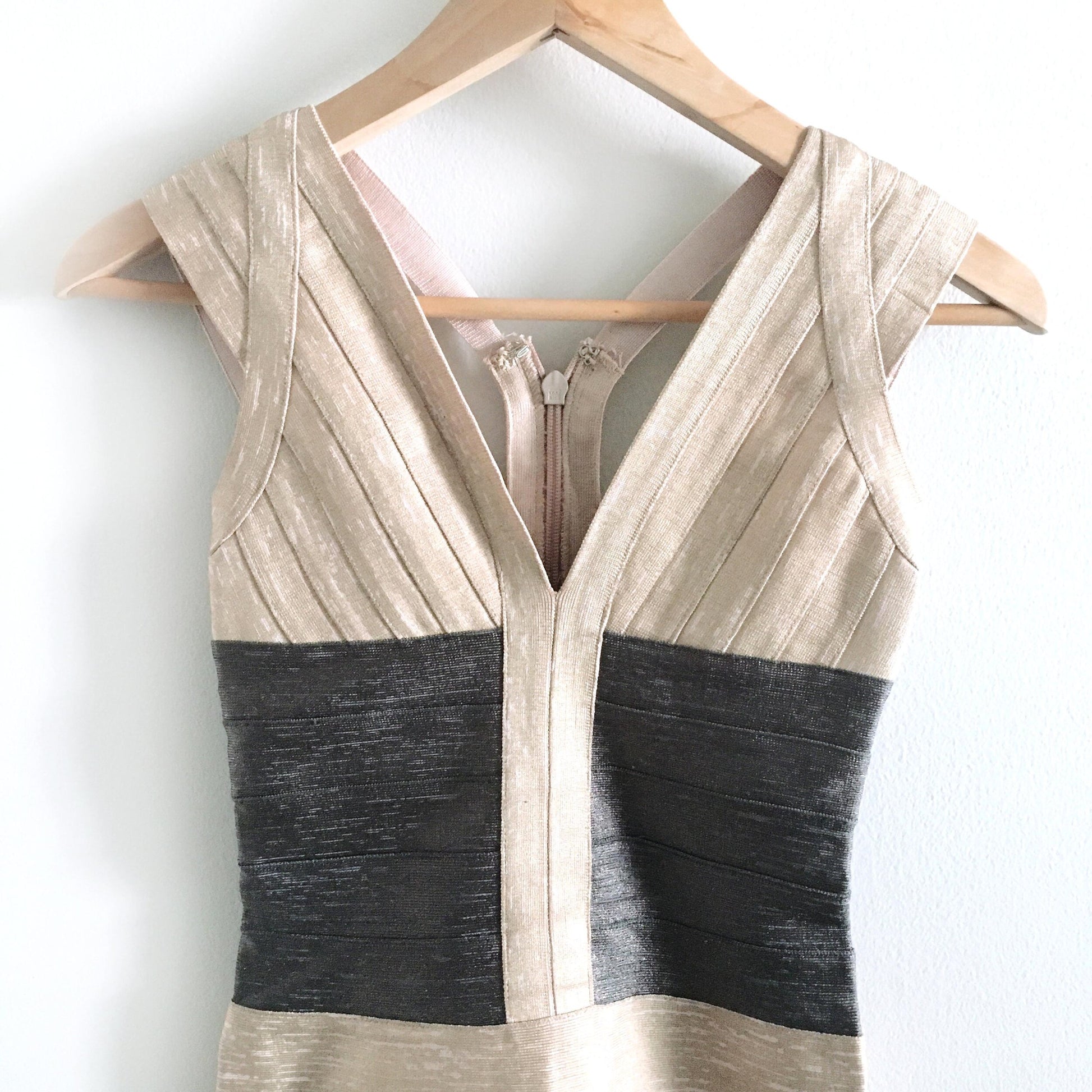 Item Description: Herve Leger outfits this bandage dress with a foiled effect on the colorblocked scheme. The end result is the iconic curve-contouring fit in a modern, high-shine look. V-neck line, cutout back. Back zipper.