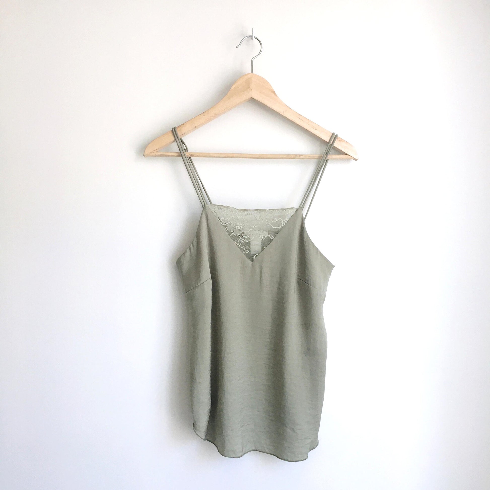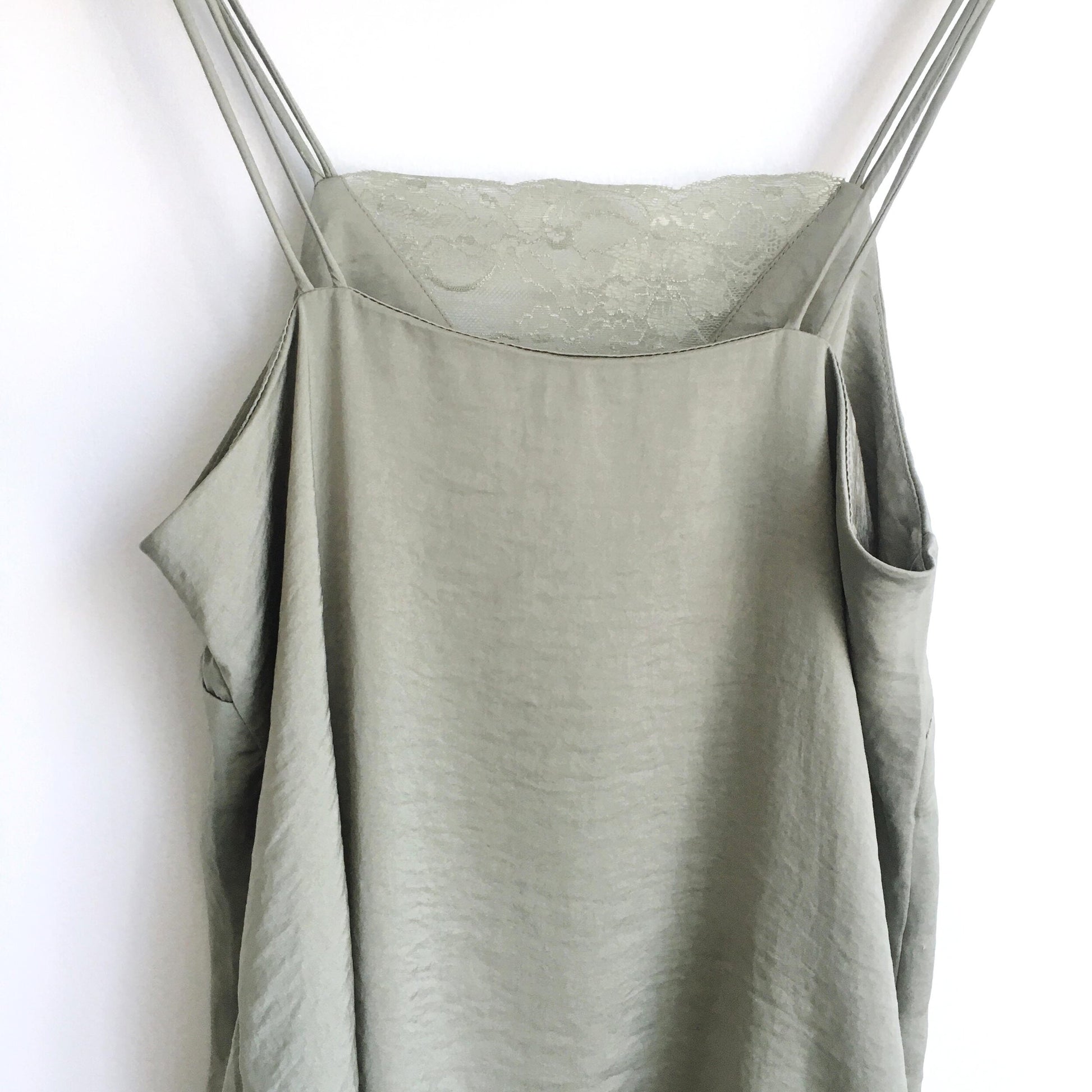 Item Description: This soft and feminine sage green satin cami from H&M features double straps and a lace v-neckline. 100% polyester