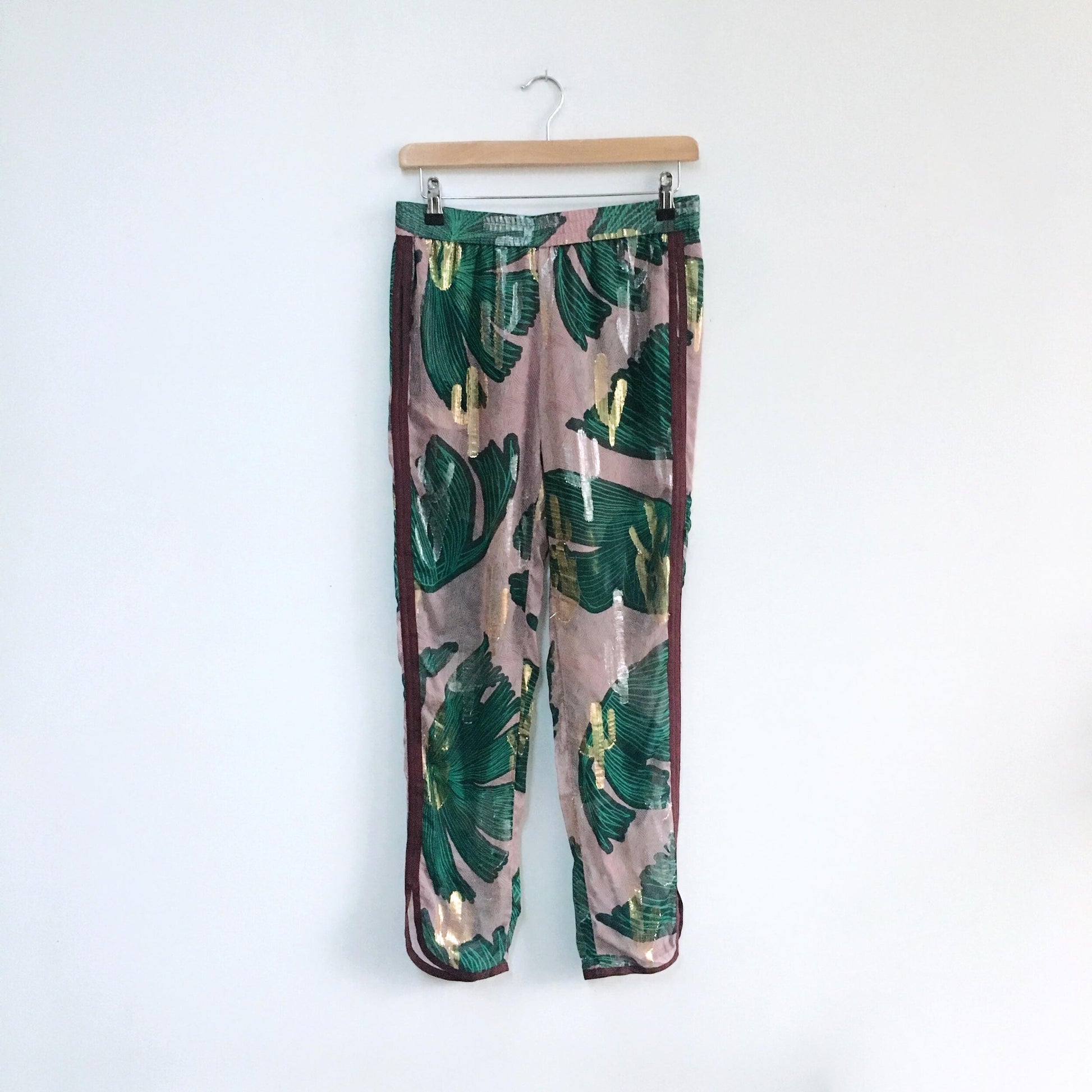 Item Description: These super rare silk chiffon pants from H&M’s Studio line S/S 2015 are in MINT condition. An overall sheen and tropical print is adorned with metallic cacti and a stripe down the sides.