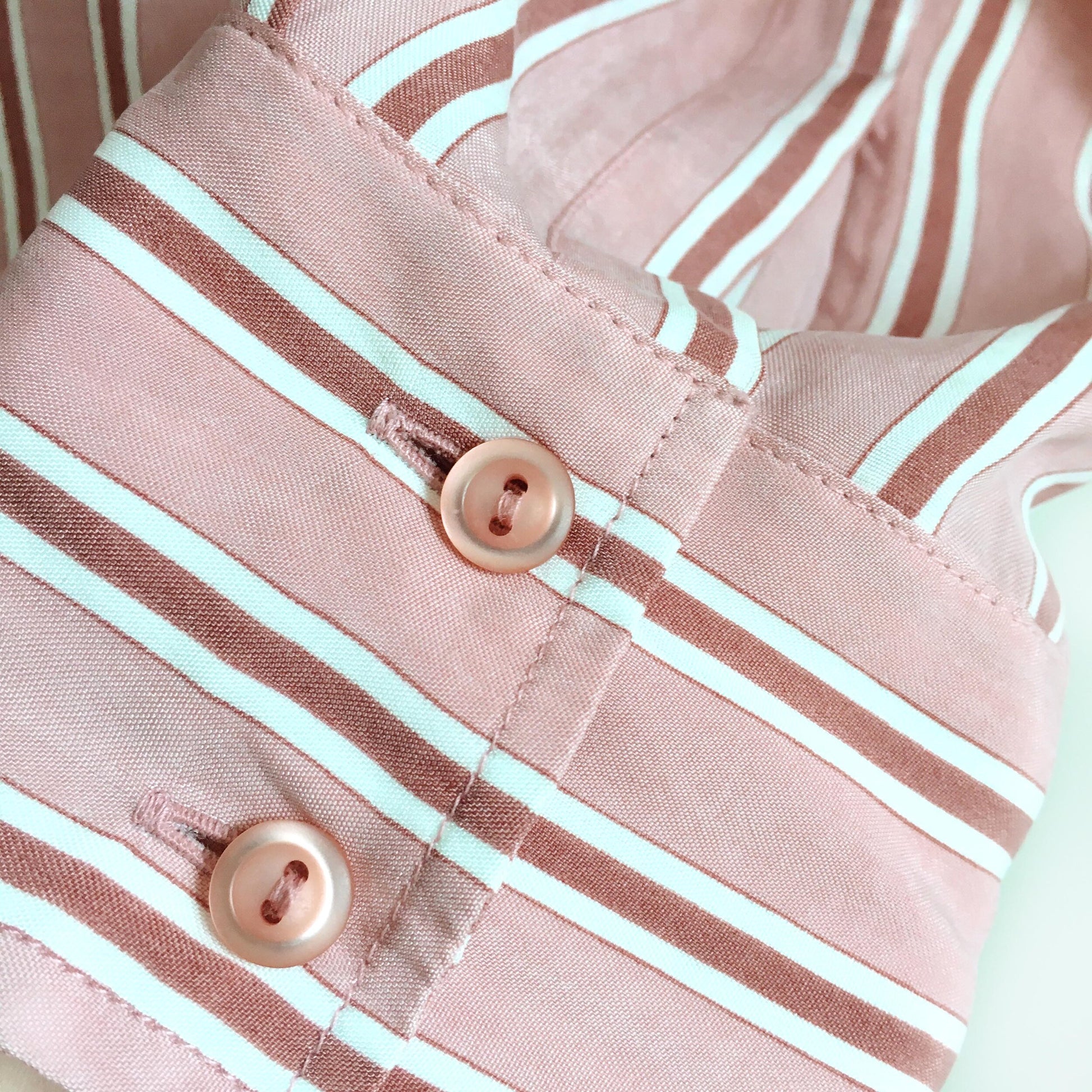Item Description: This pink, red and white striped button down shirt from HUGO Hugo Boss is made from 100% cupro - a soft but durable fabric with a sateen like finish. Featuring an open v-neckline and button cuffs.