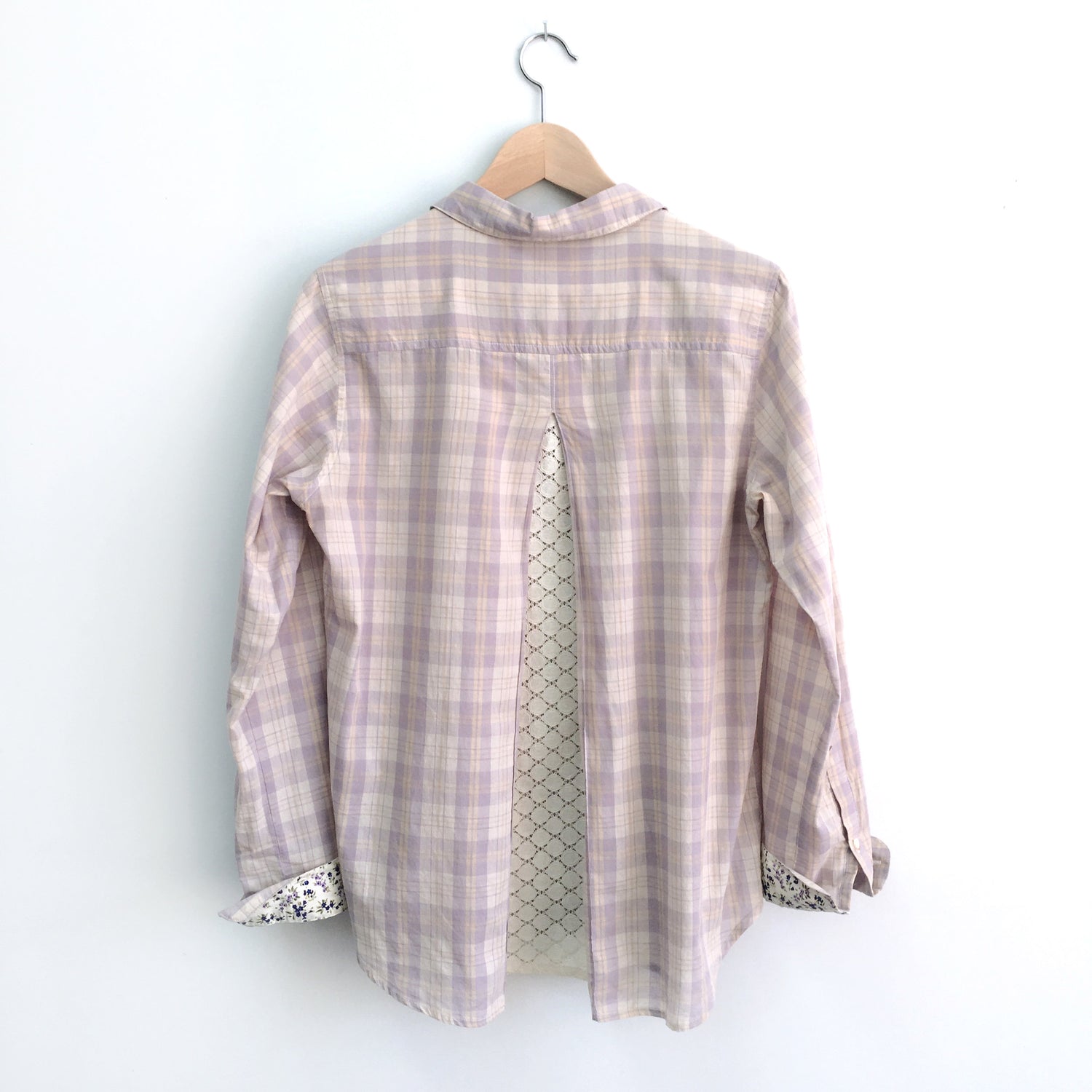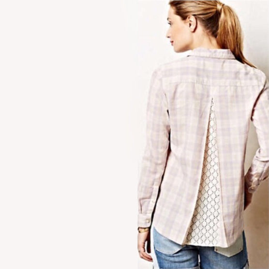 Item Description: This button up plaid shirt from Isabella Sinclair (Anthropologie) has a feminine twist, with a lace inlet on the back and floral accent fabric on the cuffs and neckline.