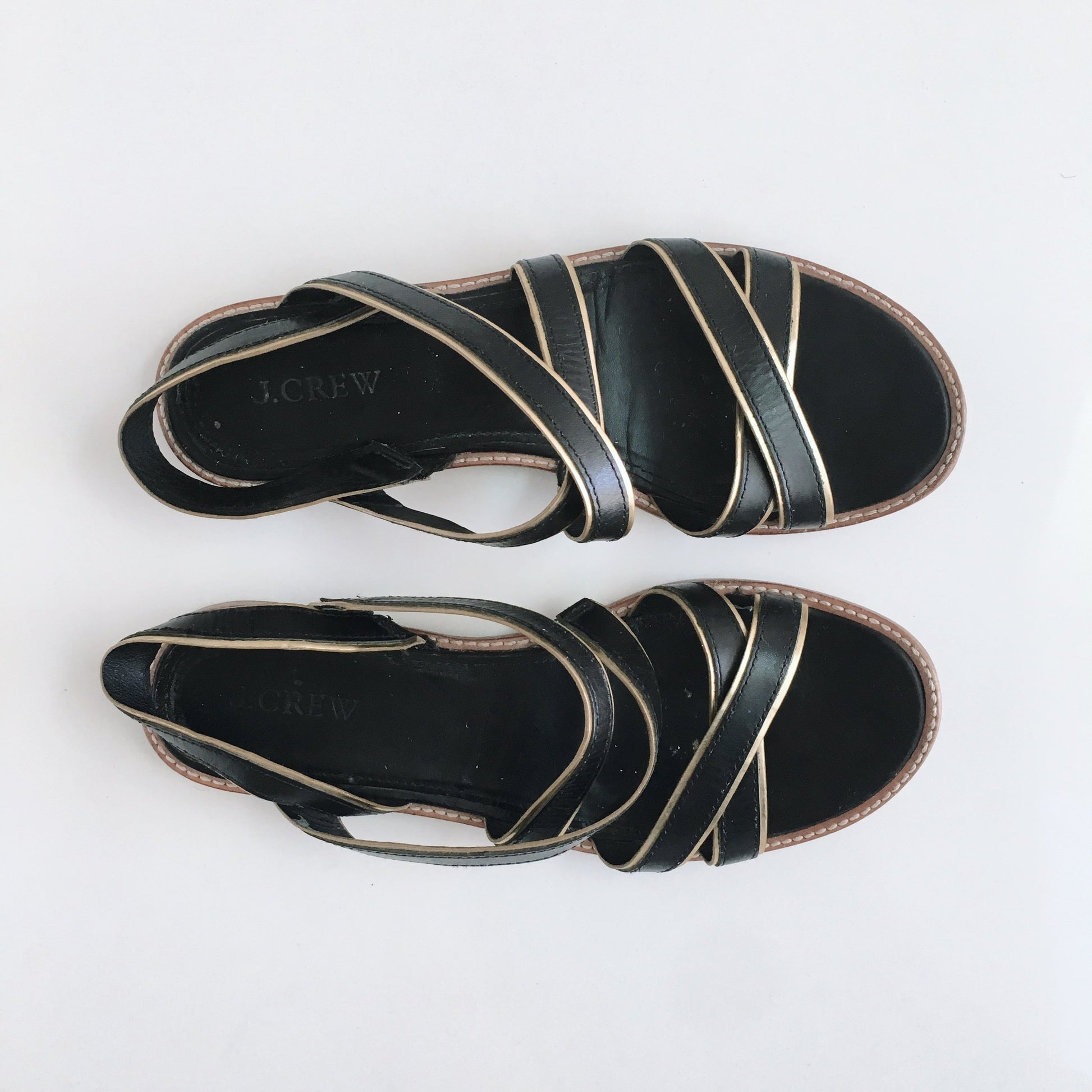 Item Description: Easy, strappy sandals from J Crew with a touch of metallic trim. Go ahead and put "pedicure" at the top of your to-do list. Leather upper and lining.