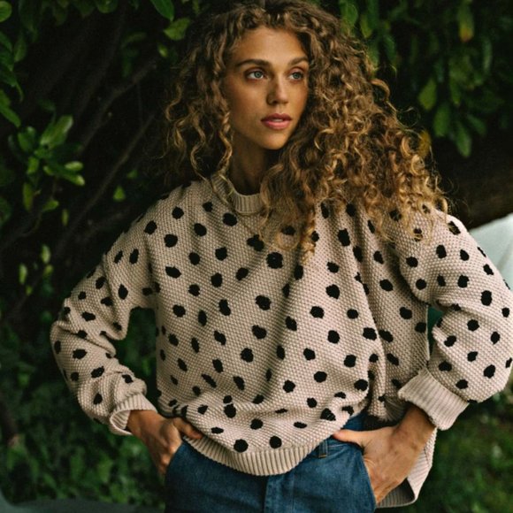 Item Description: Cozy up in this oversized, boxy pullover sweater from Jackson Rowe - with a curved hemline and crewneck and fun polka dots. 100% cotton