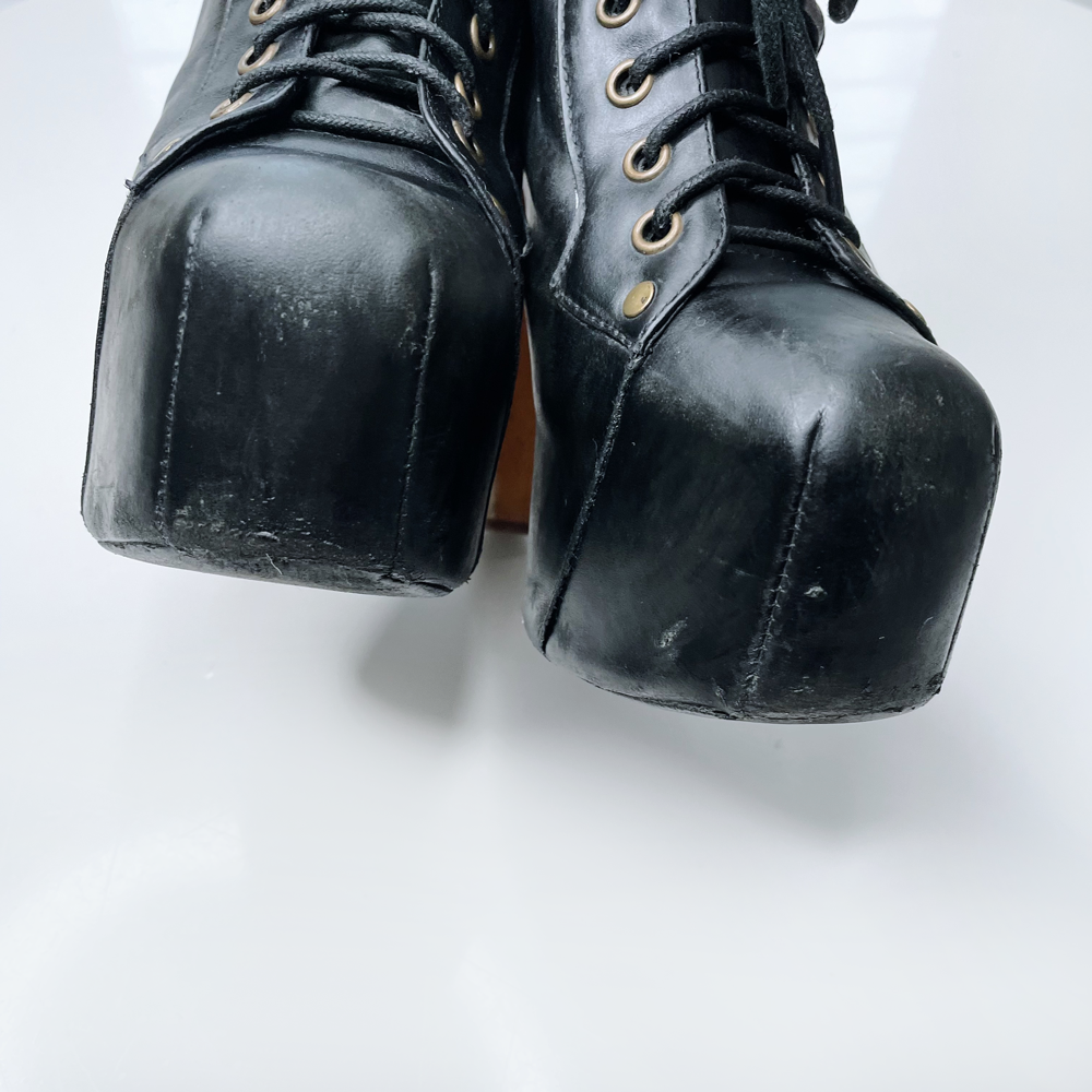 Item Description: As seen on GIRL BOSS, the iconic Jeffrey Campbell Lita boot features a rich leather with antiqued eyelets and corded cotton laces. Finished with a wooden heel with a wrapped platform and rubber sole. 100% leather upper