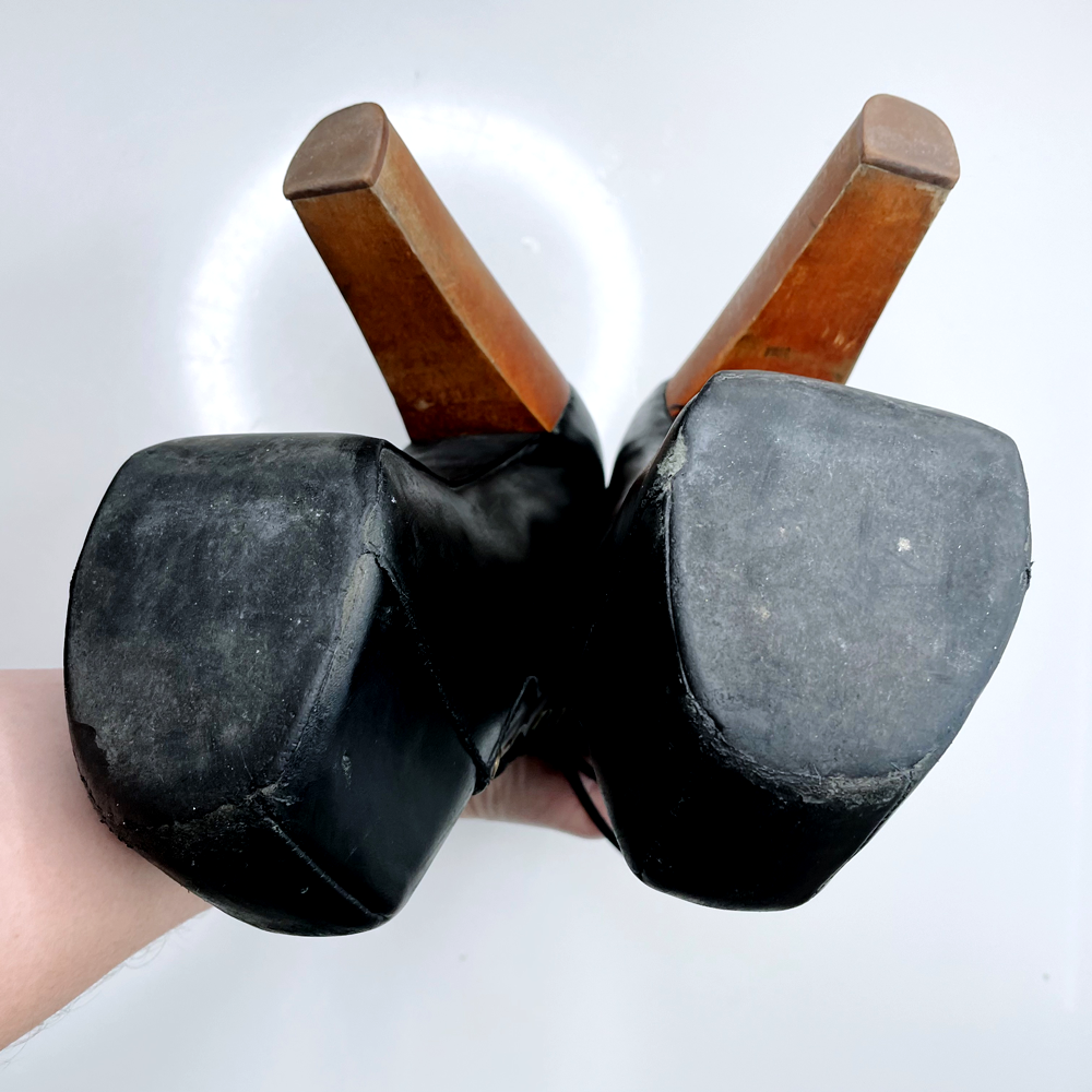 Condition: GOOD 8/10 - gently used, visible wear on wood heel exterior and minor scuff marks on toes