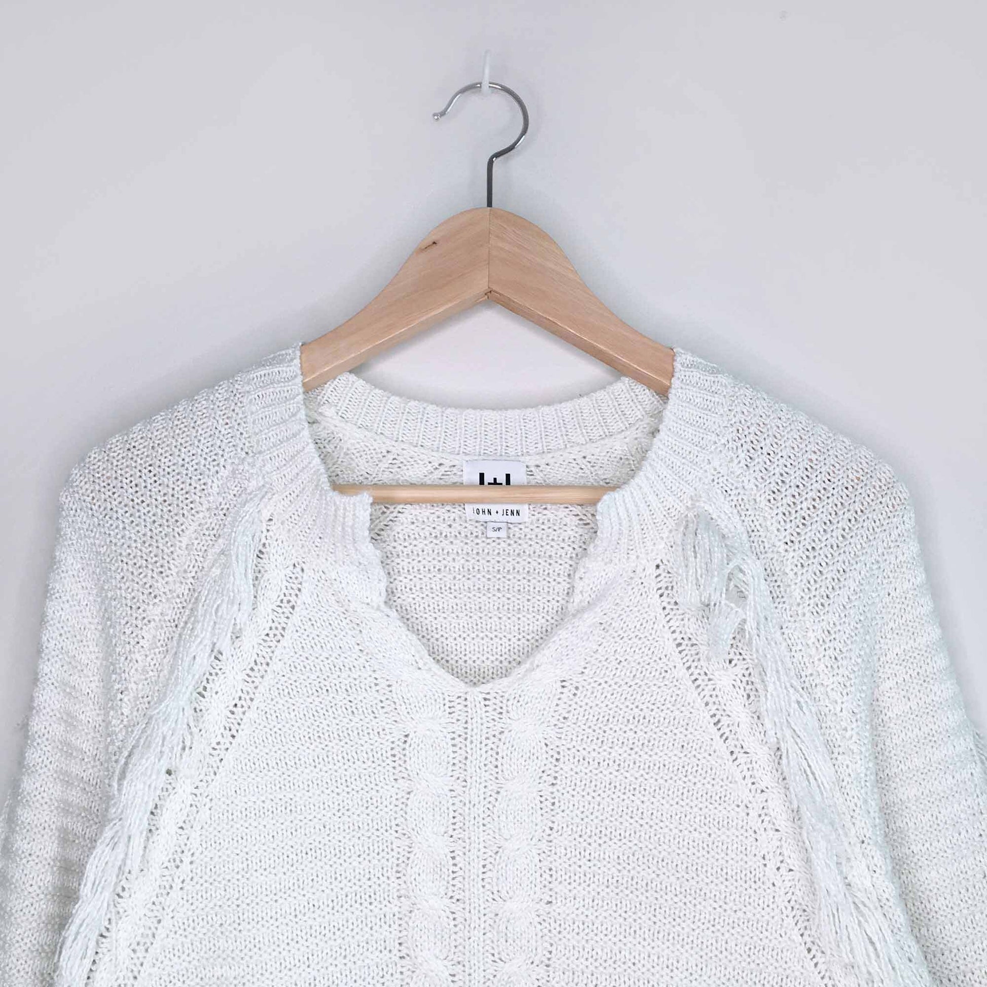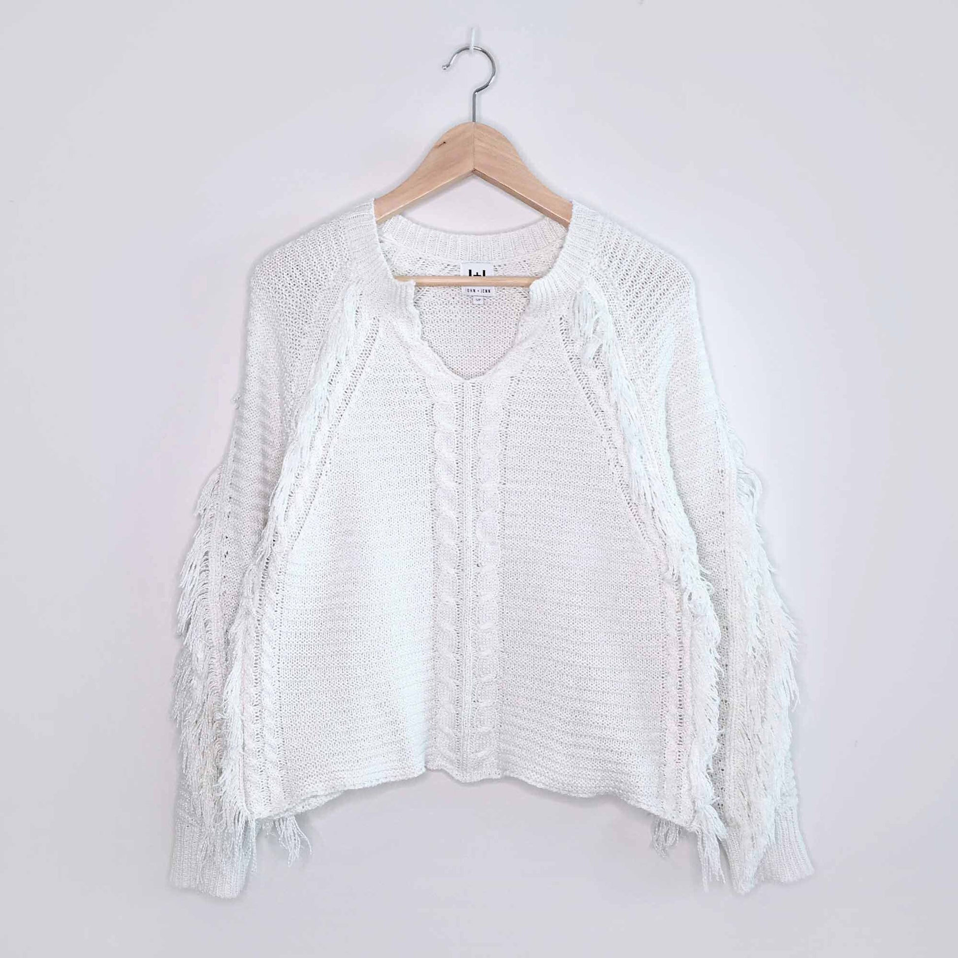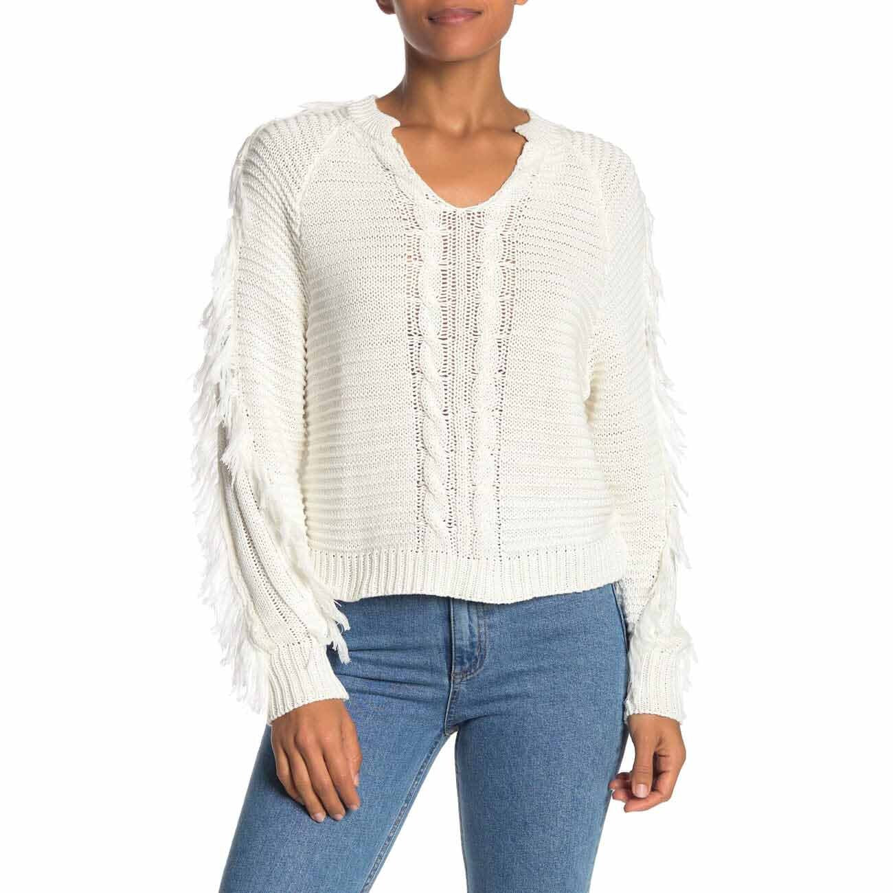 Item Description: This cable knit sweater from John + Jenn features a split crew neckline, and fringe details down the arms. 100% polyester