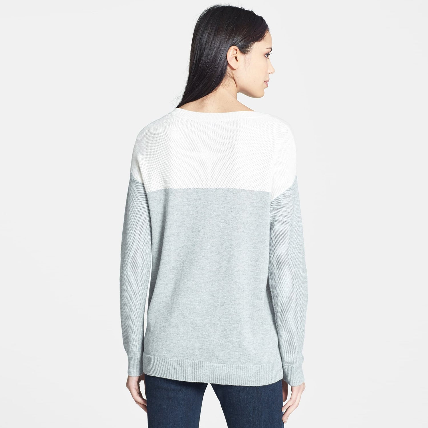 Item Description: A whisper of cashmere softens a drop-shoulder sweater crafted with a contrast yoke and scoop neckline. 40% nylon 35% rayon 20% wool 5% cashmere